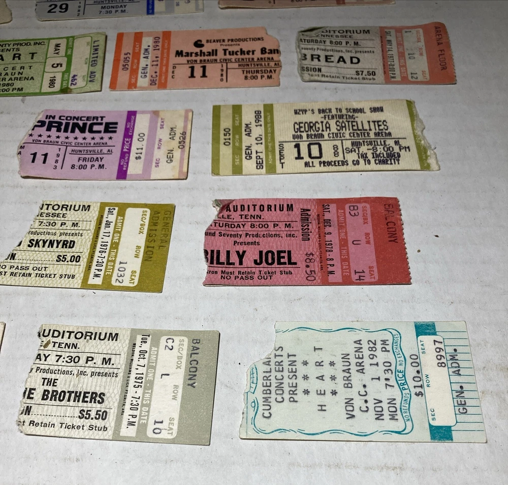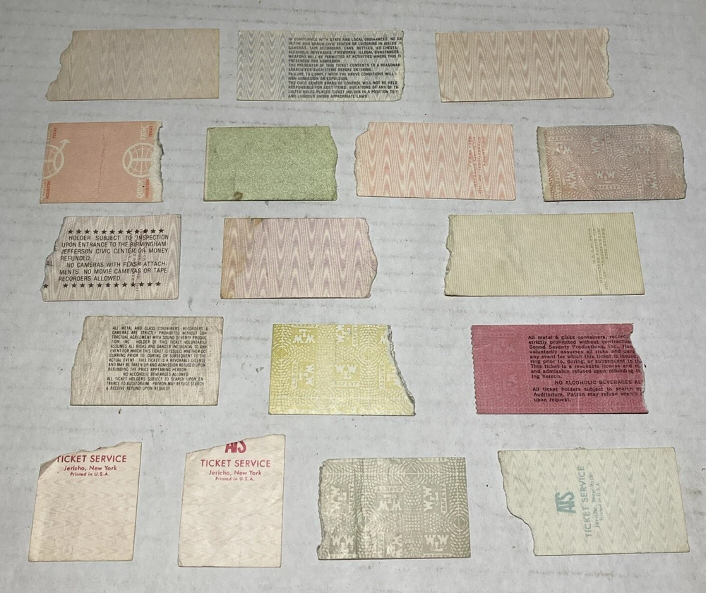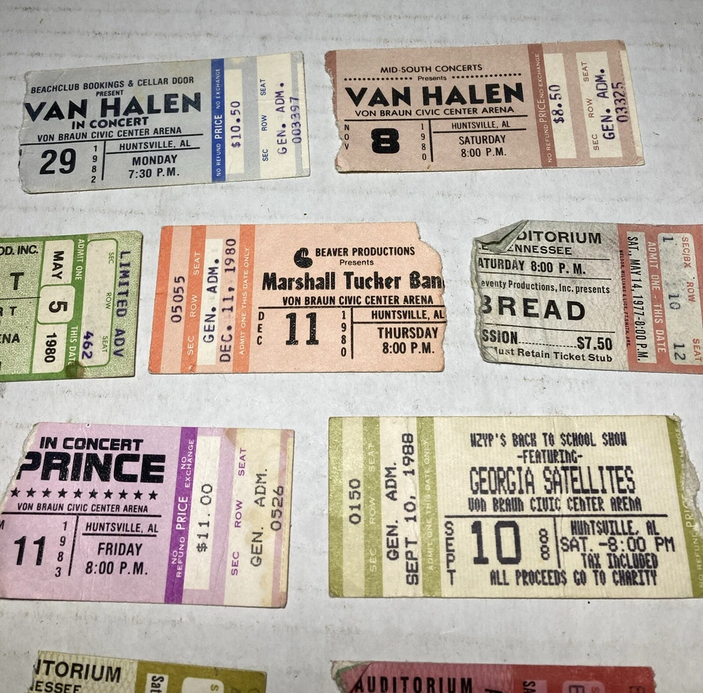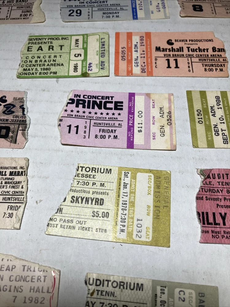 This vintage collection of concert ticket stubs takes you back to the glory days of rock music in the 70s and 80s. Featuring performances by legendary acts such as Van Halen, Prince, Cheap Trick, Heart, and ZZ Top and more! This is a must-have item for any music memorabilia collector. Each ticket stub is an original piece, making this collection a true gem for fans of classic rock. The lot will ship out safely and securely the same or next business day.