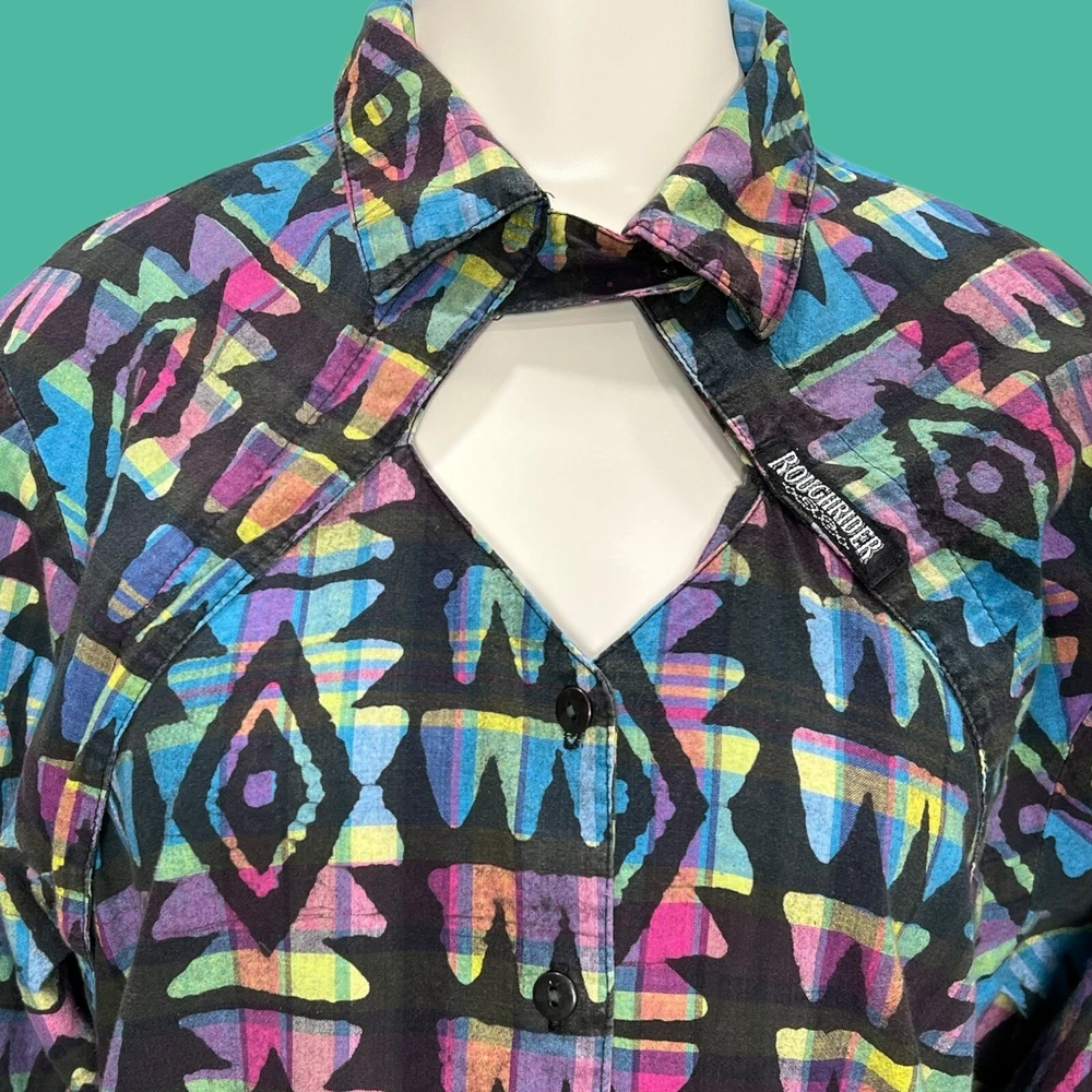 RoughRider By Circle T Plaid Western Rodeo Cowgirl Peek a boo Button Down Size 3/4 Measurements laying flat: Shoulder to shoulder: 16” Bust: 18” Sleeve length: 23” Shoulder to hem: 22” #R55