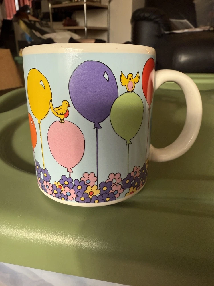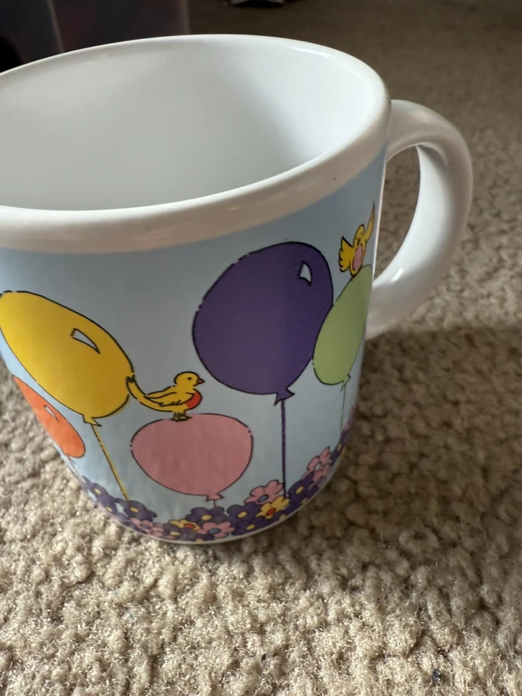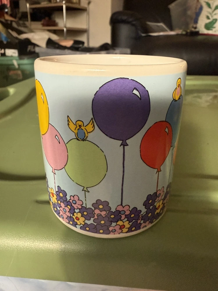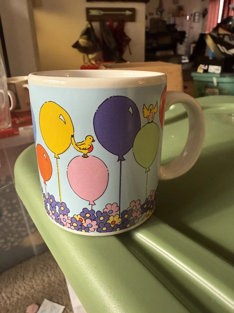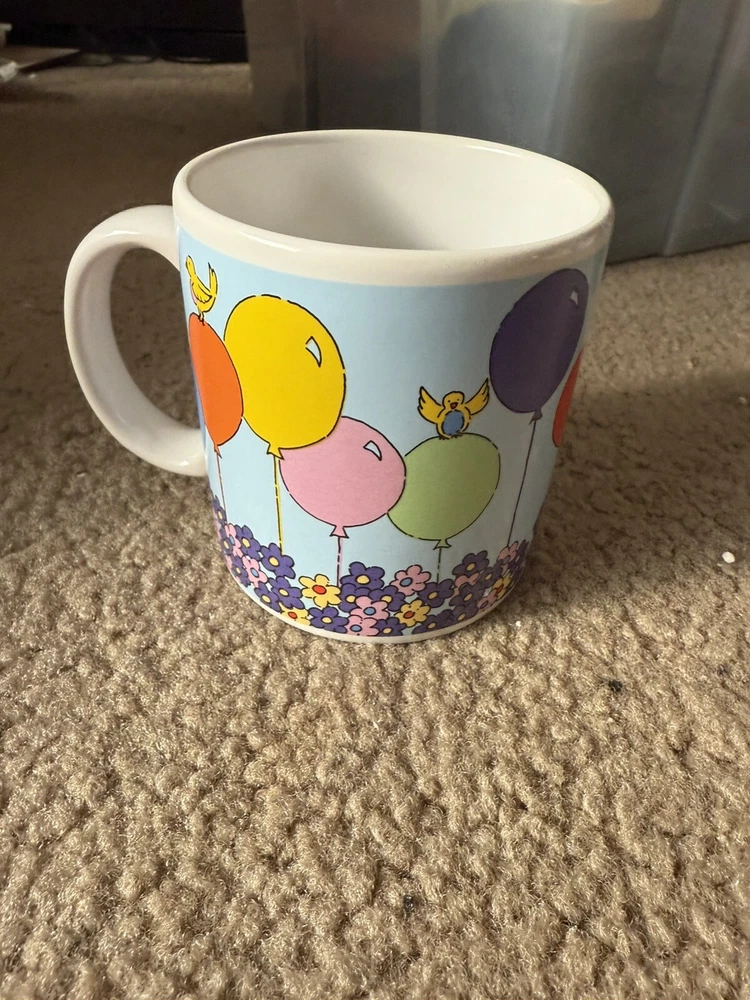 In great condition, no chips or cracks. Please see all photos as they are part of my description for the product. Please message me with any questions as I do not accept returns on this item. Celebrate your birthday with a touch of vintage charm using the Russ Berrie & Co Happy Birthday Mug. This colorful ceramic cup features a playful balloons pattern, along with florals and birds, that brings a cheerful vibe to your beverage experience. It's a versatile 14oz mug that's perfect for enjoying hot or cold drinks, making it a delightful addition to any birthday celebration.