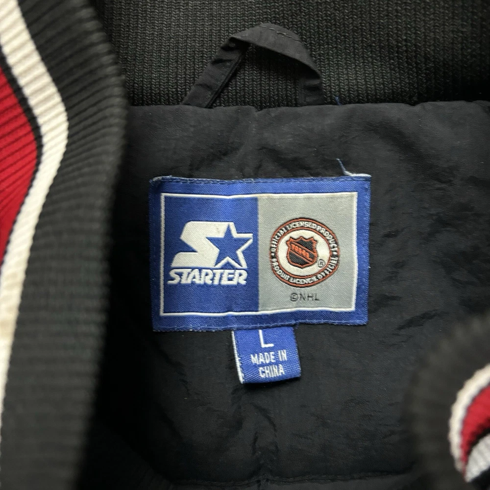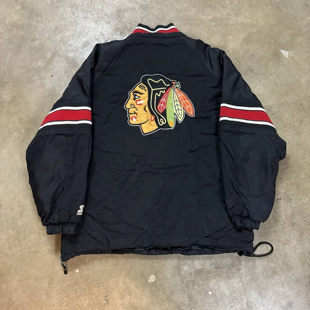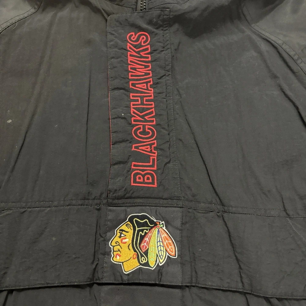 Vtg Starter Chicago Blackhawks 1/2 zip Puffer Jacket embroidered Blackhawks down zipper and logo big logo on back Size: Large Length: 29 in. Pit to Pit: 24 in. Flaws: none