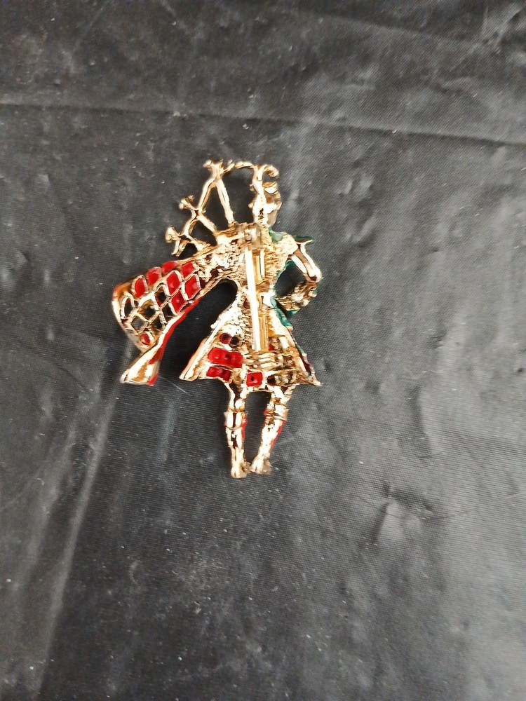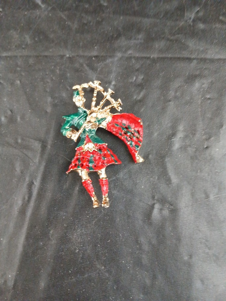 The Vtg Scottish Bagpiper Brooch is a vintage accessory that features a charming design of a bagpiper, likely with a Scottish theme. This brooch is a unique piece of jewelry that can be worn as a pin on clothing or accessories to add a touch of history and heritage to the wearer's ensemble. Perfect for those who appreciate vintage and antique jewelry, this brooch is a timeless addition to any collection.