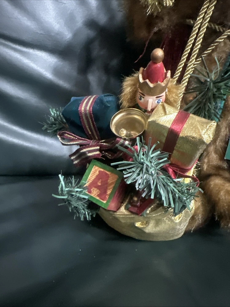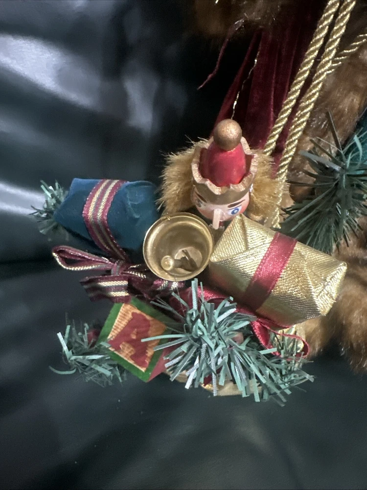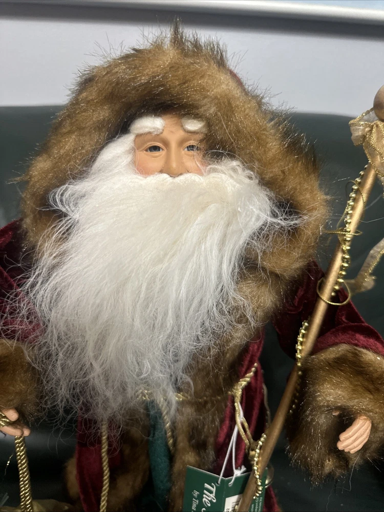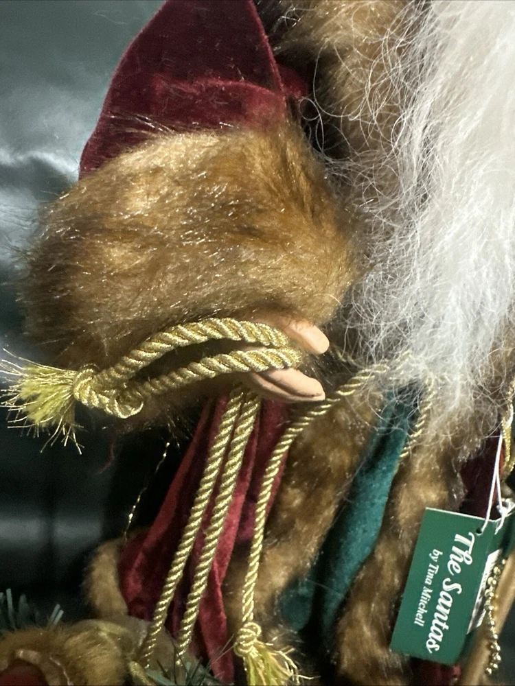 This large, handmade Southwest Ethnic Santa figure features a unique 3D effect and textured finish. The Santa Claus character is depicted in a figural style with a real fur beard and a dreamcatcher. The item is hand-painted and made of mixed materials including wood, plastic, and fabric. It is designed with an ethnic theme and is part of the Southwest Frontiersman collection, showcasing art, wildlife, and seasonal elements.