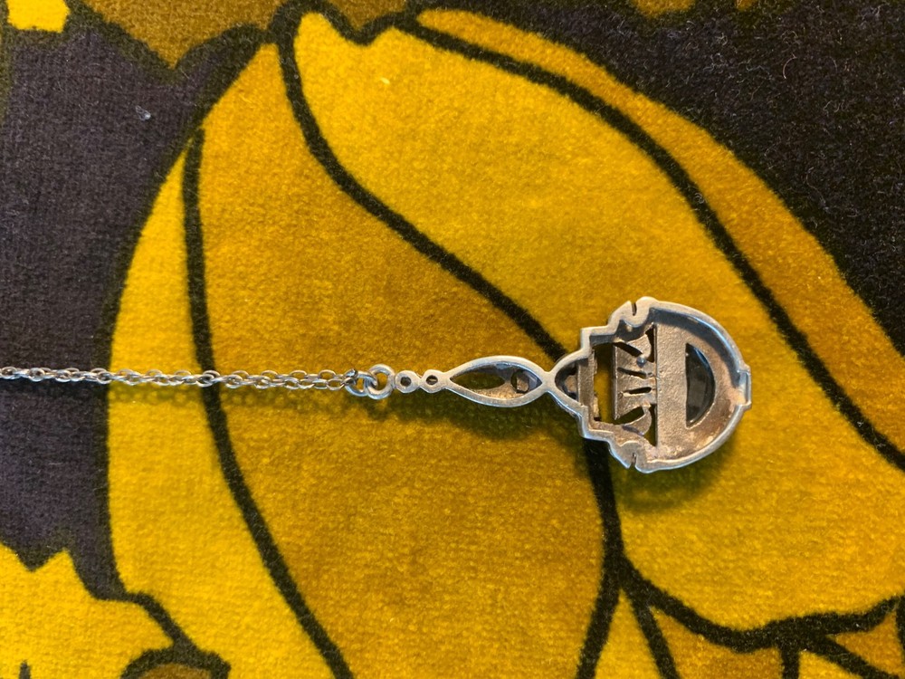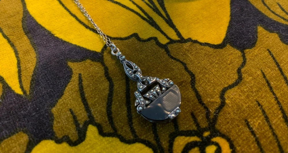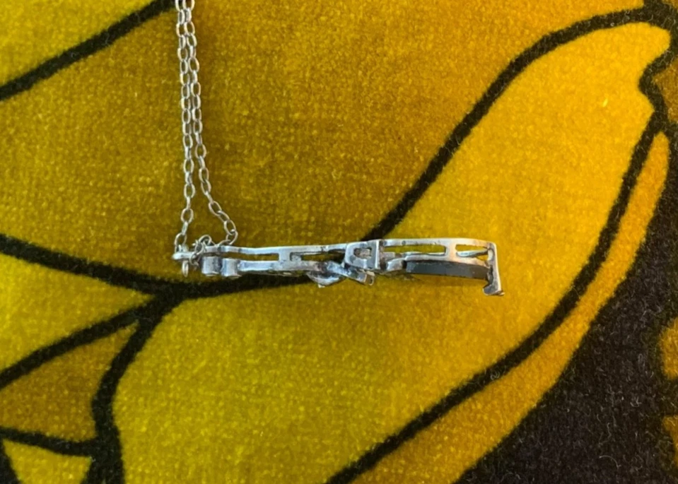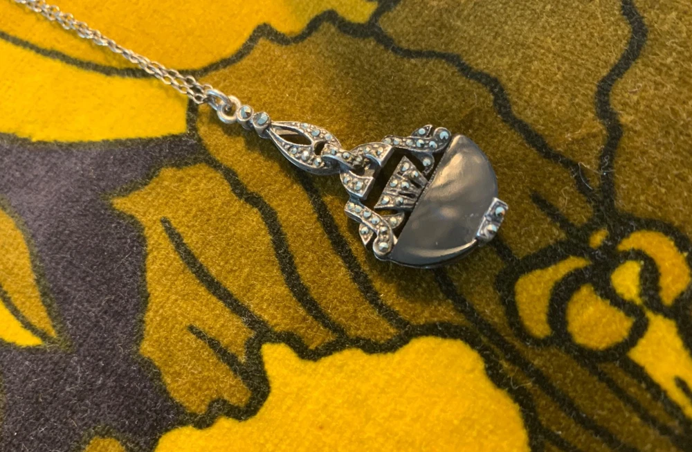 A striking vintage necklace featuring a beautifully detailed Art Deco–inspired pendant with genuine black onyx and marcasite set in silver-tone, likely sterling silver, consistent with similar age pieces. The elegant design evokes the 1920s–40s era with delicate milgrain and filigree elements, all in very good vintage condition. Material: Chain is s terling silver, pendant no mark but likely silver too. Gemstones: Black onyx (or black glass) with marcasite accents Pendant size: Approx. 1.25" (including bail) Chain length: ~18" sterling silver fine link chain Closure: Spring ring Era: Art Deco or Mid-century vintage Art Deco revival styling Condition: Very good vintage condition; light patina consistent with age A timeless, collectible piece, perfect for vintage jewelry lovers or Gatsby-inspired styling.