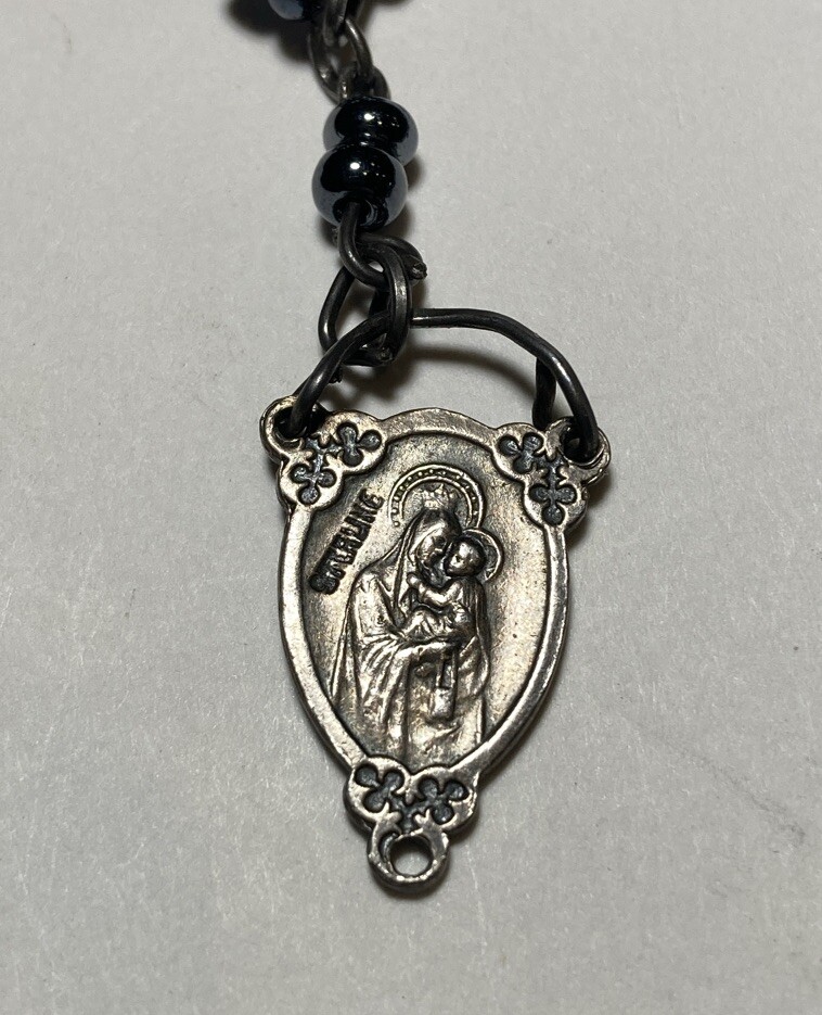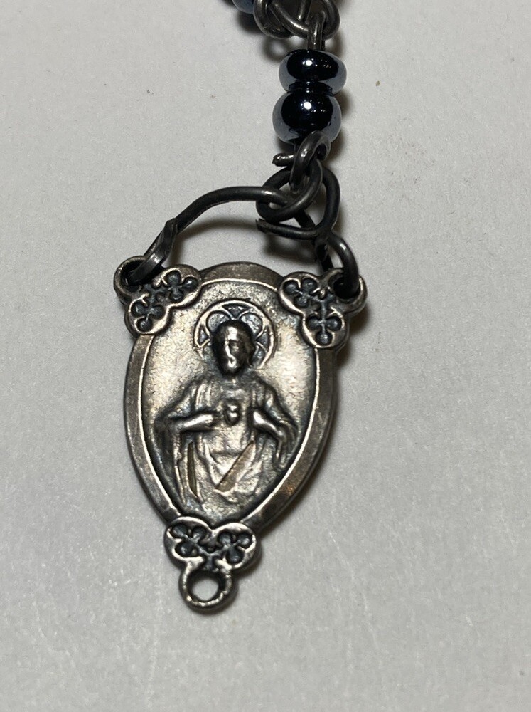 The rosary is missing the cross pendant. The charm on the necklace is marked sterling. The item will ship out safely and securely the same or next business day.