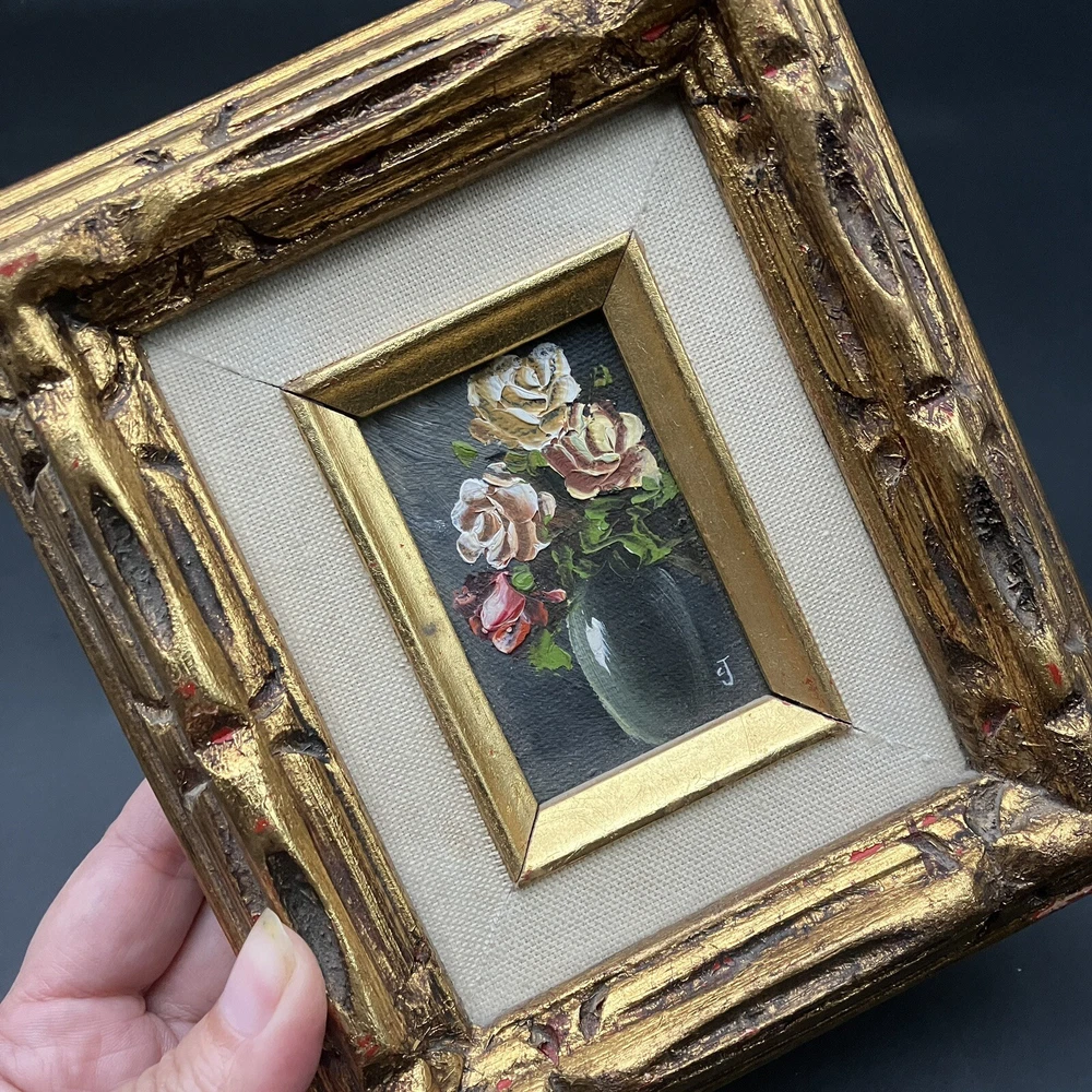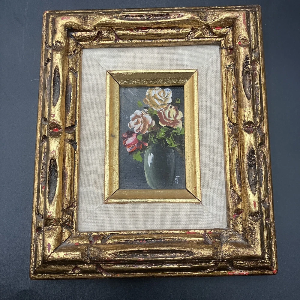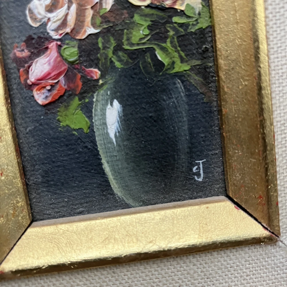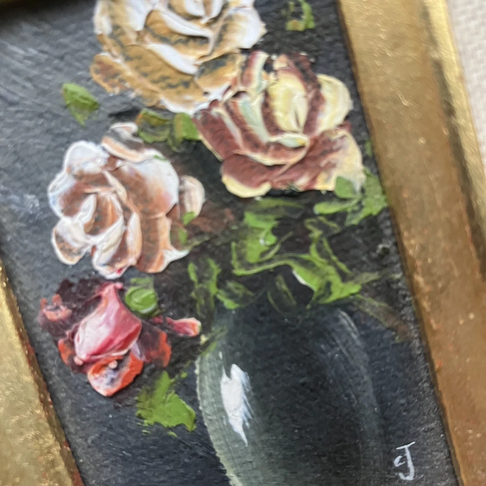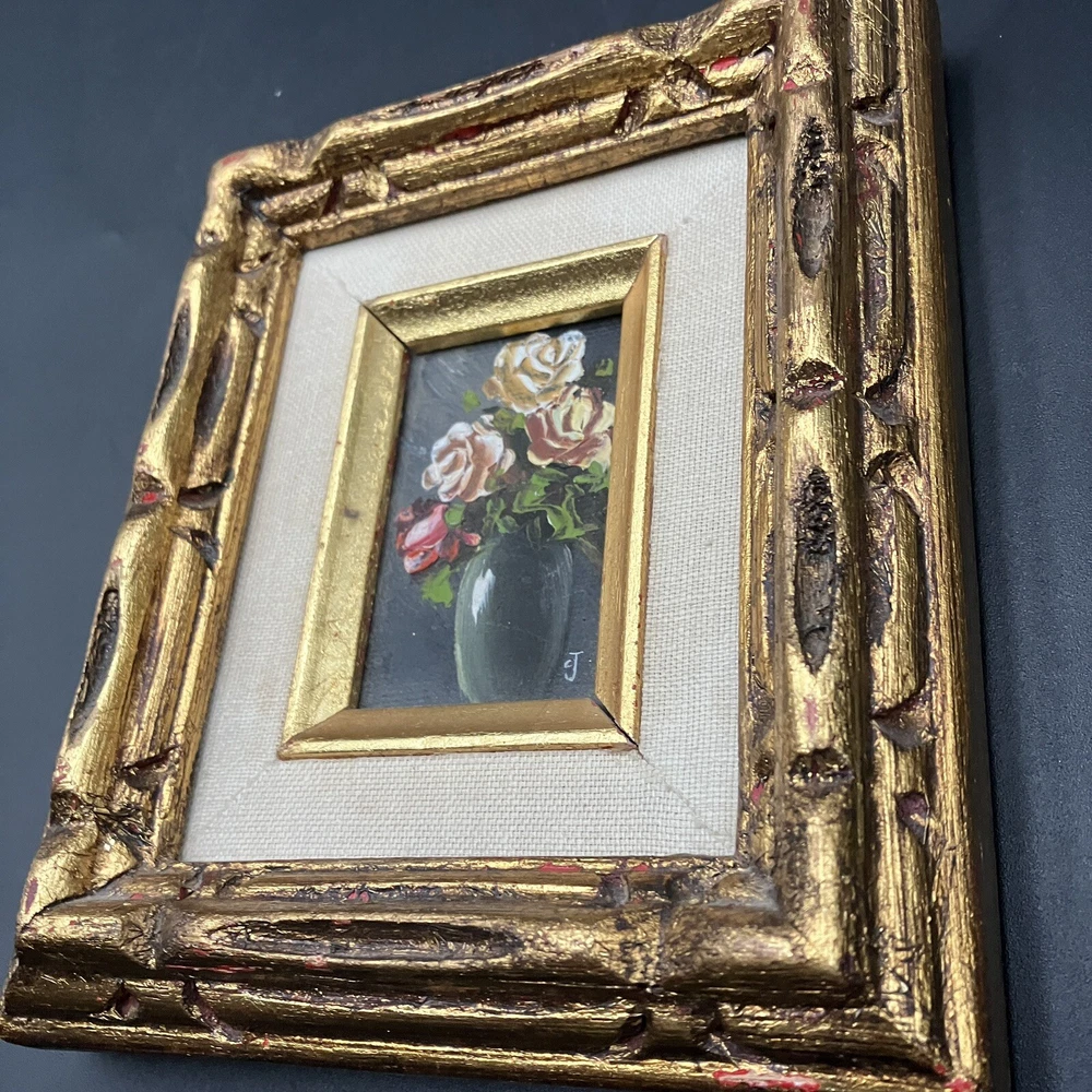 Enhance your space with a touch of vintage charm through this original miniature oil painting on canvas. The piece features a serene still life arrangement of roses, capturing the essence of floral beauty in a compact 5-inch length and 7-inch height. Framed and ready to display, it's a subtle yet elegant addition to any room. Created by CJ, a signature confirms the artist's touch, adding authenticity to this contemporary work from 1970 to 2020. Its small size makes it a perfect fit for intimate spaces, while the handmade nature of the piece underscores its uniqueness. This floral-themed painting is a tranquil homage to the still life tradition, sure to bring a cozy vibe to your home decor. ****SHIPS NEXT BUSINESS DAY***