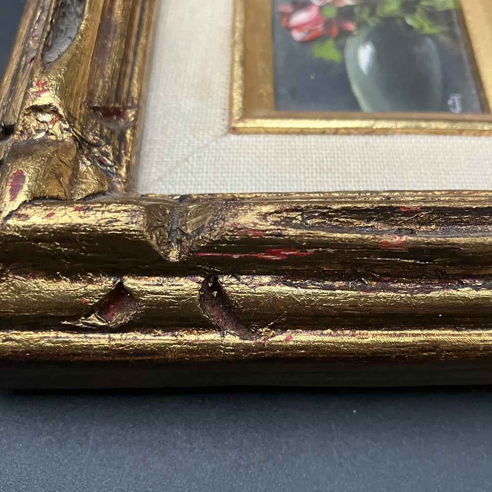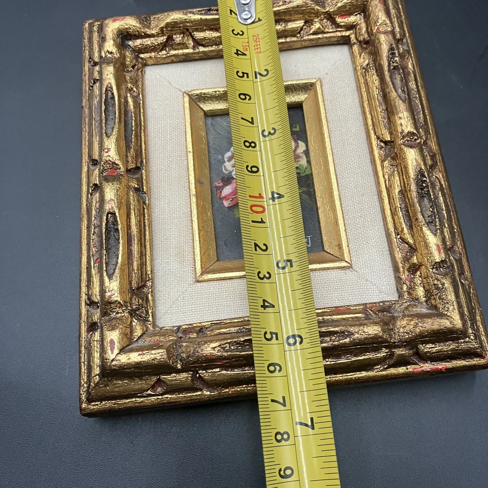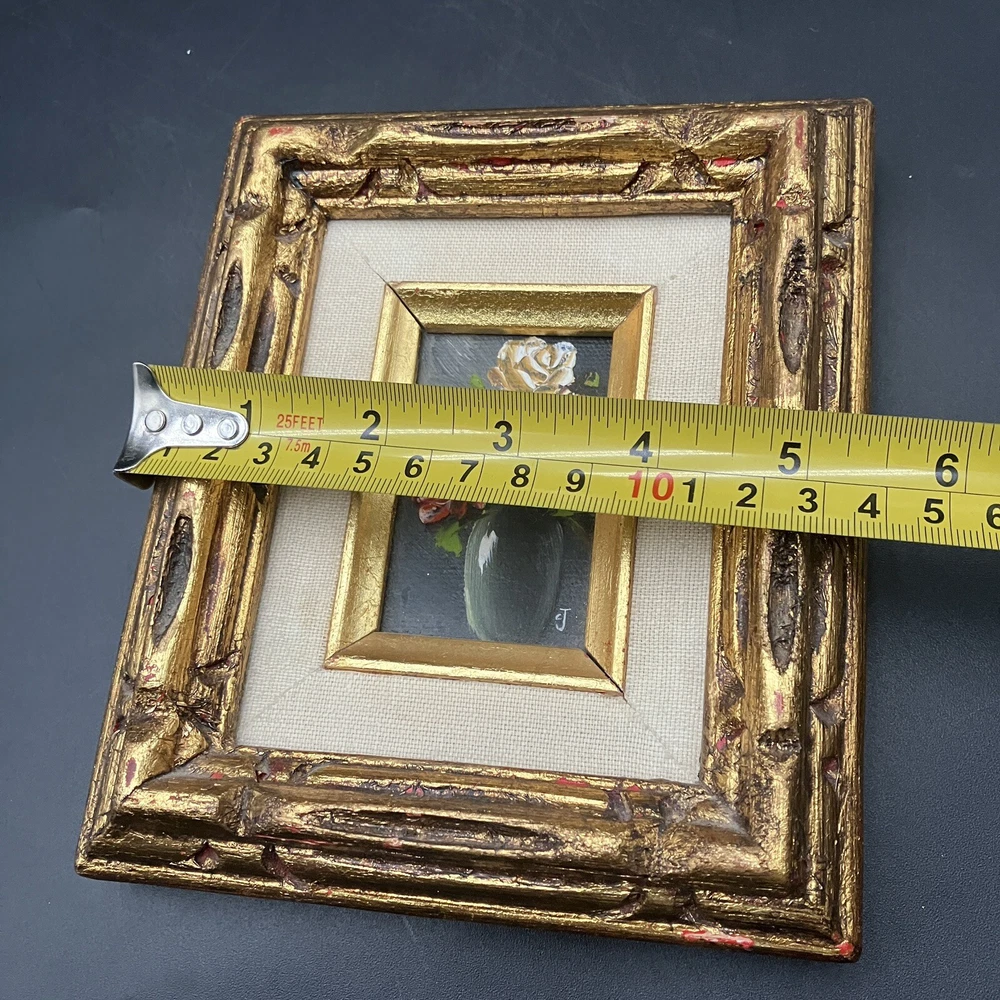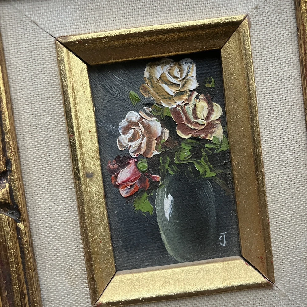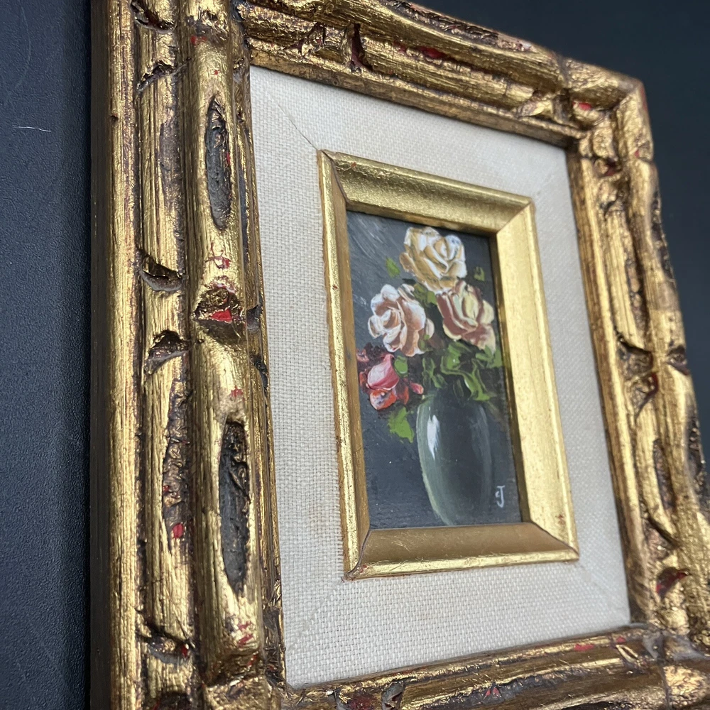Enhance your space with a touch of vintage charm through this original miniature oil painting on canvas. The piece features a serene still life arrangement of roses, capturing the essence of floral beauty in a compact 5-inch length and 7-inch height. Framed and ready to display, it's a subtle yet elegant addition to any room. Created by CJ, a signature confirms the artist's touch, adding authenticity to this contemporary work from 1970 to 2020. Its small size makes it a perfect fit for intimate spaces, while the handmade nature of the piece underscores its uniqueness. This floral-themed painting is a tranquil homage to the still life tradition, sure to bring a cozy vibe to your home decor. ****SHIPS NEXT BUSINESS DAY***