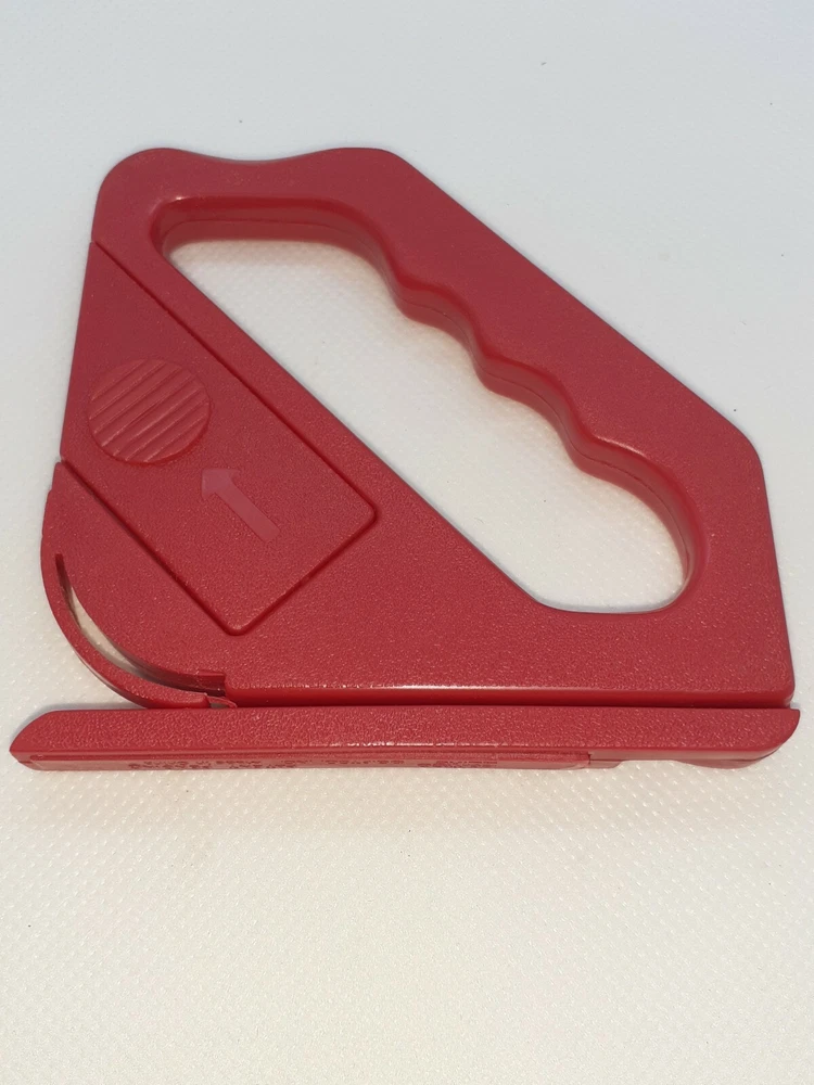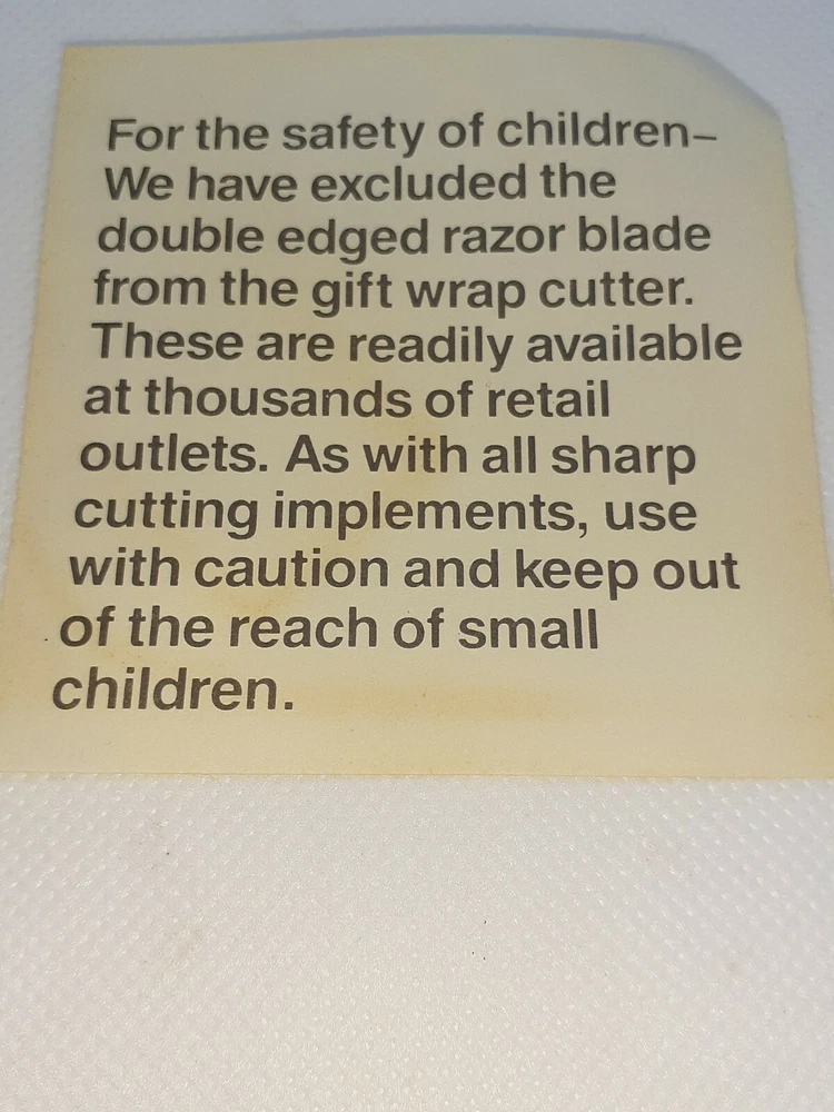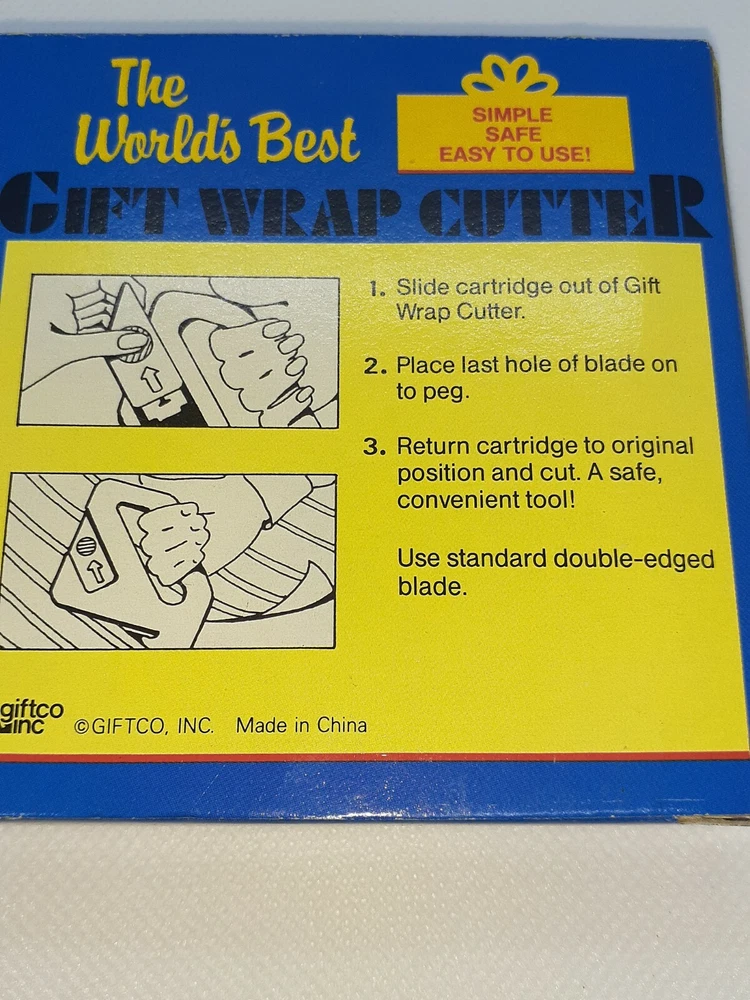 REQUIRES RAZOR BLADE NOT INCLUDED This vintage red gift wrap cutter from Giftco Inc. is the perfect addition to your home office or study. Measuring 3.5 inches in length and .25 inches in width, this free-standing cutter is made of durable plastic and is new in the box. It's a great gift for birthdays or Christmas and adds a touch of retro style to any room. With no assembly required, this cutter is ready to use right out of the box. It features no drawers or shelves, and has a capacity of does not apply. The number of items in set is one, and it is not intended for personalization. This original item is made in China and weighs just one ounce. REQUIRES RAZOR BLADE NOT INCLUDED