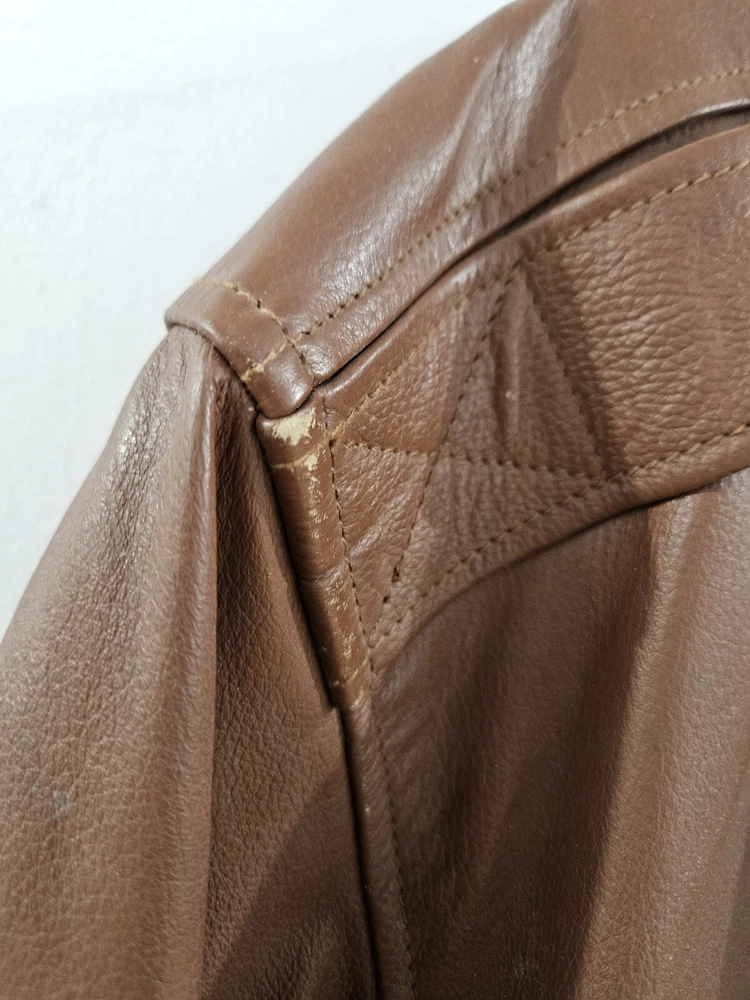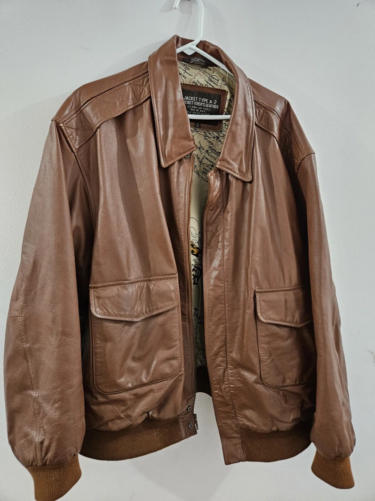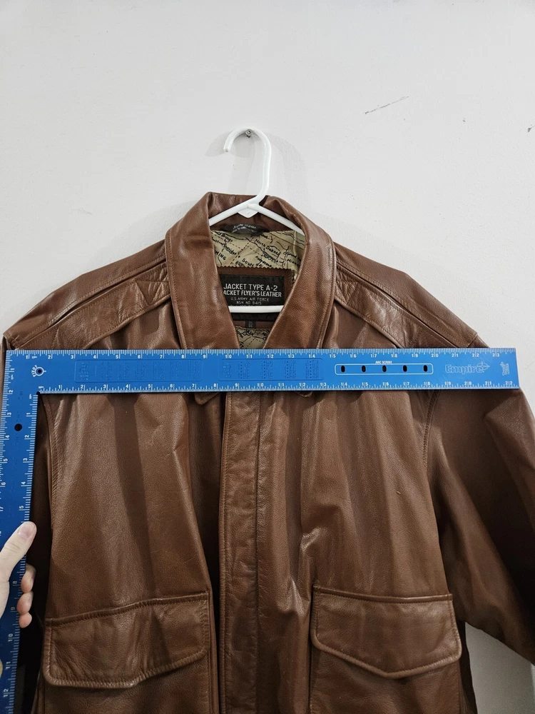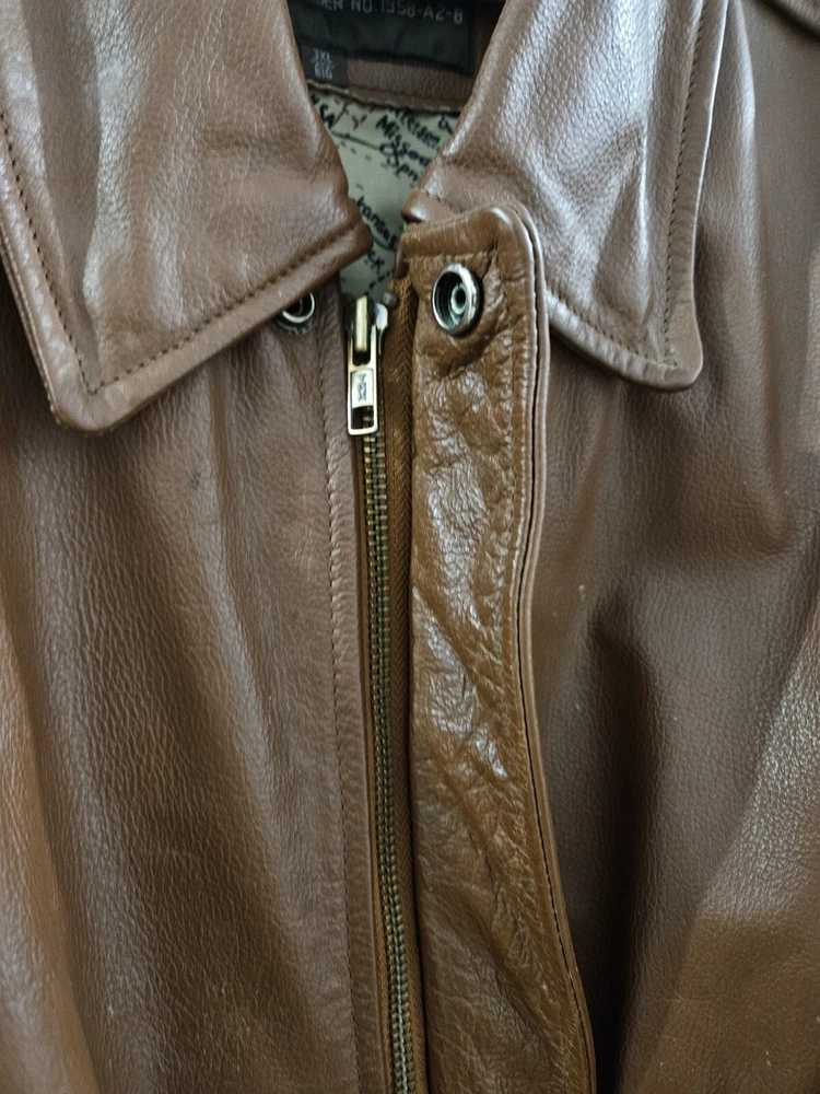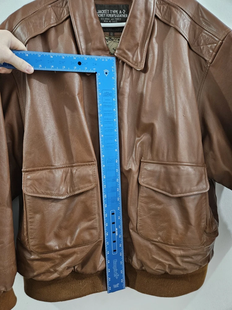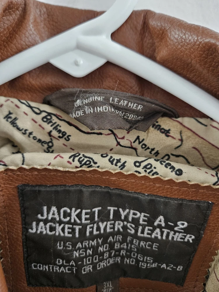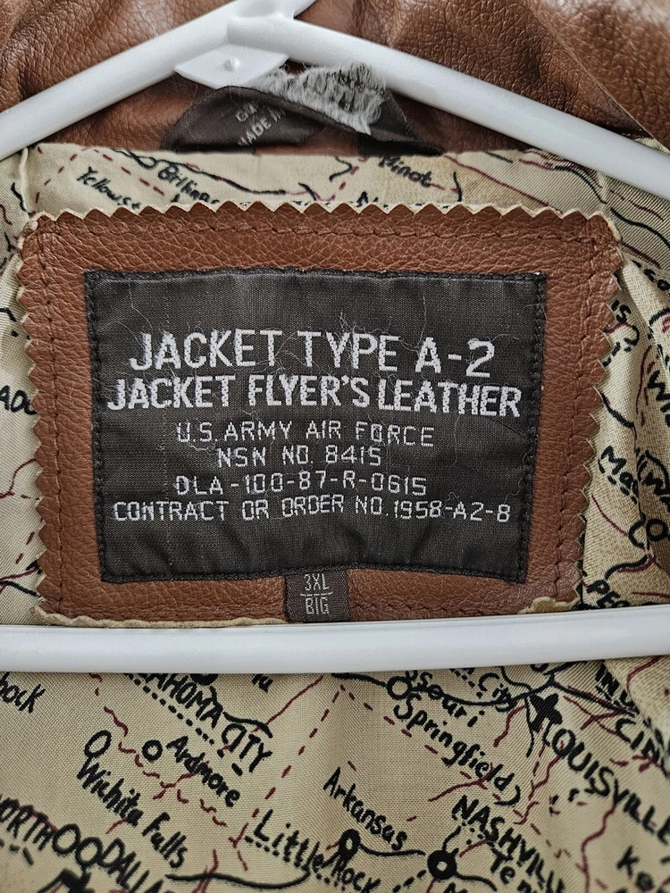 This is a vintage Type A-2 leather jacket in brown color made for the US Army Air Force. It is a mid-length bomber jacket made of leather with a polyester lining. The jacket has a spread collar, full zip closure, and accents such as pockets and a map lining. It is a 3XL regular fit jacket that is ideal for travel, riding, walking, or racing during the winter, fall, or spring seasons. The jacket has a classic, vintage look and is dry clean only. I tried to photograph any condition issues, I found the leather is looking really good overall please view photos for the best representation of condition