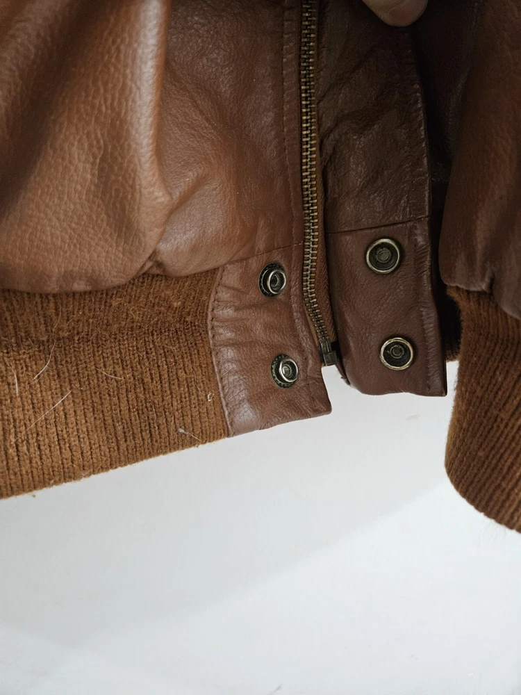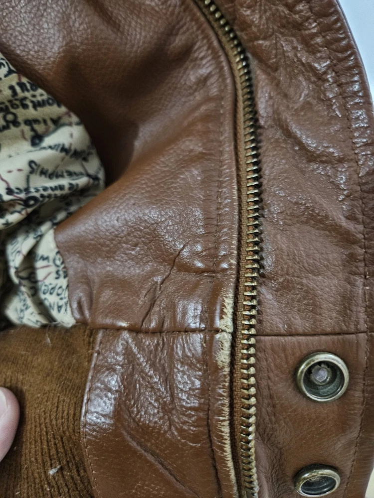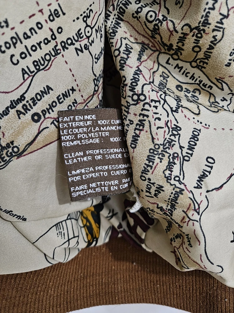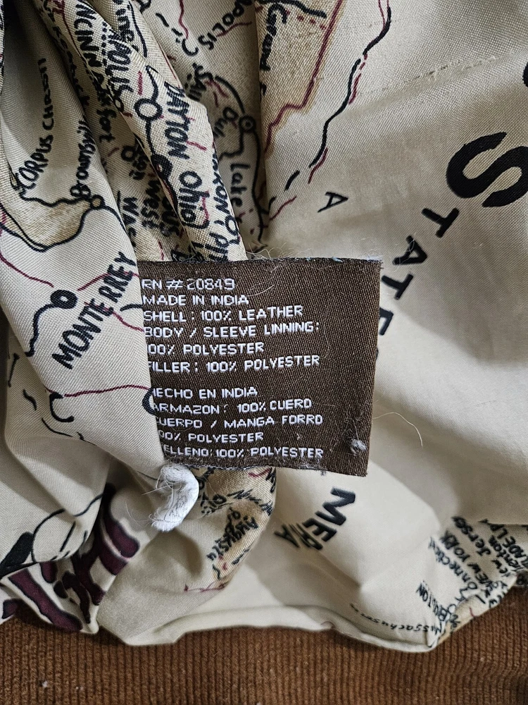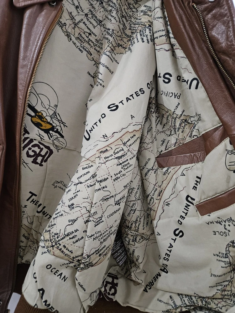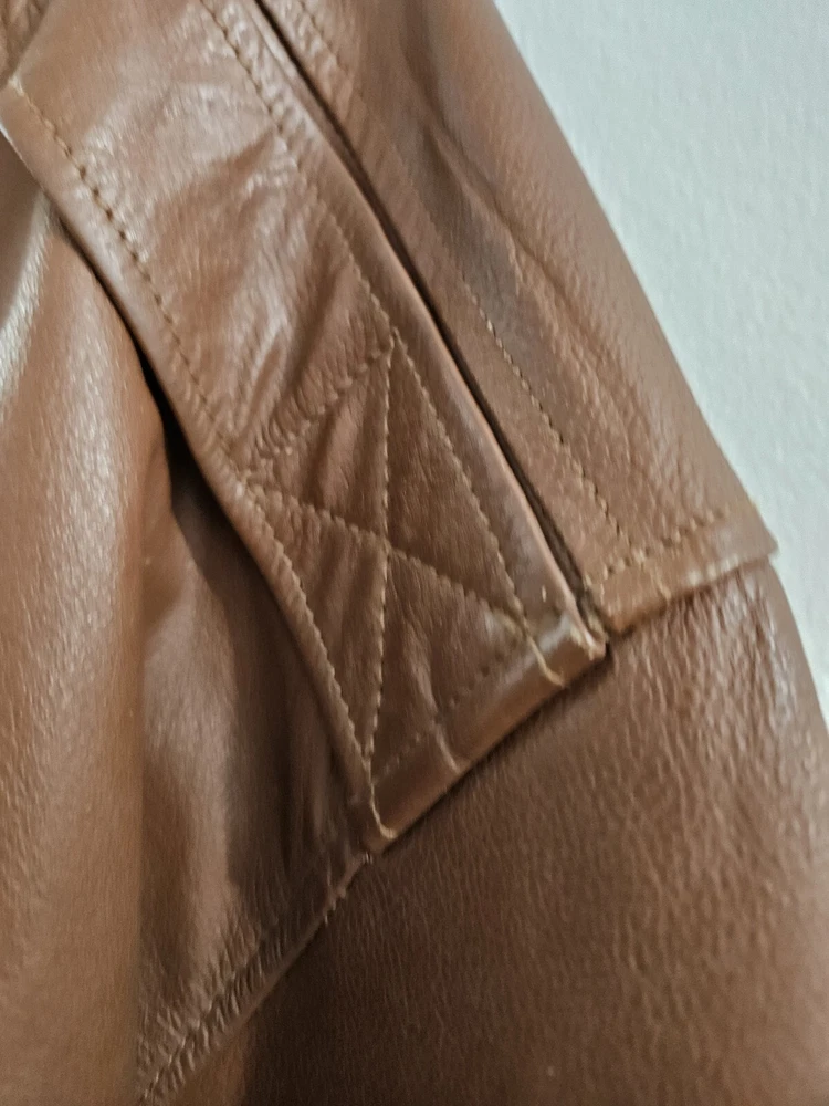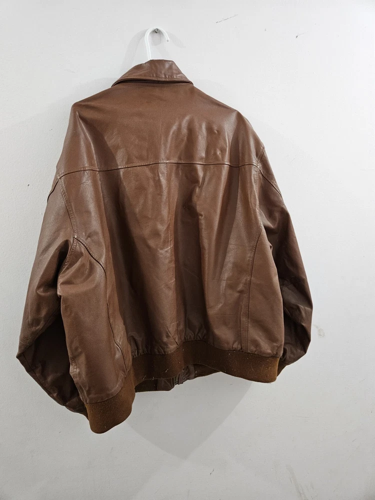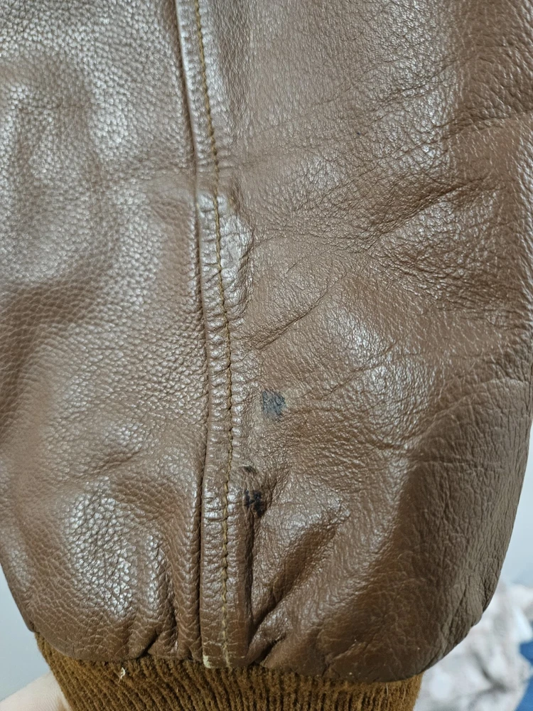 This is a vintage Type A-2 leather jacket in brown color made for the US Army Air Force. It is a mid-length bomber jacket made of leather with a polyester lining. The jacket has a spread collar, full zip closure, and accents such as pockets and a map lining. It is a 3XL regular fit jacket that is ideal for travel, riding, walking, or racing during the winter, fall, or spring seasons. The jacket has a classic, vintage look and is dry clean only. I tried to photograph any condition issues, I found the leather is looking really good overall please view photos for the best representation of condition