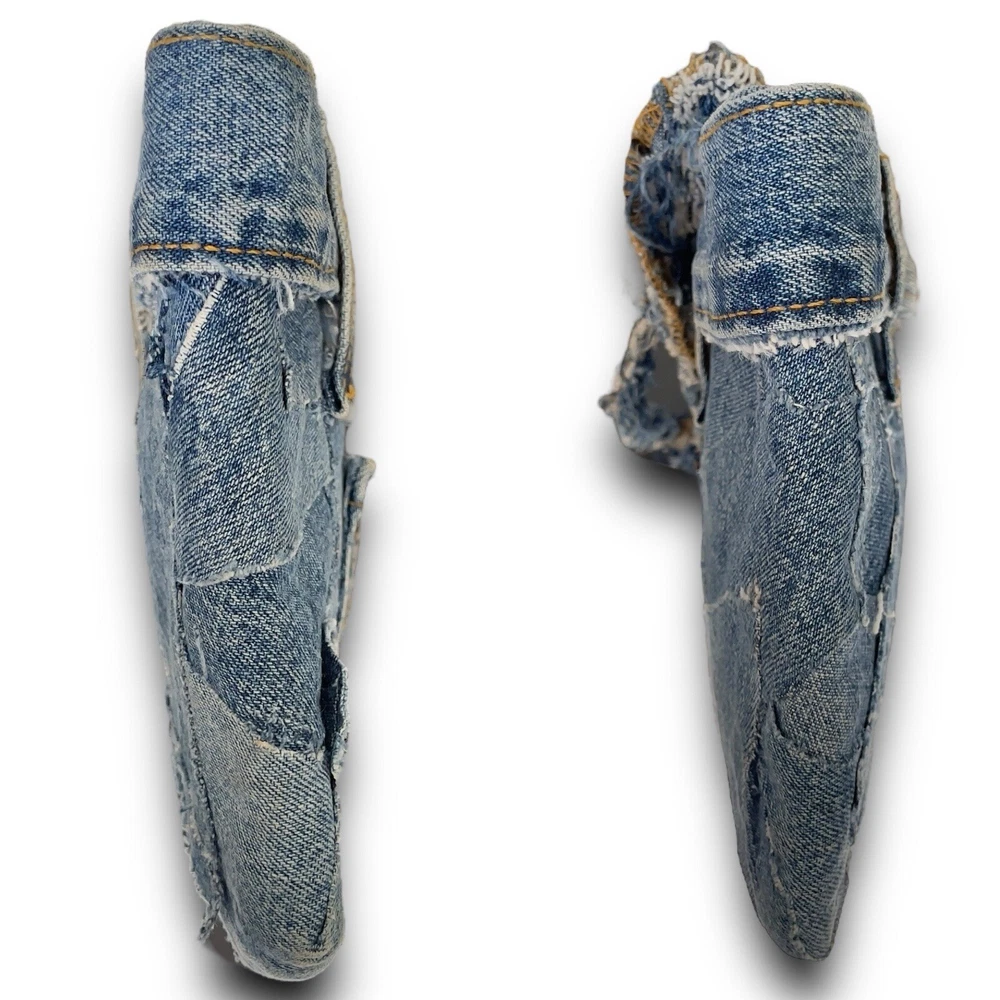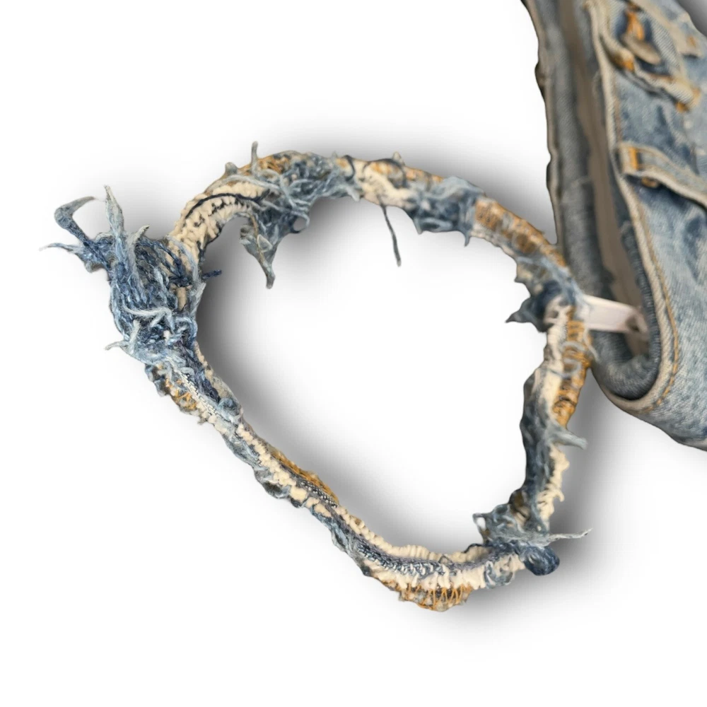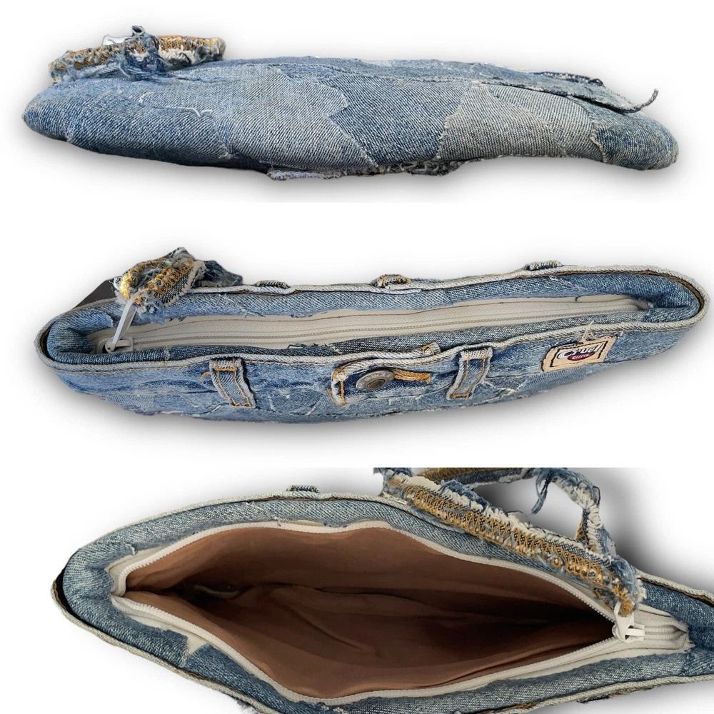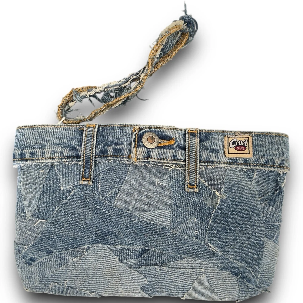Vintage upcycled ‘Cruel Girl’ denim patchwork wristlet clutch ~ one of one Insane y2k handmade upcycled purse “jurse” boro denim wristlet bag crafted with quality ‘Cruel Girl’ denim patchwork jeans featuring distressed details, outer front pocket as well as main inner compartment with zip closure and woven denim wrist loop. One of a kind, totally unique hand bag in excellent pre owned condition! L 10” H 7” D 1”