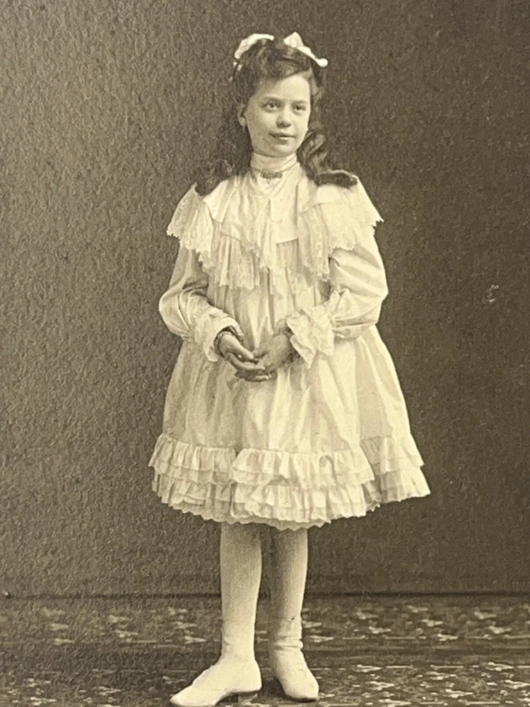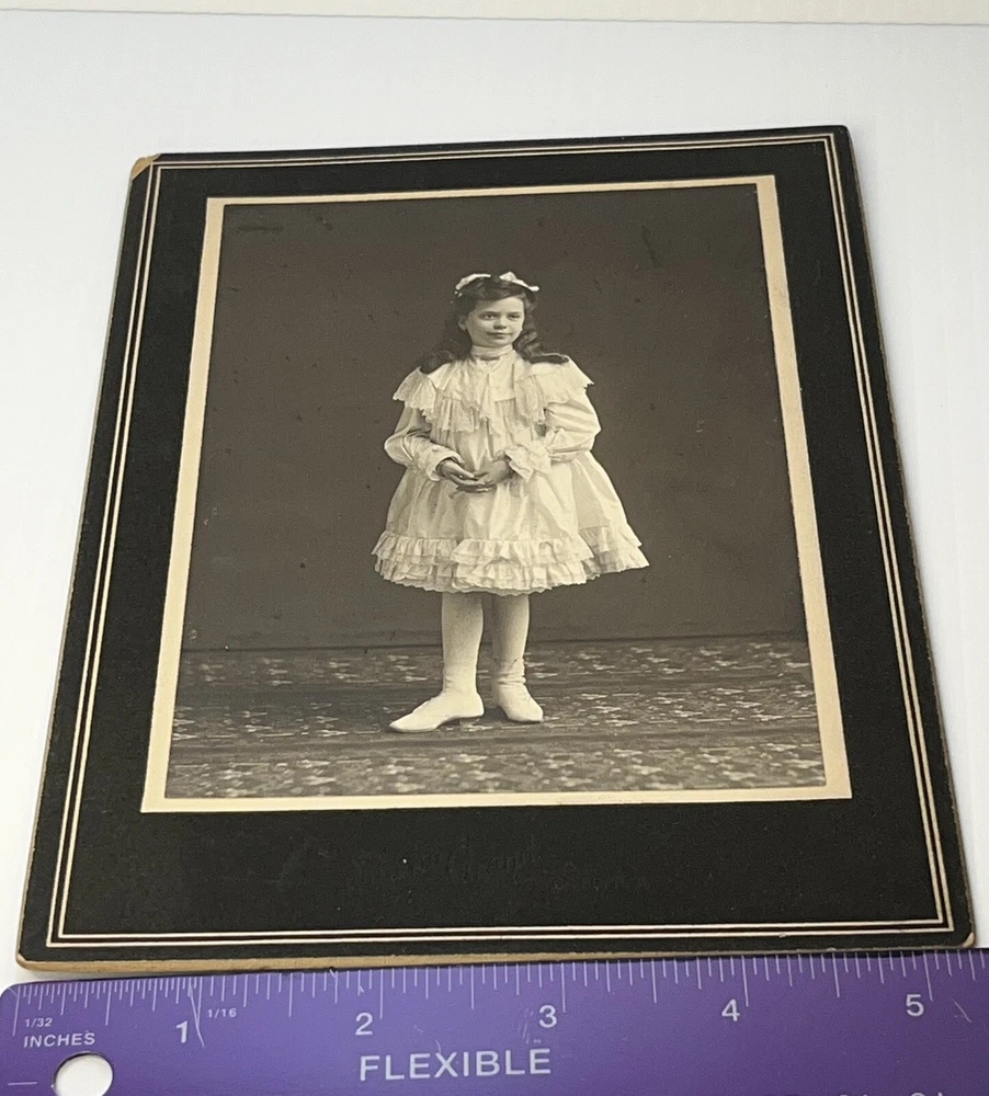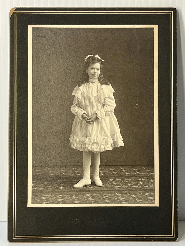 Victorian Cabinet card portrait of wealthy young girl in beautiful white frilled ruffle lace dress, stockings and high button shoes Adorned with jewelry, bracelets necklace and rings 6x4 inch Photograph on 7.5x5.5 inch board by Studio Grand, 8th & Race, Cincinnati Ohio Note: damage to upper left corner of board see photos Thank you