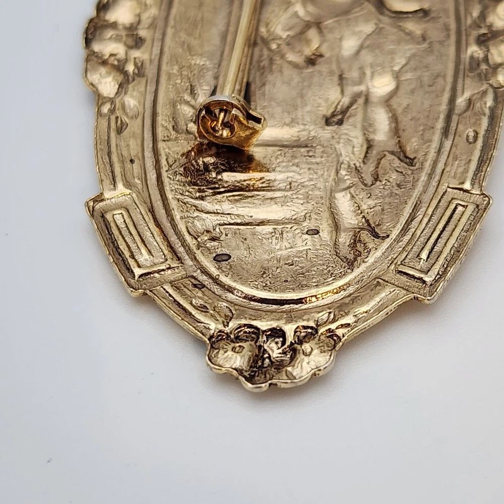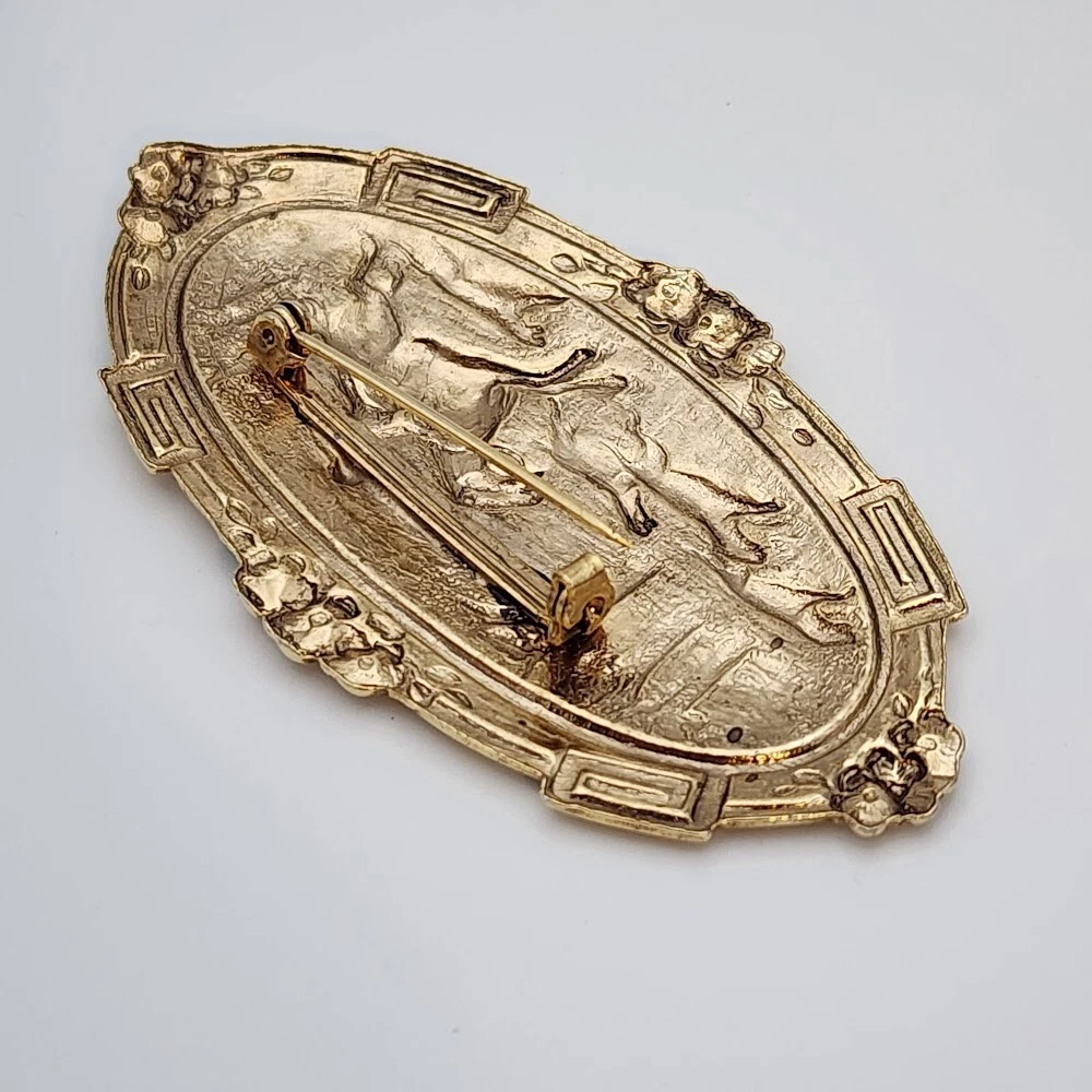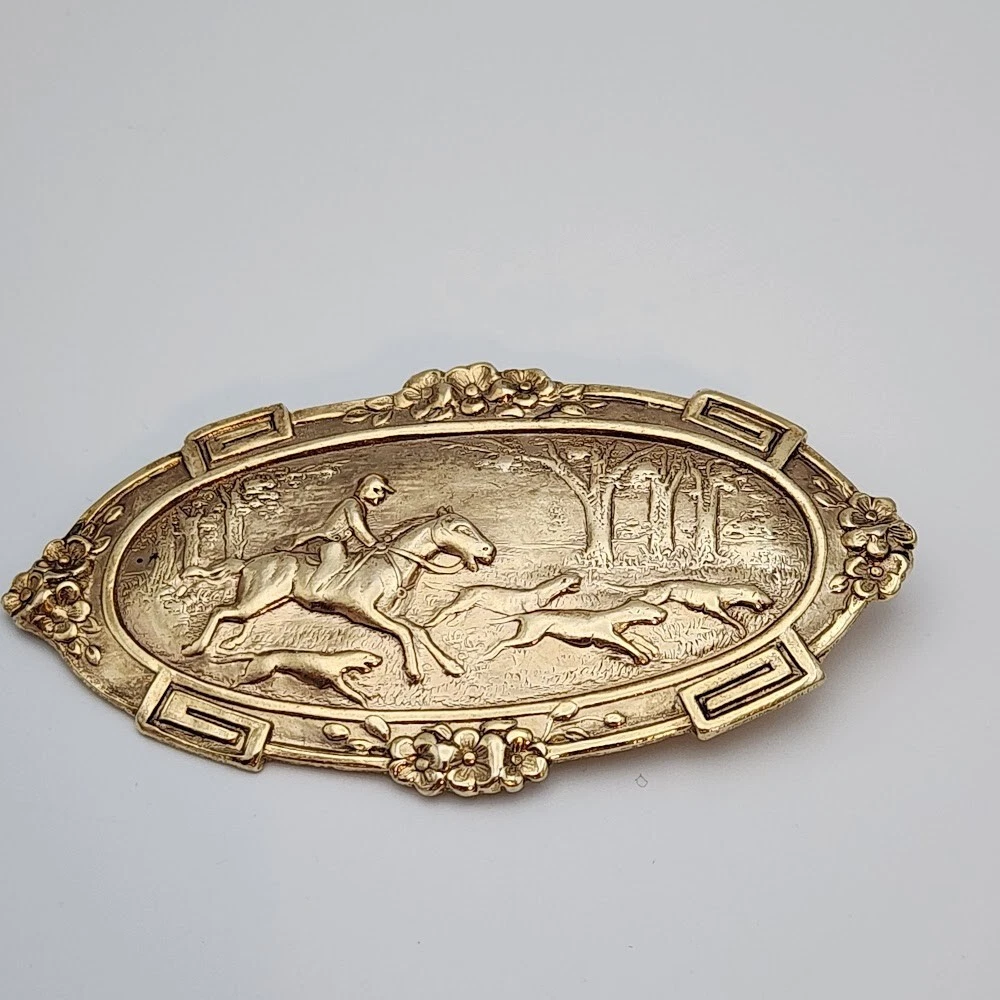 Vtg Victorian Revival Repousse Horse Fox Hunting Dogs Woods Gold Tone Brooch