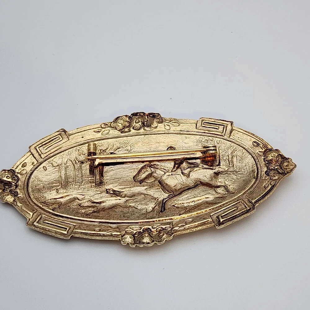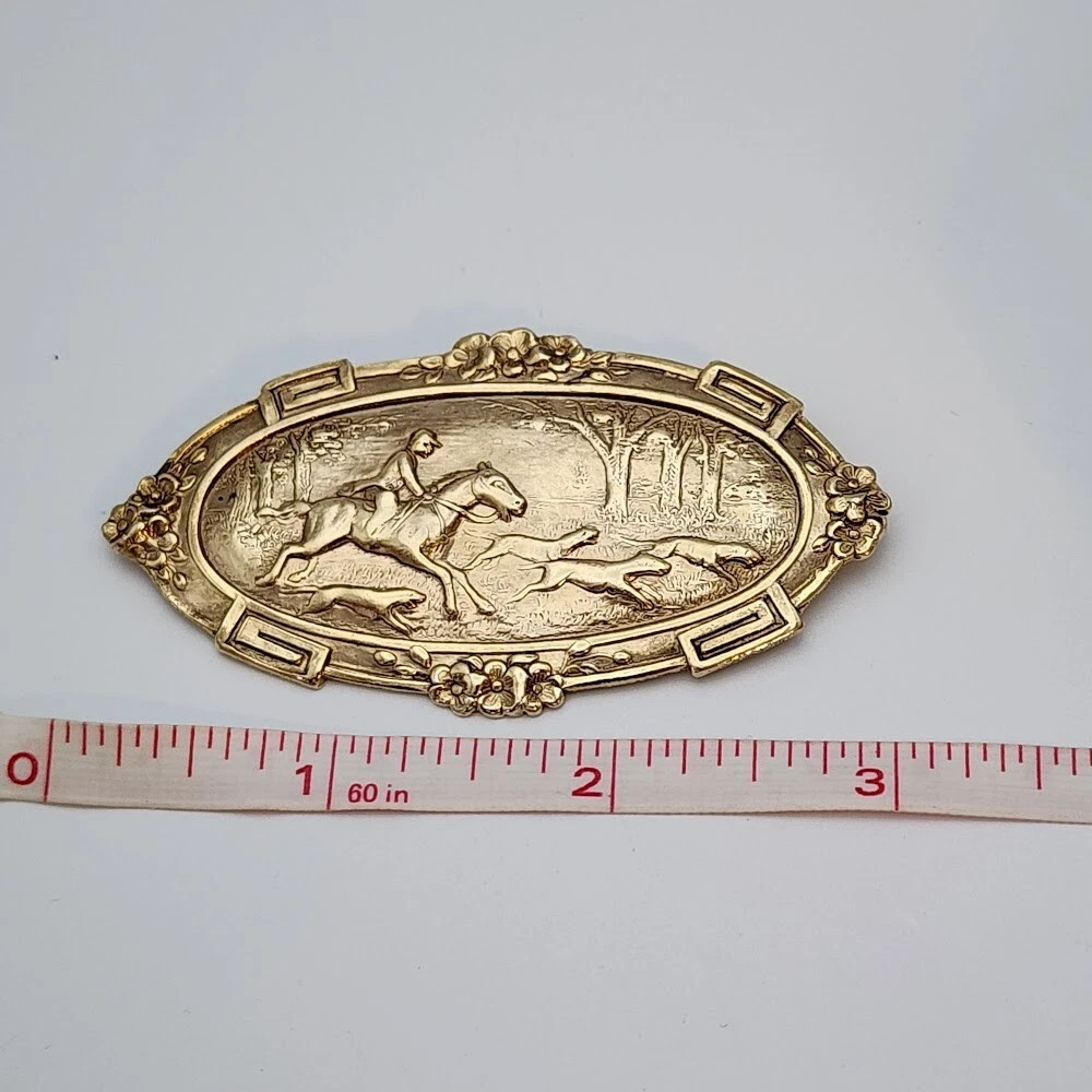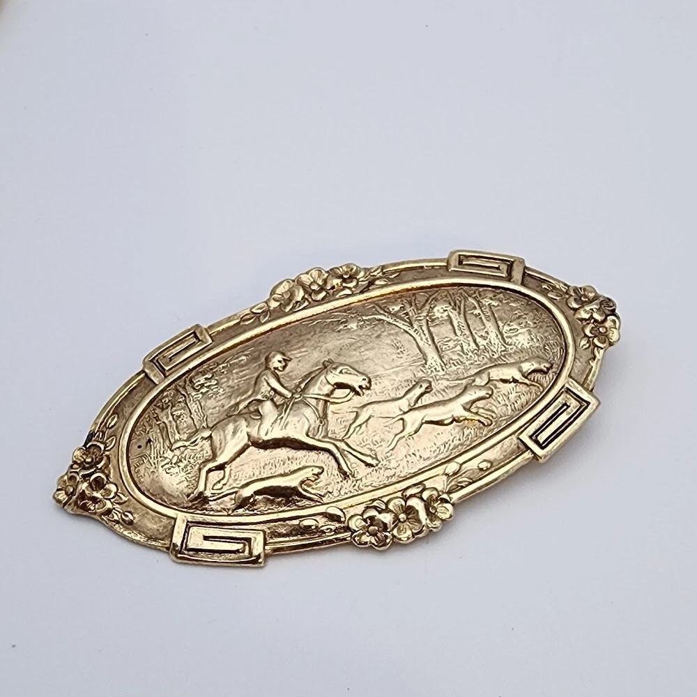 Occasion: Hunting, Equestrian, Horse Vintage: Yes Original/Reproduction: Reproduction Shape: Oval Type: Brooch Jewelry Department: Fashion Item Length: 3" Signed: No Color: Yellow Gold Metal: Unknown Seller Notes: “Great Condition! See Pics For Details.” Brand: Unbranded Material: Unknown Theme: Hunting, Equestrian, Horse Main Stone: No Stone Department: Unisex Adults Base Metal: Unknown