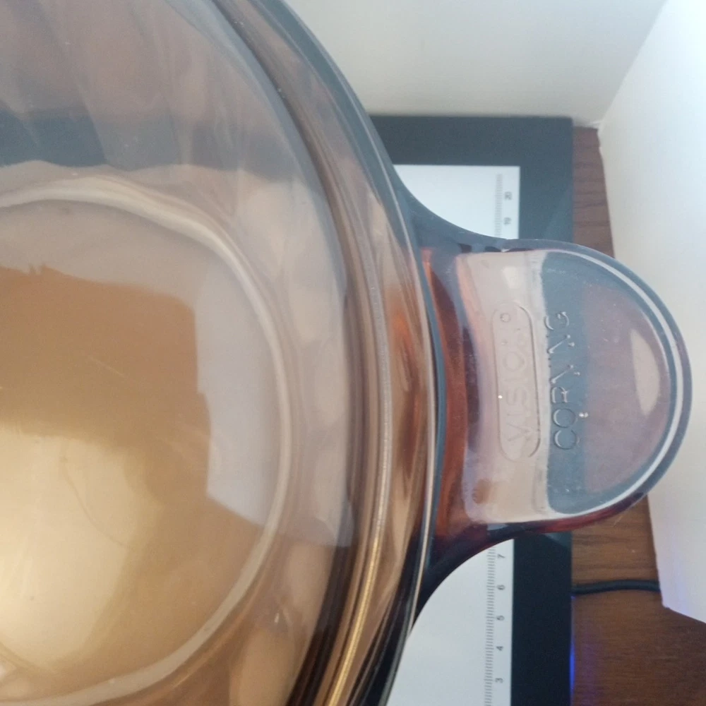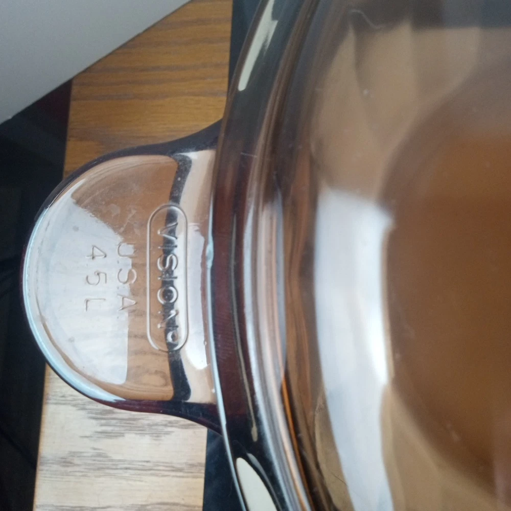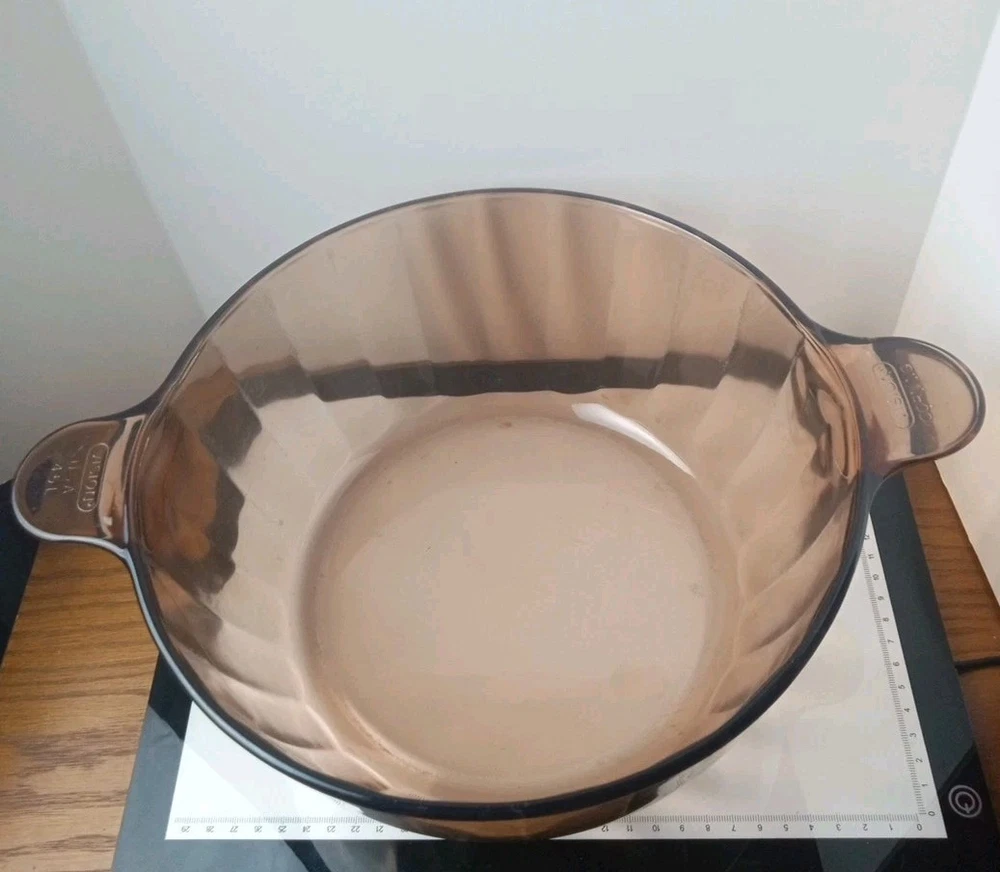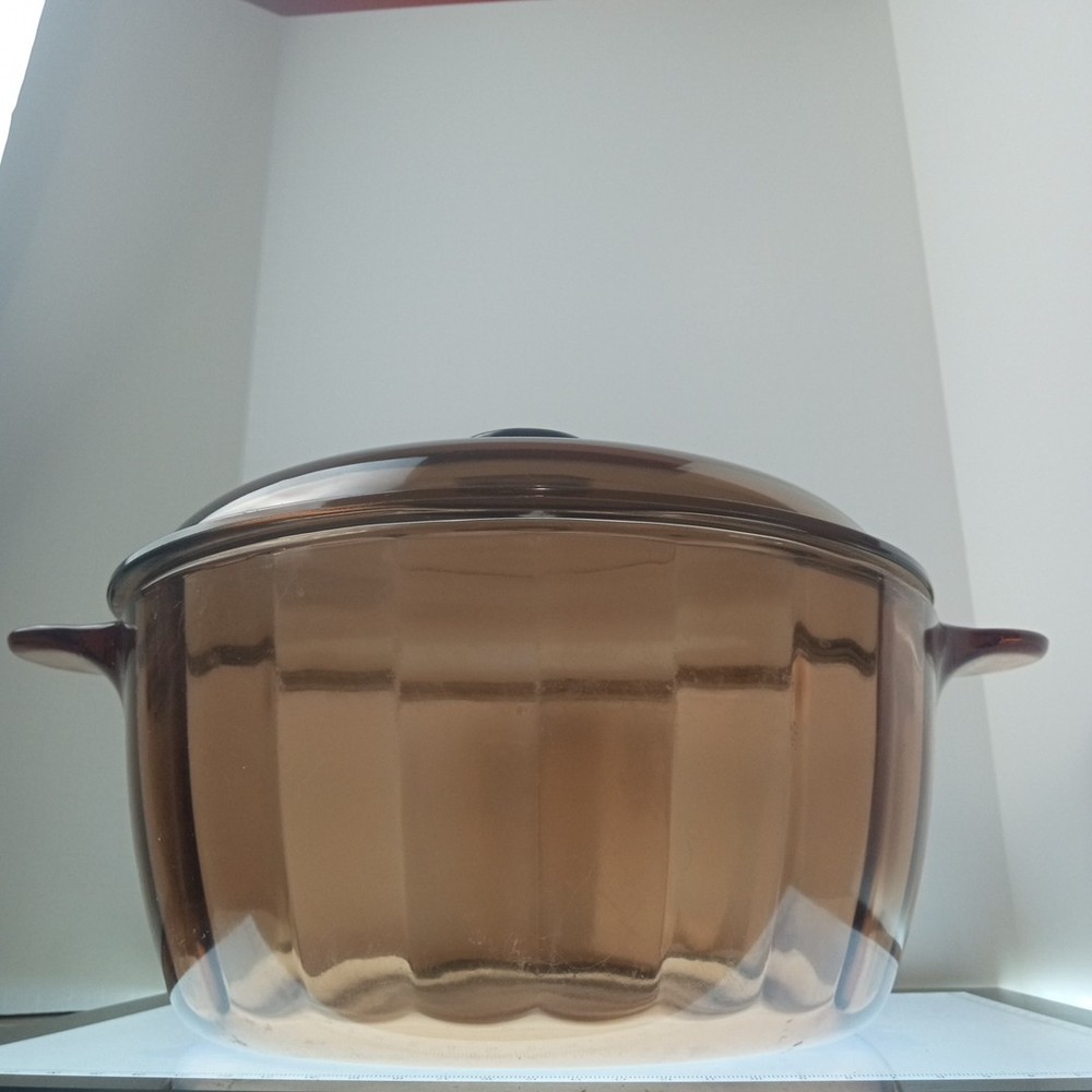 The product is a vintage CorningWare Pyrex 4.5L 5qt glass Dutch oven stock pot with a lid. This mid-century modern piece features a solid brown color and glossy finish, with a capacity of 4.5L. It is a pressed glass item with a non-stick surface coating, making it dishwasher safe and microwaveable. The Dutch oven is ideal for cooking on electric, gas, or microwave ovens, and is a collectible piece from the 1980s United States production.