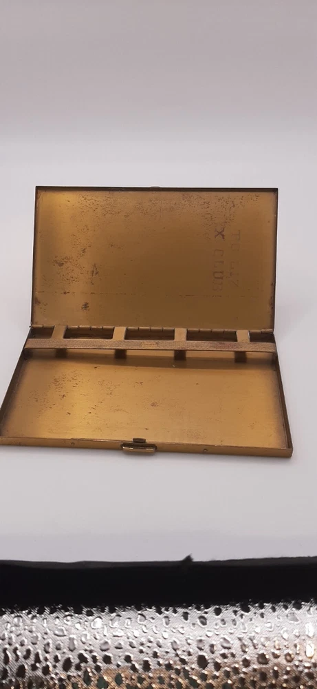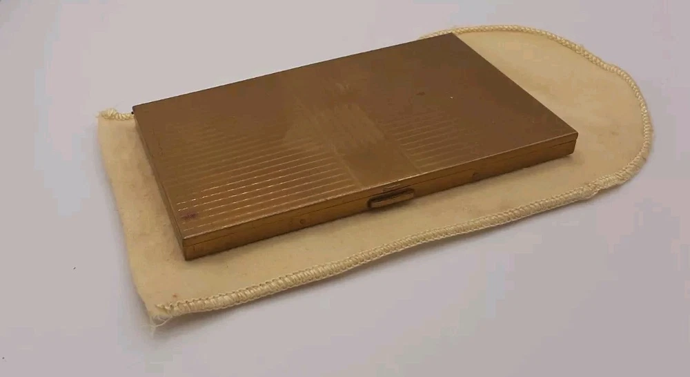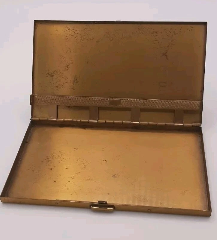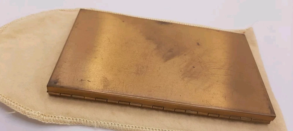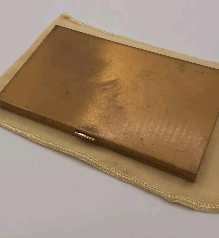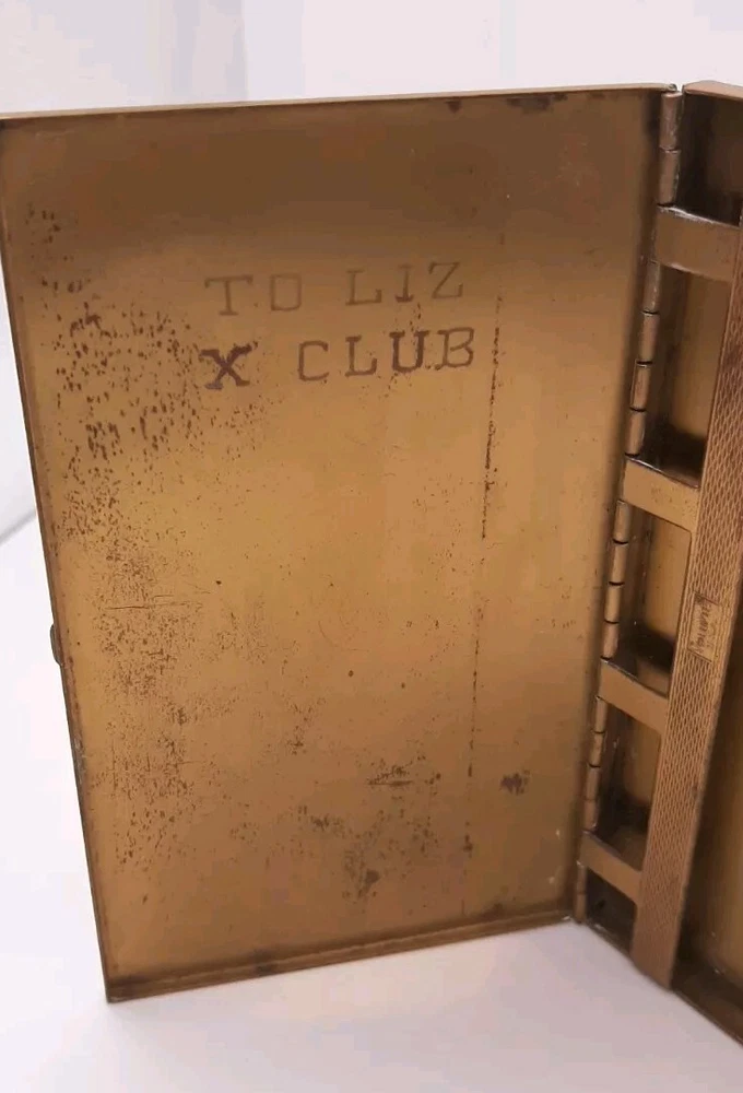VINTAGE PREOWNED VOLUPTE CIGARETTE CASE WITH POUCH ENGRAVED "TO LIZ" "X CLUB" GOLDTONE 5.25"×3"×5/16" APPROXIMATELY SCRATCHES FROM USE AND AGE DISCOLORATION SOME SPOTS FROM AGE SOLD "AS IS" PLEASE SEE PHOTOS AS THEY ARE AN IMPORTANT PART OF THE DESCRIPTION! MADE IN USA