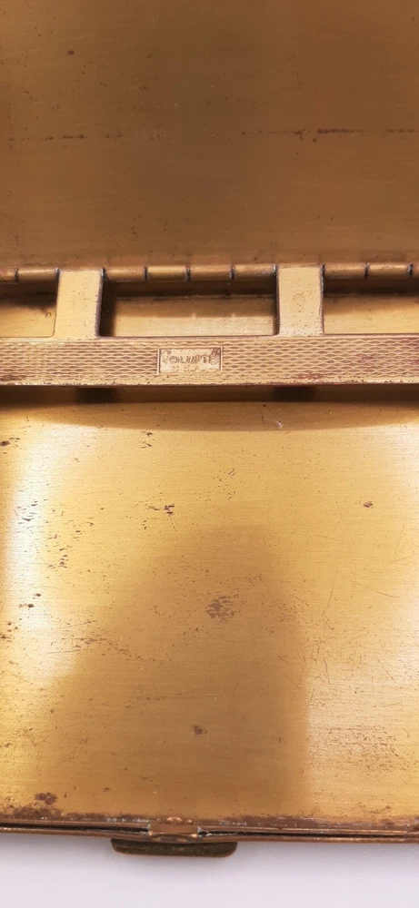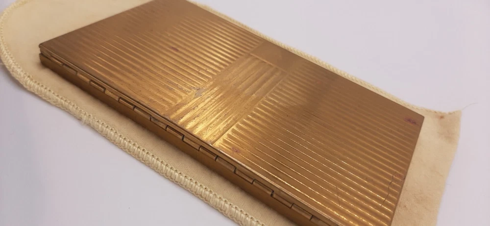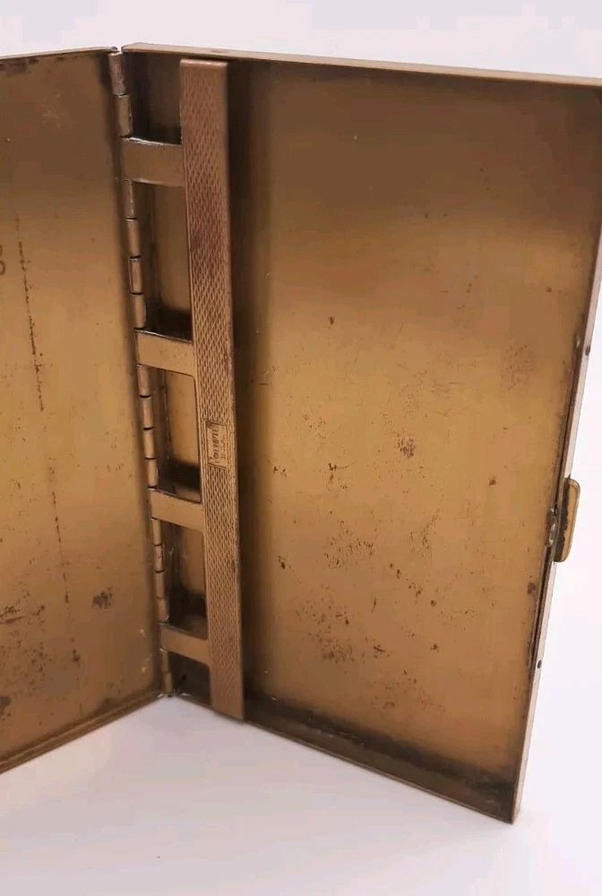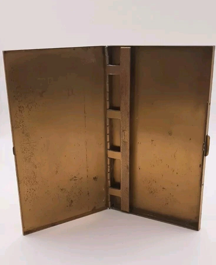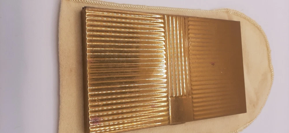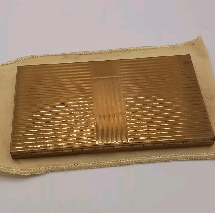 VINTAGE PREOWNED VOLUPTE CIGARETTE CASE WITH POUCH ENGRAVED "TO LIZ" "X CLUB" GOLDTONE 5.25"×3"×5/16" APPROXIMATELY SCRATCHES FROM USE AND AGE DISCOLORATION SOME SPOTS FROM AGE SOLD "AS IS" PLEASE SEE PHOTOS AS THEY ARE AN IMPORTANT PART OF THE DESCRIPTION! MADE IN USA