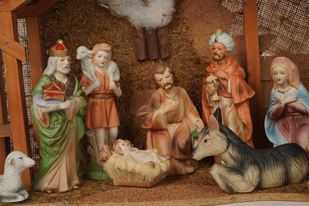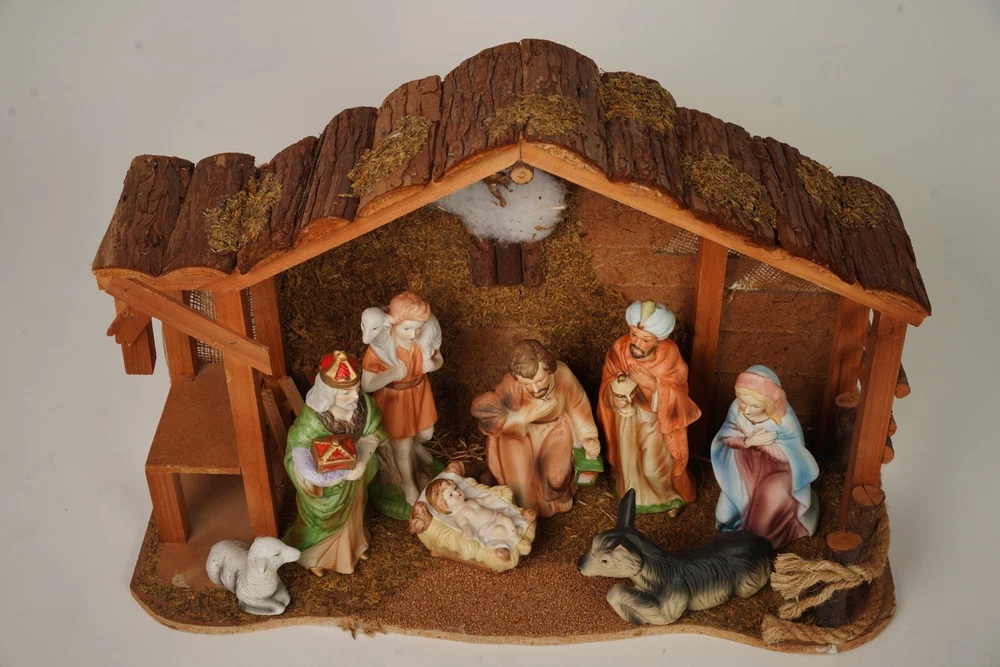This listing includes 8 figurines and 1 stable only. The stable measures as 21"x8"x15". There is an optional broken 10th piece that only sent upon request. The 10th piece needs to be glued.