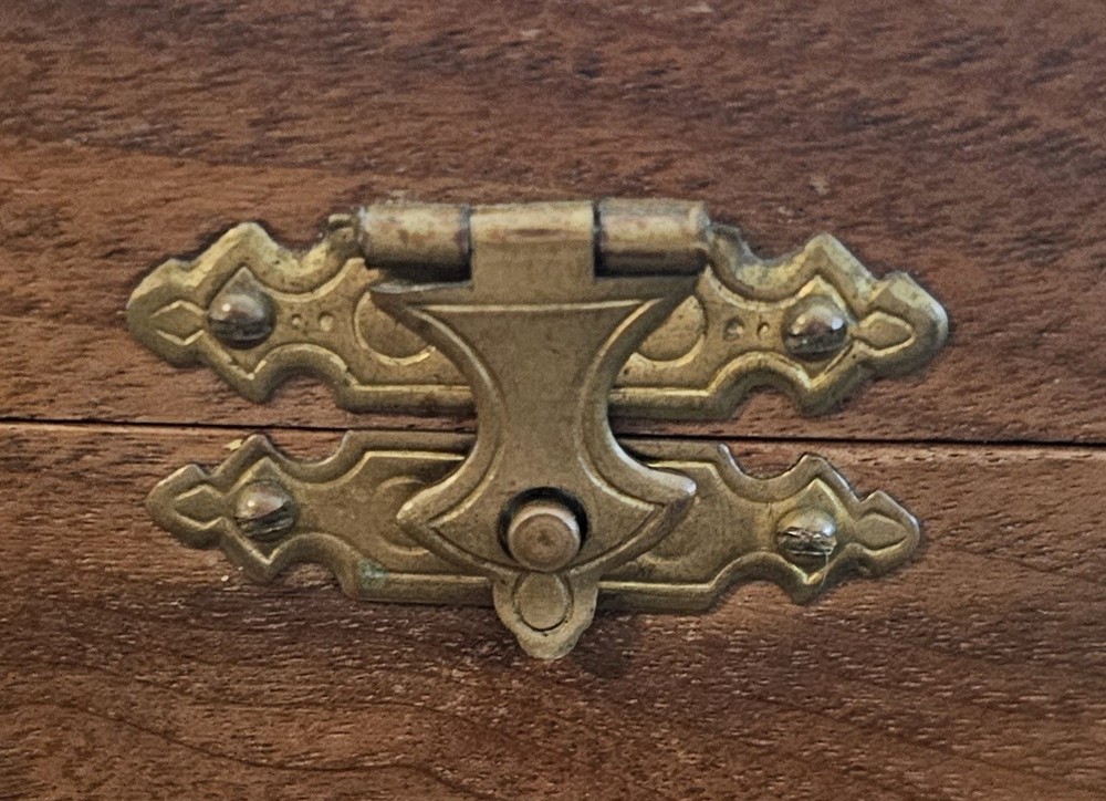 Vtg, solid wood, gold colored hinges & latch, lined imside with brownish orange faux fur, & lined underneath with dark brown felt, also has mirror inside. Not branded but you can tell it is handmade. In good condition for its age. A few flea bites here & there. Unnoticeable if polished.