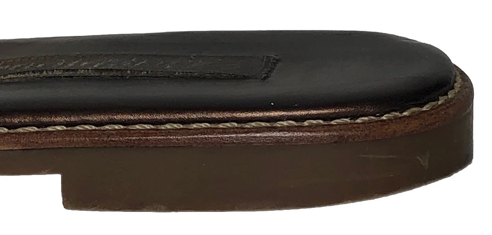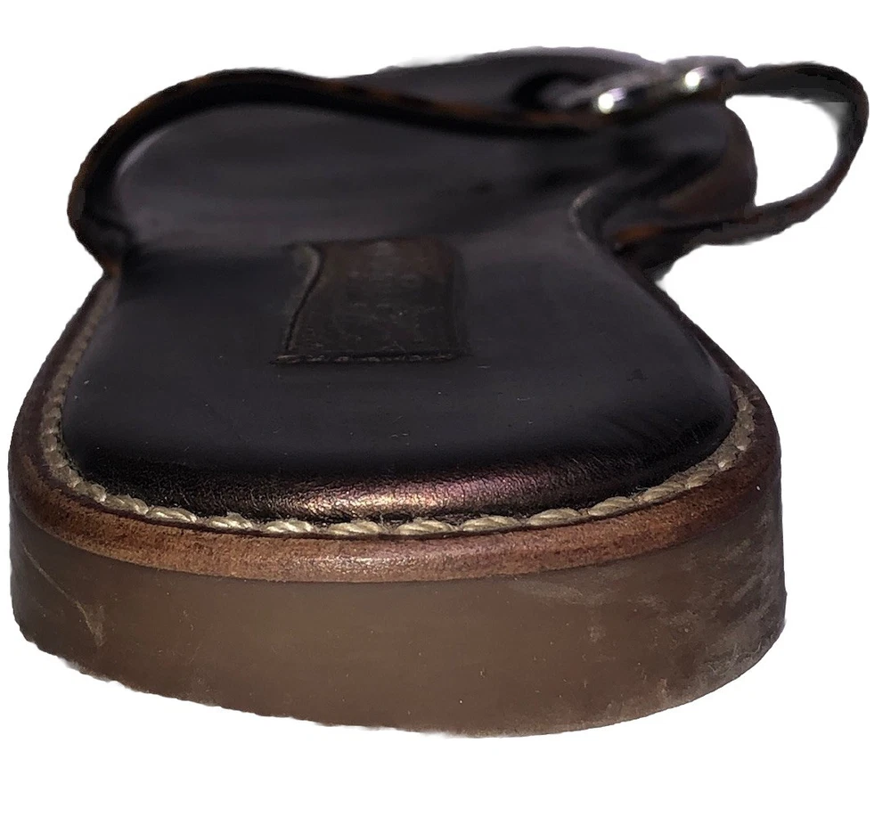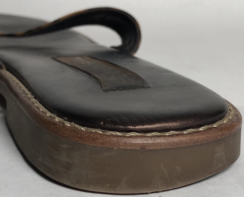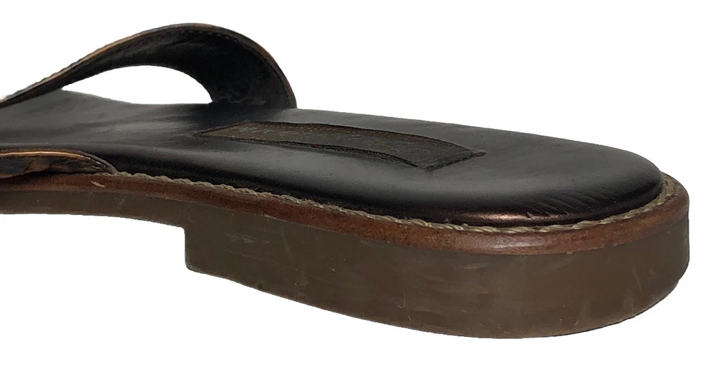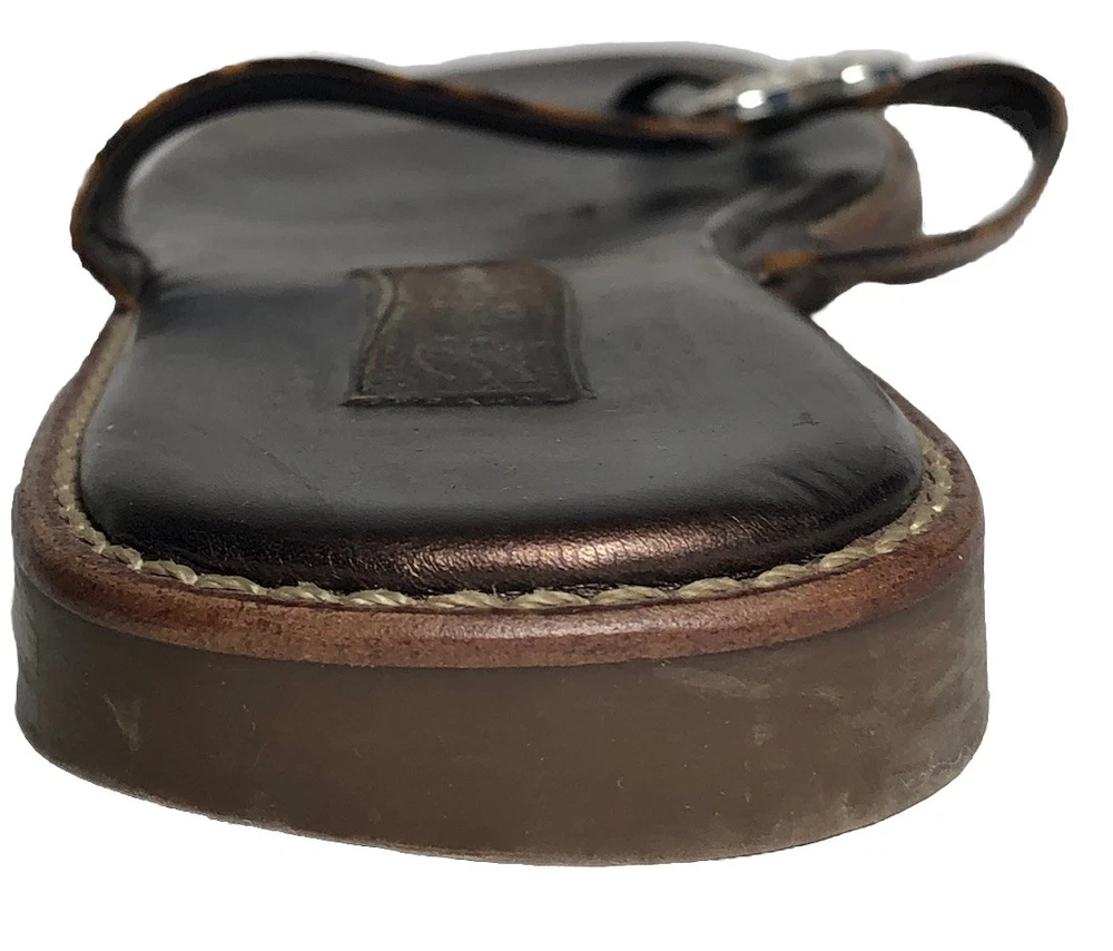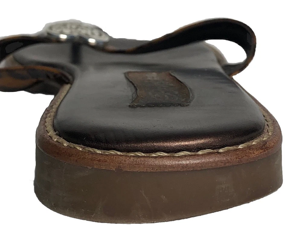 Brighton Orla 2 leather thong sandals made in Brazil, featuring leopard print straps with silver-tone heart medallion hardware. Classic Brighton craftsmanship with stitched leather footbeds and rubber soles. Casual summer, resort, and boho styling typical of early Brighton 2000s designs. Era/Decade: Early–Mid 2000s (Y2K era) Size: Women’s US 10M Fair condition. Heavy wear and darkening to leather footbeds Visible foot impressions Creasing and surface wear to leather Edge wear along midsoles Soles show regular use Straps and hardware remain intact I do my best to thoroughly inspect each item and list any visible flaws. However, due to the nature of pre-owned items, small imperfections may occasionally go unnoticed. Please keep in mind these items are pre-loved and often decades old. If condition is especially important to you, feel free to ask for additional details or photos before purchasing. brighton sandals, brighton orla 2, leopard print sandals, leather thong sandals, made in brazil shoes, y2k sandals, women summer sandals, boho sandals, brighton shoes, flat leather sandals
