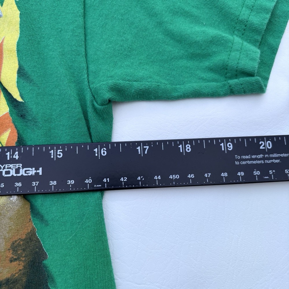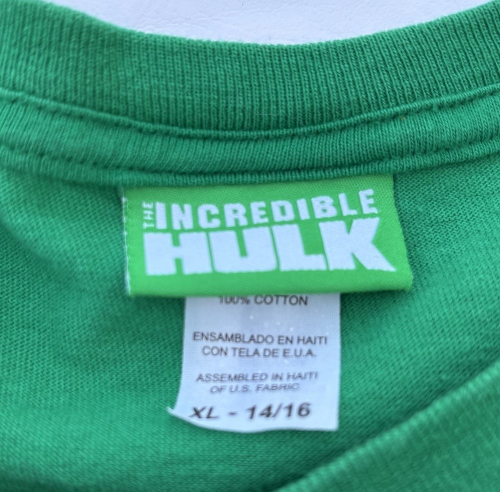 This vintage Y2K Incredible Hulk Marvel shirt in green, youth size large, features a big print of The Hulk, perfect for fans of the superhero. The pullover shirt with a crew neck and band collar is made from a blended fabric, making it lightweight and suitable for all seasons. Machine washable and featuring easy care, this shirt is a great addition to any casual outfit, whether it's for school or just hanging out. A must-have for young fans of Marvel's iconic character.