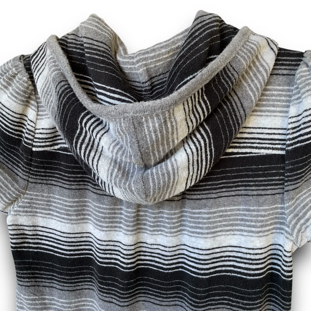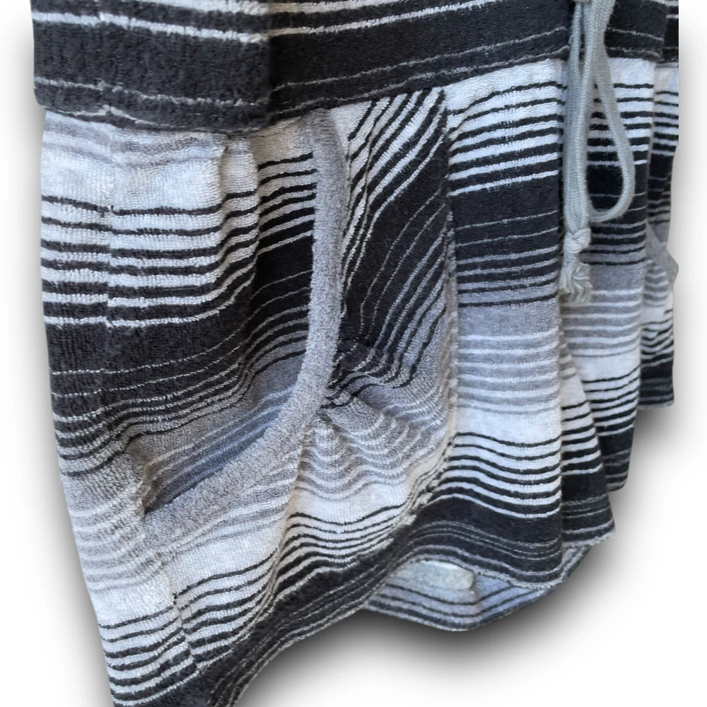 80% cotton 20% poly | made in indonesia Obvi statement piece vintage y2k early 2000s juicy couture short jumpsuit plush French terry cloth one piece romper featuring allover black grey color striped graphic print with stretchy elastic waistband drawstring, two front pockets, adorable puff short sleeves and iconic comfy hoodie with gold hardware zip up front closure with gold ‘J’ pull tag 👑✨this rare hard to find unique collectors gem is in a size small, in excellent pre owned vintage condition. Laid flat measurements: chest 15” length 30.5”