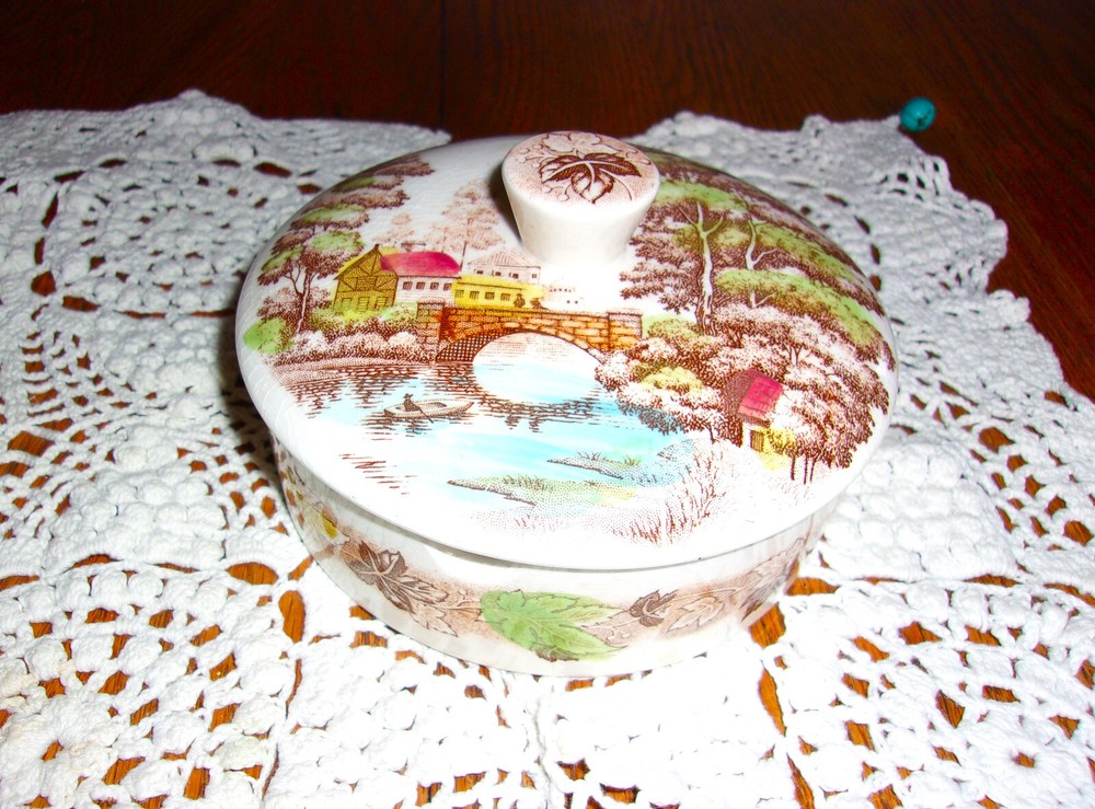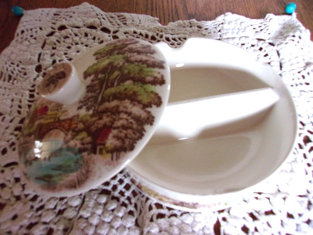 ~~~WELCOME & THANK YOU FOR SHOPPING WITH ME~~~ This rare old piece of transferware is meant for serving condiments and side dishes. The colors in the pretty pastoral scene are mostly green and brown with touches of red, blue and yellow on creamy white. This piece is 5 3/8 in. across the top and is about 1 3/4 in. in depth. There are no identifying markings. Note the condition! There is crazing plus the chip on the edge of the bowl. NEXT DAY SHIPPING from our pet-free, smoke-free home! ~~~I will recycle shipping/packing materials whenever possible. This saves you money and helps protect our environment~~~ IMPORTANT: I am very selective in my purchases and my intention is to offer only the best of merchandise, whether it is new, used or vintage. I try very hard to find and disclose any defects or imperfections. If I should miss something, please contact me right away. Customer satisfaction is my #1 priority! I use EBay shipping labels which include tracking numbers. ~~~A HEARTFELT THANK YOU TO ALL MY LOYAL CUSTOMERS FOR YOUR GREAT EMAILS, FEEDBACK AND CONTINUED PATRONAGE! YOU ARE THE BEST~~~ Check out my other items Be sure to add me to your favorites list !