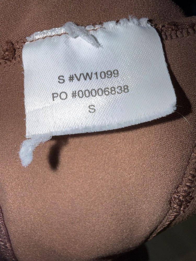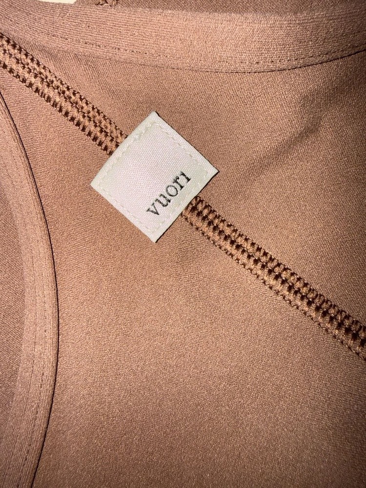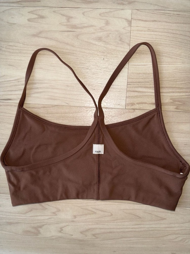 Vuori All the Feels Bra in Java Brown, Women's Size S — Style VW1099. This sports bra features a sleek racerback-inspired design with thin straps and a classic scoop neckline. The Java Brown shade is a rich, neutral earth tone that pairs easily with leggings or joggers. Crafted from high-performance, moisture-wicking fabric with a soft, brushed feel. Minimalist logo patch on the back. Perfect for yoga, Pilates, or light-to-medium impact workouts. Excellent pre-owned condition with no stains or visible signs of heavy wear. Retains original shape and elasticity. Care tag is attached confirming style and size.