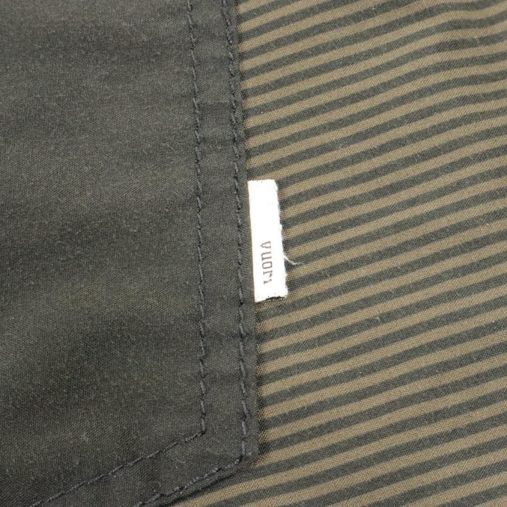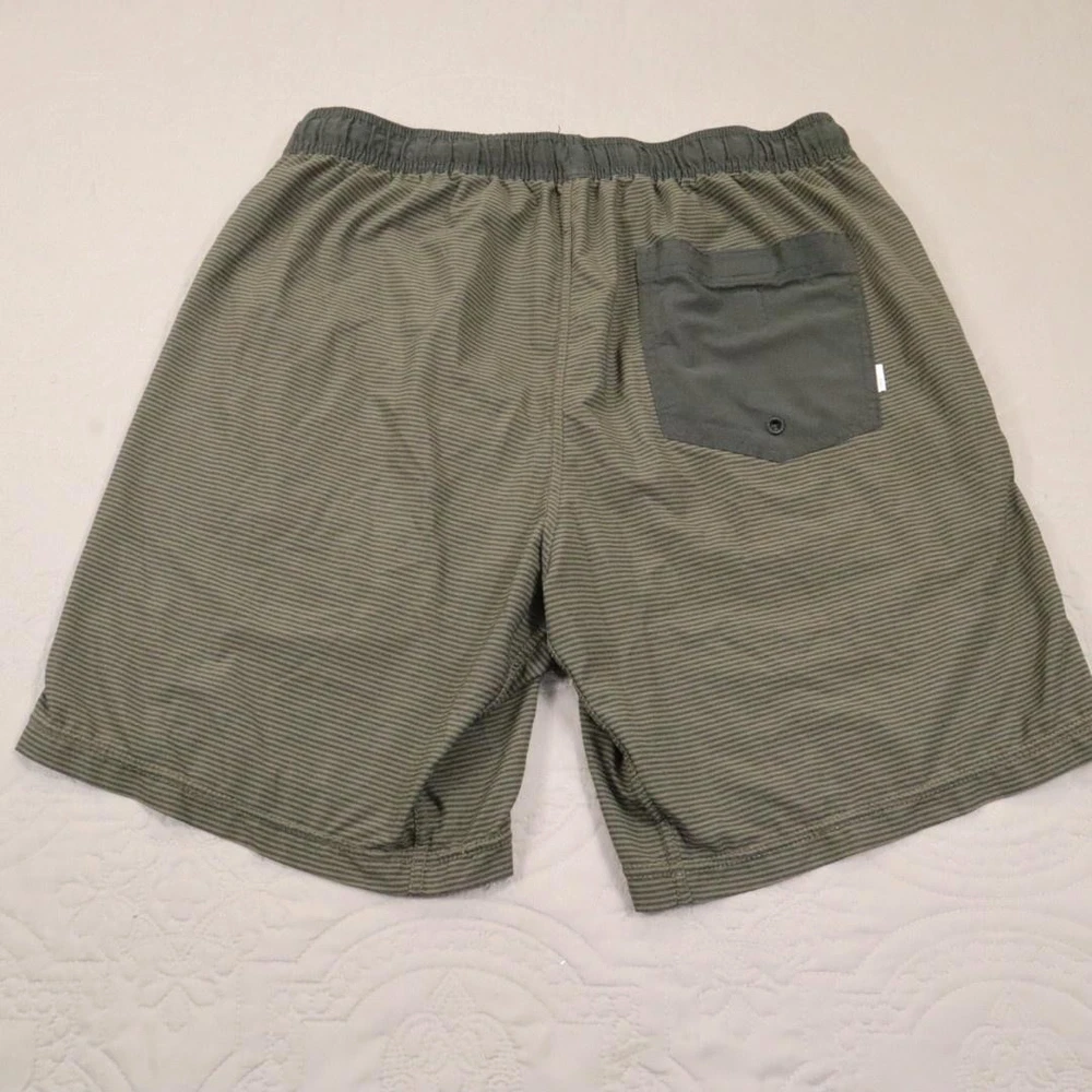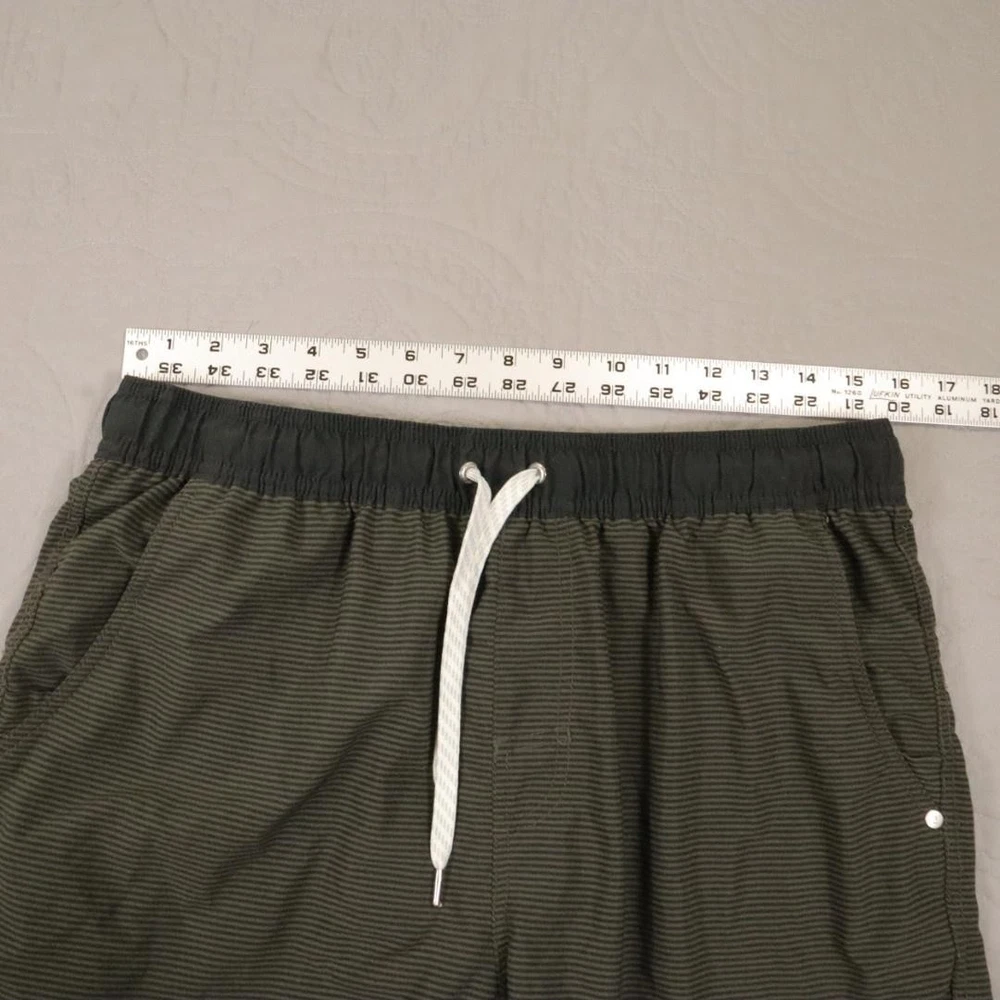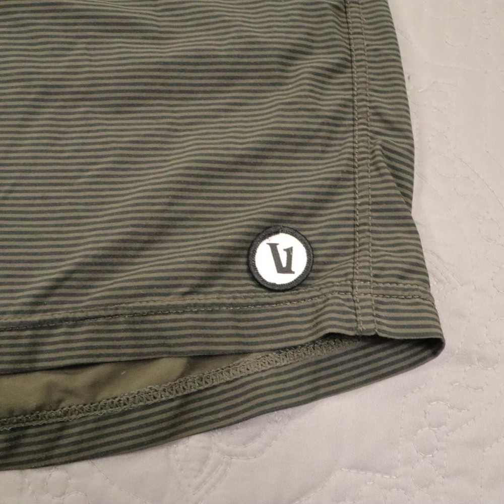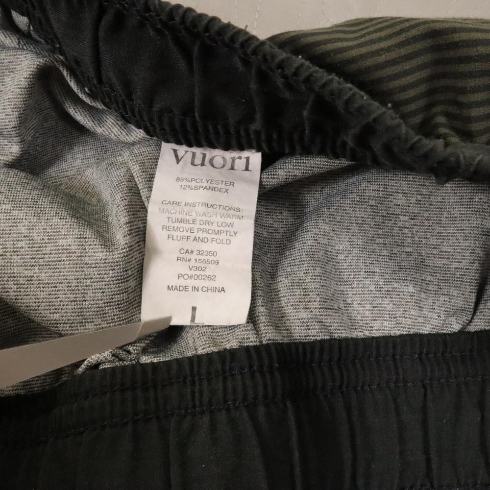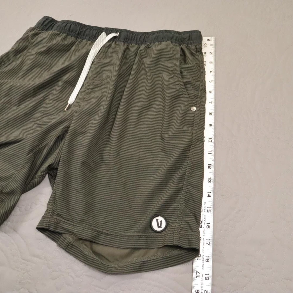 Brand: Vuori. Style: Mens lined athletic running and training shorts with elastic drawstring waistband. Color: Green with subtle horizontal micro stripe pattern. Logos/Branding: Circular Vuori V logo patch at left leg hem; small Vuori woven tab at side of back pocket; interior care and fabric content label with Vuori branding, CA# 32350, RN# 156509, style code V302, PO# 00262, and Made in China text. Size on tag: Mens Large. Material: Shell 88% polyester and 12% spandex; soft knit inner liner fabric. Features: Elastic waistband with contrast white drawstring, two front hand pockets, single back patch pocket with button closure, built-in boxer-brief style liner, lightweight stretch performance fabric suitable for running, training, gym workouts, or general activewear. Country of origin: Made in China.