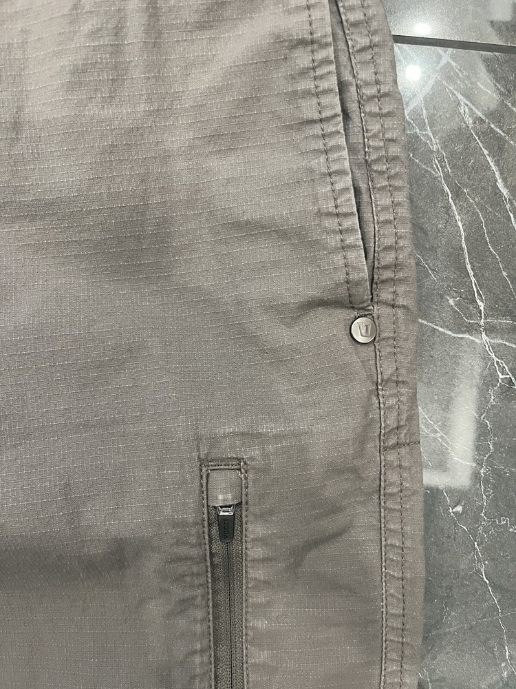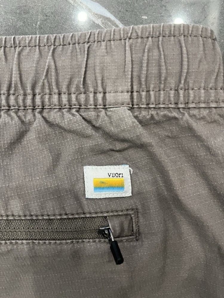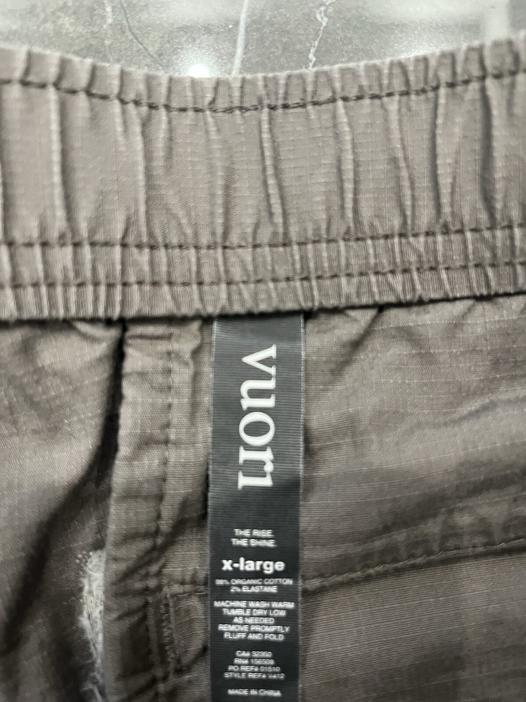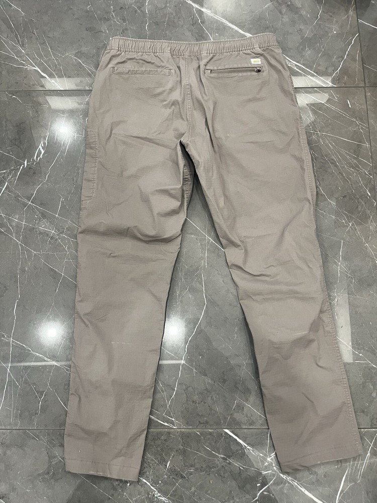 Waist is 34 with stretch and inseam is 29 Small white sport on front leg pictured The product is a pair of Vuori men's Ripstop pants in size XL. They are gray in color and classified as khakis style. These pants are designed for activewear purposes and are part of the men's clothing department. The size type is regular.