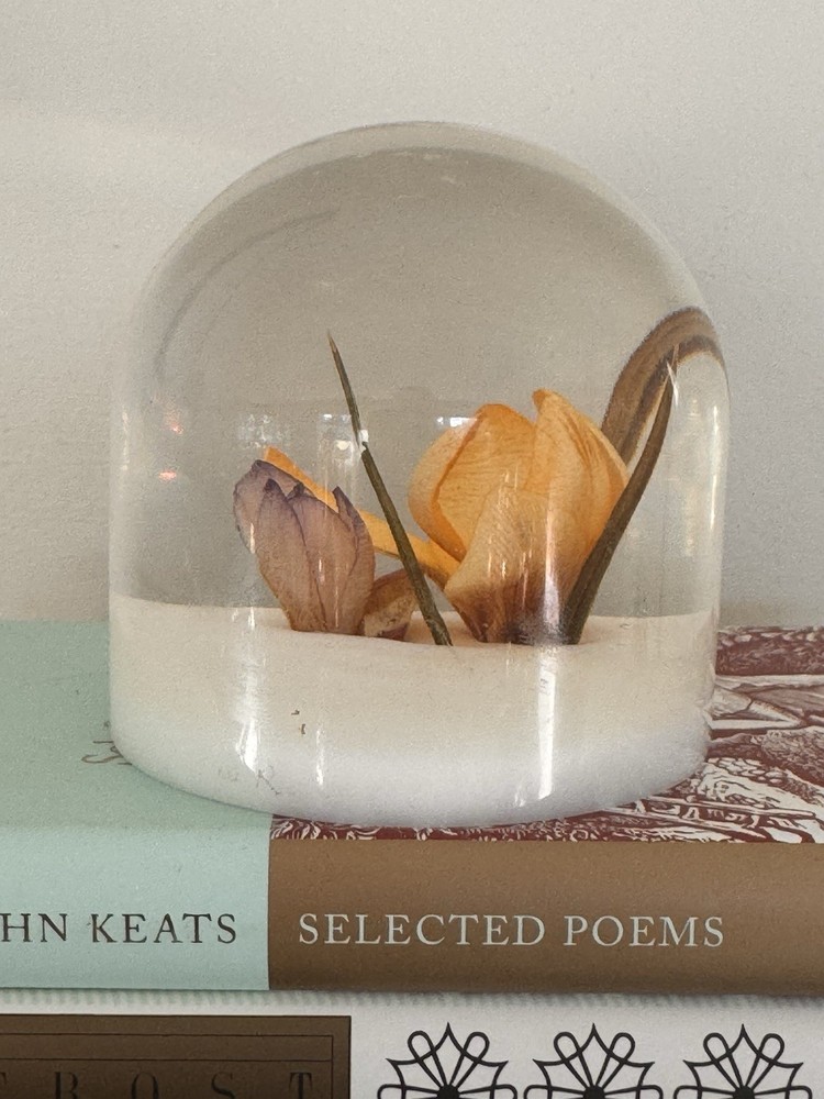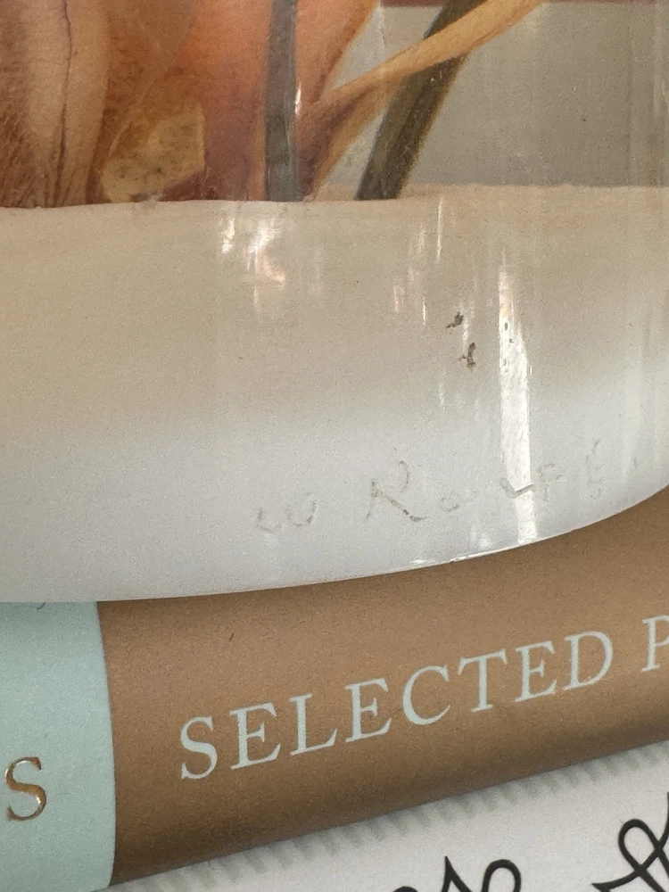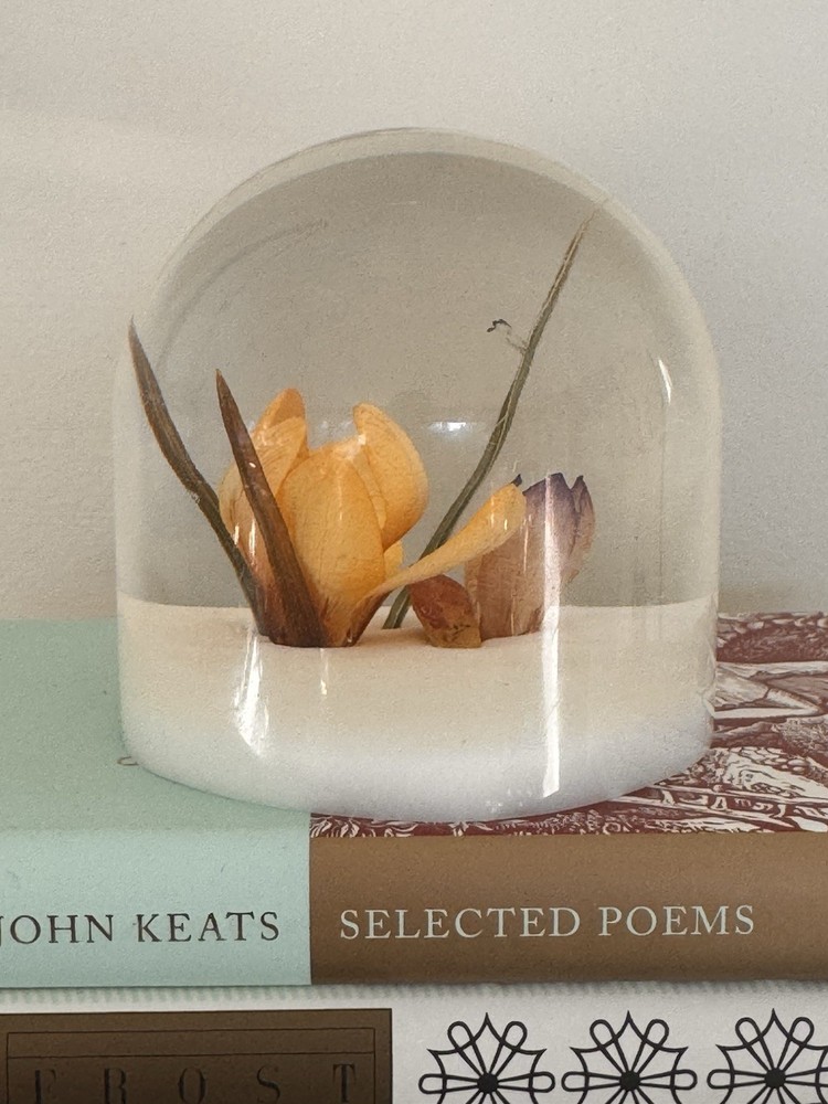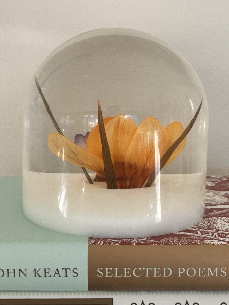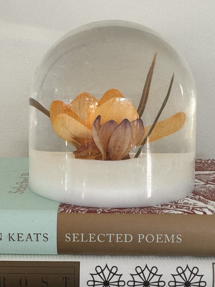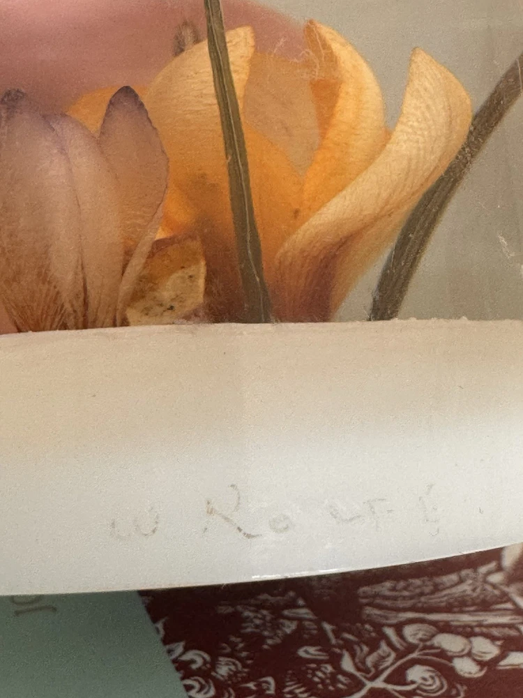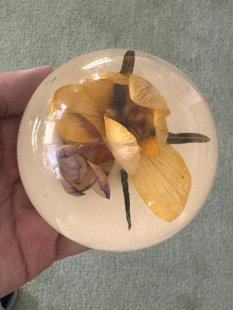 Beautiful, unique lucite/acrylic domed paperweight with preserved artificial flower bloom inside. The flowers are yellow and purple crocus…the first signs of spring. I have note seen another W. Rolfe paperweight with the milky white “snow” on the base. Signed “W. Rolfe” (etched) on side. This item is in excellent vintage condition. There is one scuff as shown in picture. No other damage, scratches or scuffs noted. Please zoom all photos for more details. Measures approximately 3 inches tall and 3 inches bottom diameter.