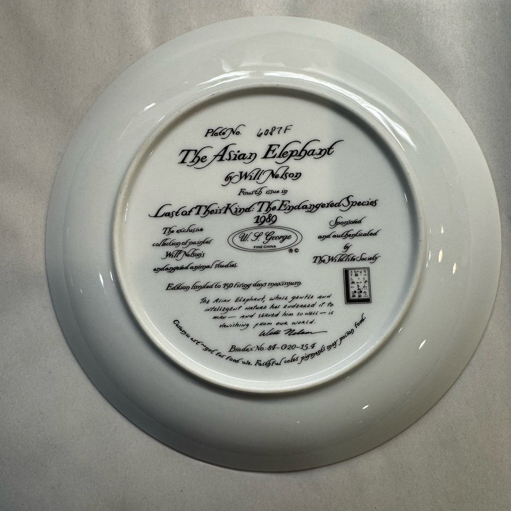 This collector plate from W S George features the Endangered Species Asian Elephant Limited Plate from 1989. Crafted from high-quality ceramic, this plate is a beautiful addition to any collection. The white background highlights the intricate details of the design, which showcases the majesty of the Asian elephant. This vintage piece was produced using traditional art pottery techniques and is a great example of American culture. The plate is perfect for display or as a unique gift for any collector. Add this rare and beautiful piece to your collection today!