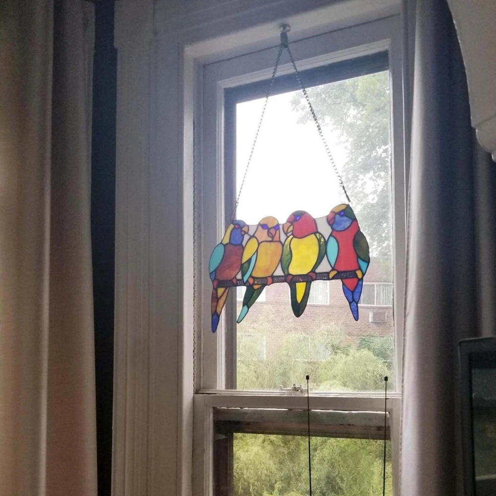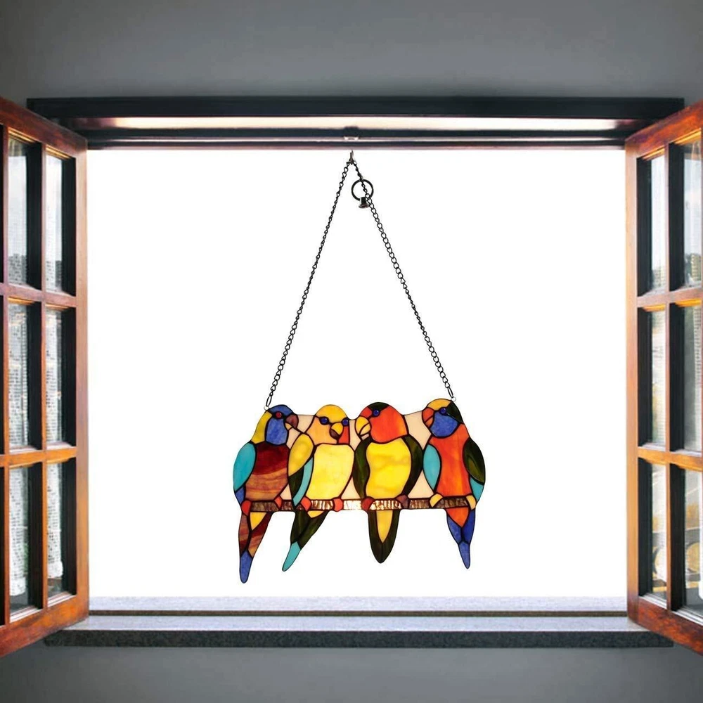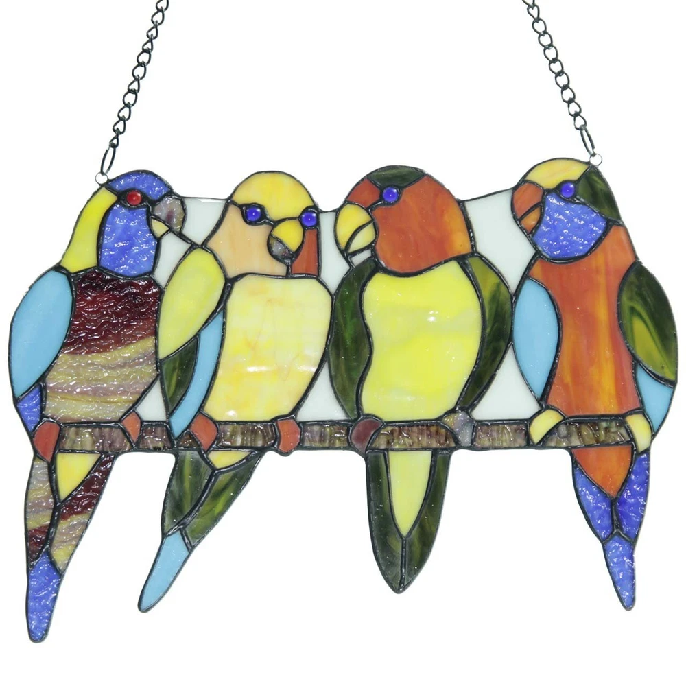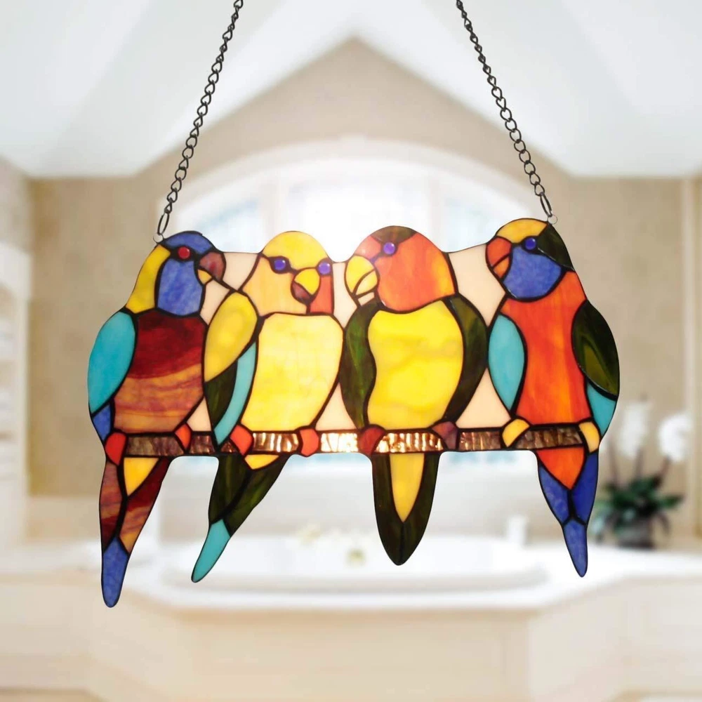 There are 4 tropical birds on the wire. each bird has a different color. you will receive many compliments when you hang it at your home. Approximate Dimensions: 14.5-inch wide, 10.5-inch tall. Net weight: 2 lbs; there is protective oil on the panel, it can easily volatilize in a few days, you also can clean it with towel. EXCELLENT DESIGN: 80 PCS hand-cut glass sheets are soldered together, having this on a glass window at work and get compliments daily about how beautiful it is and how it puts everyone in a tropical mood! QUALITY CHAIN: 30 inches black pendant chain, uses electroscopic paint for flawless rust prevention; SAFER PACKAGING: well packaged with honeycomb board inside, ensure safety to be delivered Every windows panel was handmade by skilled craftsman with over 10 years experience in Tiffany-style window panel making