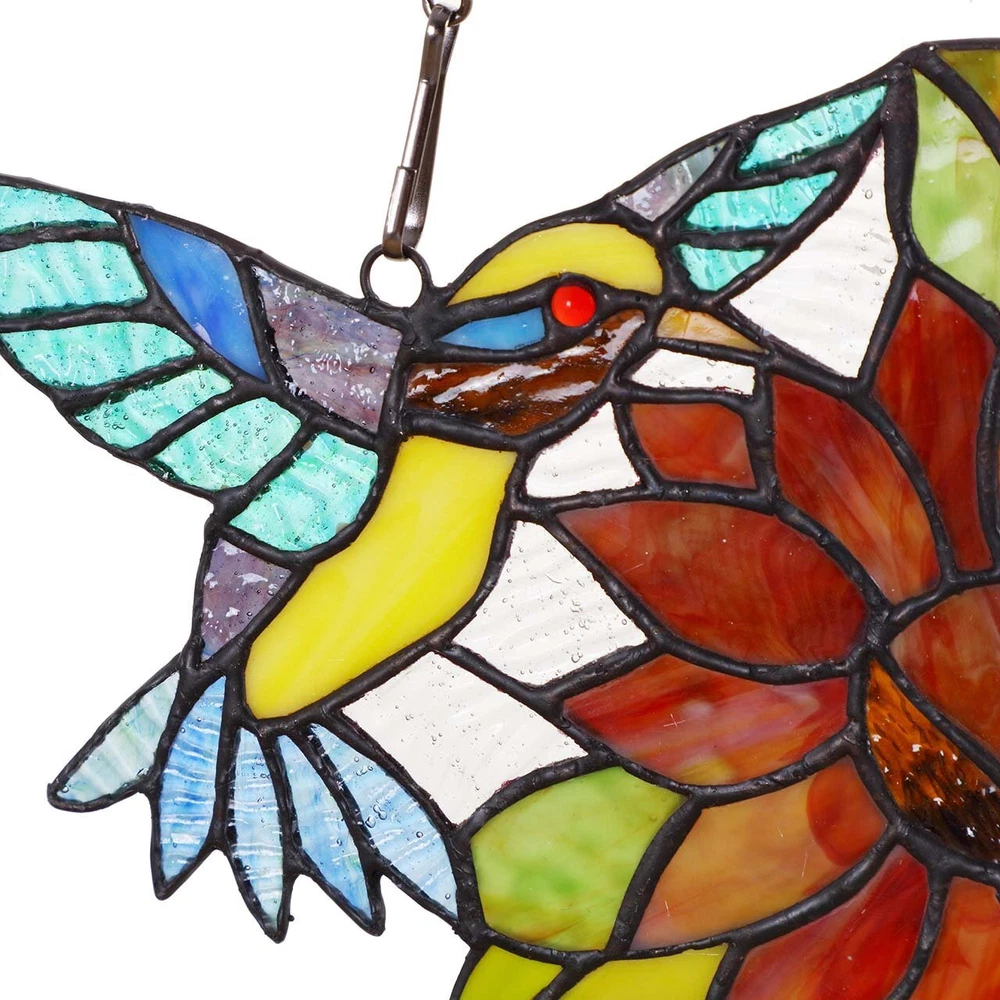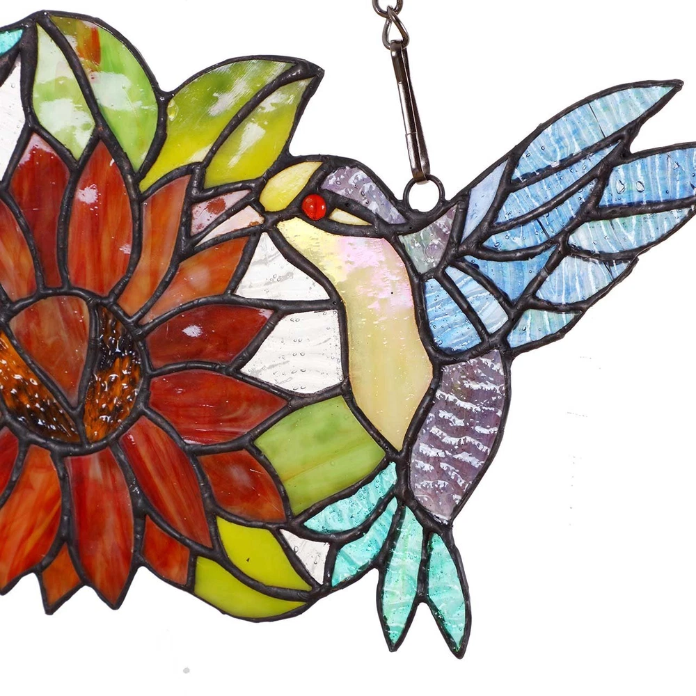 The panel comes with 2 hummingbirds gather honey from the sunflower, how beautiful it is. Size: 15-inch in length, 7-inch in height. Net weight: 1 lbs; EXCELLENT DESIGN: The panel comes with 2 hummingbirds gather honey from the sunflower, how beautiful it is. QUALITY CHAIN: 30 inches black pendant chain, uses electroscopic paint for flawless rust prevention; HANDMADE: Tiffany-style window panel was built by hand with numerous pieces of cut and polished Stained Glass. Individual pieces were fused together using a recent development in stained glass called the copper-foil technique. SPECIAL GIFT: This is definitely a special gift for your lover, parents, children, clients and colleagues; It perfectly fits for decorating your house.