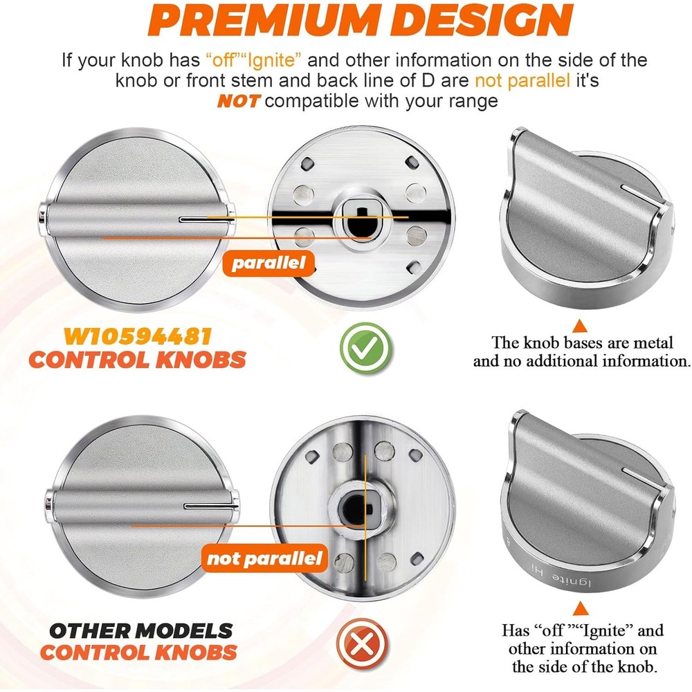 Description: 【UPGRADE DESIGN】 The premium whirlpool gas stove knobs replacement W10594481 designed with stainless steel Stem is reinforced with aluminum ring, The surface of knobs is made of frosted material, which has higher heat resistance than other knobs. 【 PERFECT FIT】 Our W10594481 for whirlpool gas stove knobs replacements with a 0.18in "D" axis, 90 Degrees to The Rotating Surface. Replaces Part: W10594481,3281332 WPW10594481, AP6023301, PS11756643, EAP10594481, B01KR8F5EU, WCG97US0DS00, WCG97US6DS00. ⚠️ Not for WCG97US0DS & models starting with WEG7 (Before use, please confirm the direction of your stove and insert the inner core. ) 【 BUY WITH CONFIDENCE】 We’re confident in the design and quality of whirlpool stove knobs replacements, For any reason you're not completely satisfied, you can ask for a replacement or full refund in 1 Year. If you are not sure whether our range knobs correctly fit your appliance, please feel free to contact us or ask a question through eBay. Package Included: 1/2/4/5 x Range Control Knob W10594481 Part Number W10594481 replaces WPW10594481, AP6023301, PS11756643, B01KR8F5EU. Color: Stainless Steel Model Number Description: Compatible with Whirlpool models starting with WCG97( Not for WCG97US0DS, not suitable for models starting with WEG7. ) - WCG97US0DS00 WCG97US6DS00 WCG51US0DB00 WCG51US0DS00 WCG51US0DW00 WCG55US0HB00 WCG55US0HS00 WCG55US0HW00 WCG75US0DB00 WCG75US0DS00 WCG51US6DB00 WCG51US6DS00 WCG51US6DW00. On Jan 7, 2026 at 00:27:42 PST, seller added the following information: