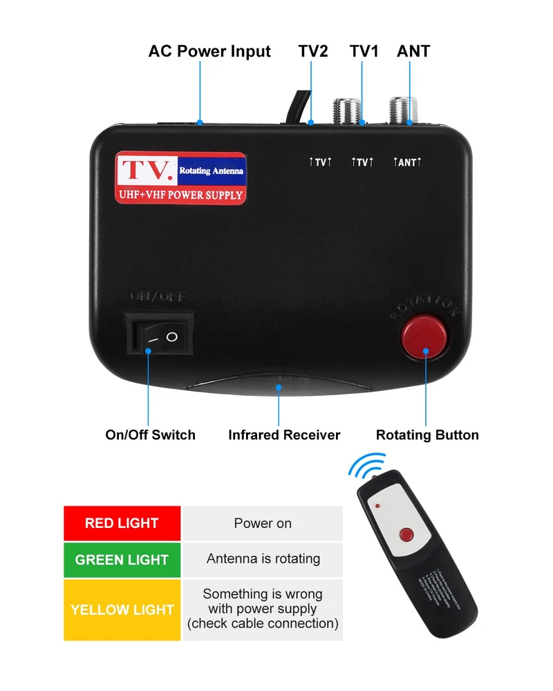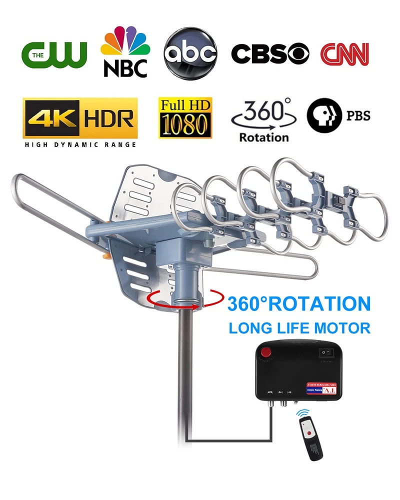HDTV Without A Monthly Bill--Antenna TV digital hd outdoor provides high resolution HDTV 4K,1080p,1080i,720p for local FREE channels, local news, sports programs.Saving your mothly fee, providing you with the well experience to watch live TV! Support Dual TV Output--Outdoor antenna support 2 TVs at the same time without a splitter. No special adapter needed.Additionally, our digital antenna contains a wireless remote control, you can adjust the antenna at home easily. 200 Miles Long Range Reception--Built-in 360 degree motor can help to reach a wider area by pressing the button to rotate the digital antenna.Built in Super Low Noise Amplifier,includes 60ft RG6 HD TV antenna coaxial cable. Weather Resistant -- There is a lightning protection system in the outdoor hd antenna,superior construction to withstand tough outdoor weather conditions.So this amplified hdtv antenna can play in an important role in the outdoors. What’s in the package -- Clear TV antenna with wireless remote, power supply adapter and 60ft RG6 coaxial cable and J-shaped mount pole.Snap on elements no tools required,easily mount our antenna on roof, attic, chimney, eave, mast or outside the house.