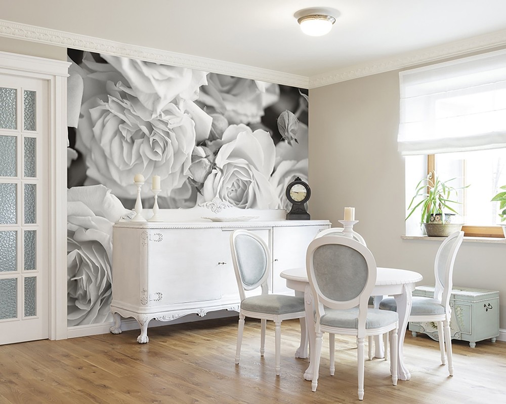 Create a romantic scene with this black and white rose mural. The large scale print is a stunning design. Grey petals wall mural comes on 6 panels. Printed on nonwoven material Paste not included Comes with 6 panels Measures 9Ft 10in x 8Ft 1in when assembled