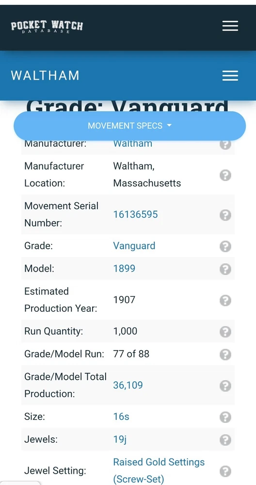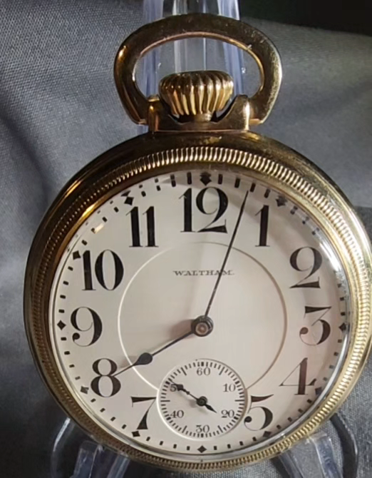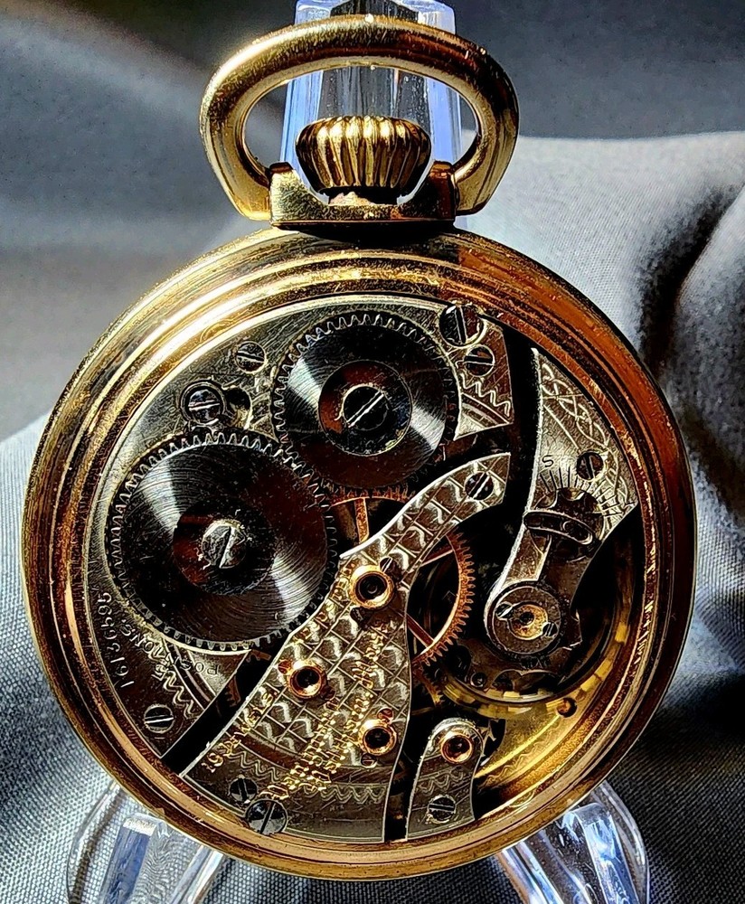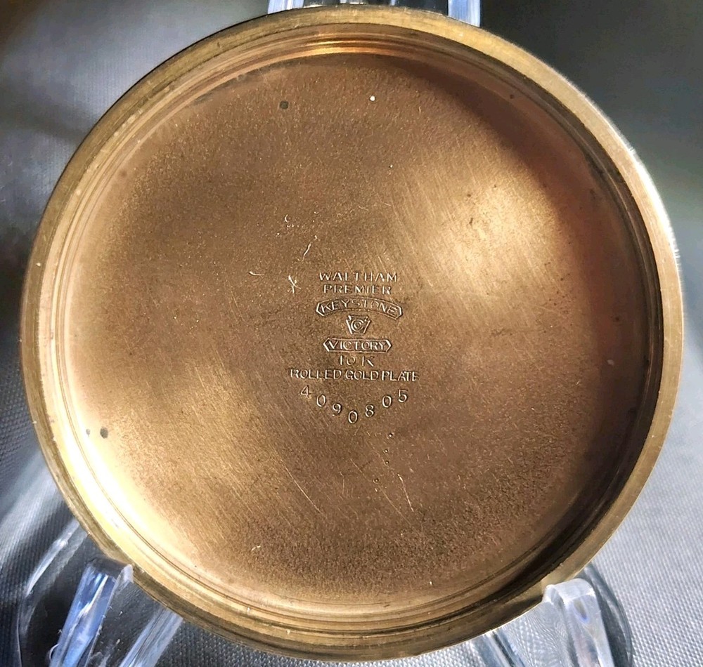 SERIAL# 16136595 ORIGINAL WALTHAM CASE, EXCELLENT CONDITION. FANCY GOLD LETTERING ON MOVEMENT. MANUFACTURED IN 1907, 119 YEARS OLD. Waltham Vanguard model 1899, 16s, 19 jewels the watch sets and winds.Crystal is excellent normal wear for 125-year-old watch. This Rail Road Grade watch is a good runner.10 karat gold filled, it would look beautiful at anybody's vintage pocket watch collection. Serial# 16136595 Thank you for showing interest All watches are sold as is and no returns I do not guarantee the functionality of anything, I am not a watchmaker and I do not fix watches I just sell them. If I say they're in new condition, that's because they are, with no guarantees of functionality whatsoever at the time of delivery, just the fact that shipping is used can give rise to all kinds of unrelated damage problems. Shipping is hard on watches. Thank you for your understand