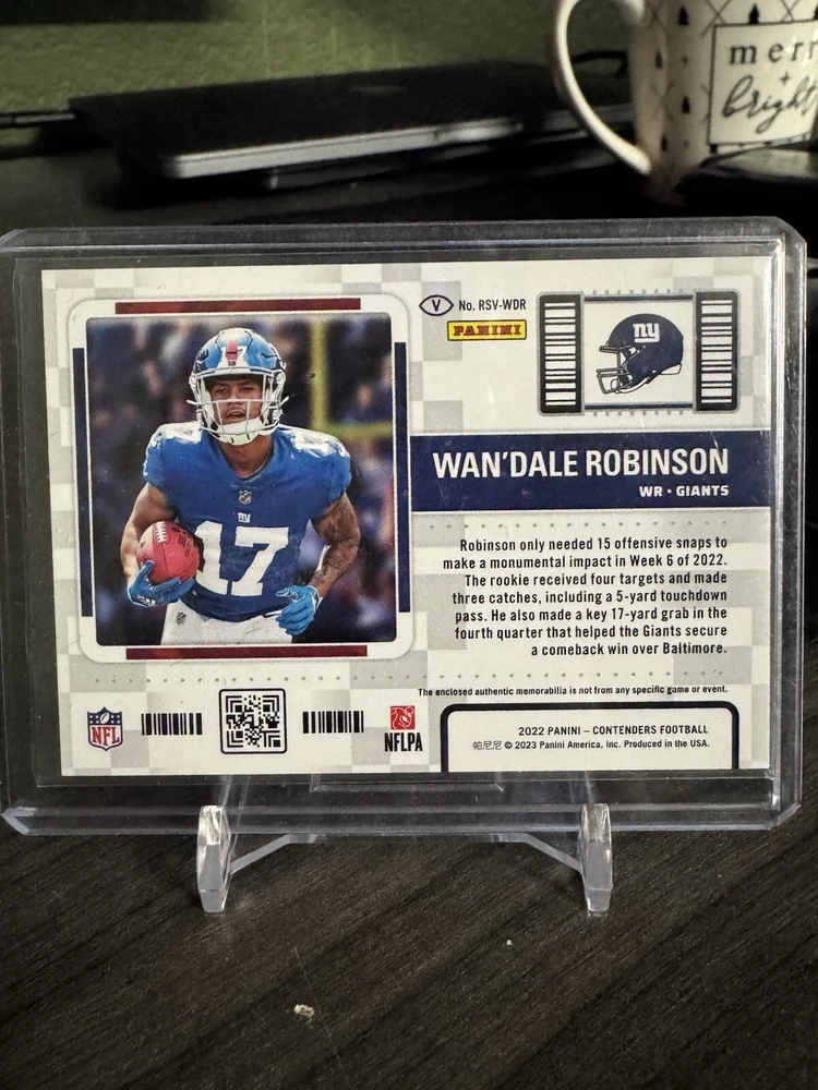 This exclusive 2022 Panini Contenders Rookie Patch card features Wandale Robinson, a rising star in the National Football League (NFL). With a green variation rookie patch and a unique memorabilia design, this card is a must-have for any serious collector. The card is in excellent shape, with a card size of standard and a card number of #RSV-WDR.