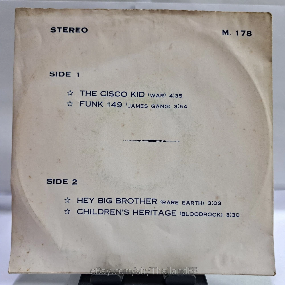 Welcome to The World of ""Thailand Vinyl Records"".Very rare and beutiful picture of cover. Check everyday . This item is for a true 7" single collector. It was printed and sold locally as limited EP back in the early 70's. Only few copies were spread outside Thailand. Most professional record collectors know that it is scarce nowadays and is absolutely a collector's item. If you know a UK magazine called RECORD COLLECTOR then you must have read many articles mentioning THAILAND EP and this is it !!! Here is your chance to own one-of-a-kind piece of Asian's 7" single history. Description Records !!! DETAIL SONG and ARTIST !!! Side A: A1 = War - The Cisco Kid / A2 = James Gang - Funk #49 Side B: B1 = Rare Earth - Hey Big Brother / B2 = Bloodrock - Children' Heritage Label&Catalogue number : : M178 Country of release : THAILAND Condition (Sleeve/Disc) : VG / VG+ and pls see picture too. Shipping I am seller in Thailand not USA.So I can not ship 4$ as policy pls understand this real rate from oversea . Price for shipping(Airmail )&Packaging to worldwide only US 14.99 USD .Except Asia and JAPAN only 14.99 USD. You can save cost for combine shipping only 3 USD$ per each. 2xEP=17.99 USD$ , 3xEP=20.99 USD$ . My package very safety by big cardboard don't worry about your's EP/PS/LP. Time delivered 21-45 days . ***All item : have tracking system no need add money*** **For normal shipping (Airmail).Time delivery to ITALY maybe use 1-2 Months, France use 1-2 Months.But Don't worry item will arrived to you sure!!.For fastest and High value you can use Express Mail Service cost for1 EP =39 USD.EP will arrived to you within 5-7 Days. ***All shipment have fully tracking system *** Payment PAYMENT : I accept the follow payment by eBay managed , . My ID eBay provide by eBay .Account will be provide at the end auction.Charges to be covered by winner. If you have question pls email to me anytime i can answer immediatly. I have many EP,PS 7" Thailand Pls Click => View seller's other items Check my feedback , I care and honest all customer.I welcome 0 feedback but contact me first if you will bidding. Good Luck !!!! and Enjoy . 45 RPM / EP/ LP Grading Scale: Mint /NM/ Excellent(VG++) /VG+/ VG /G+ /Good(G) / Fair / Poor / Bad (According Record Collector Magazine (UK)) LOT149-17M178