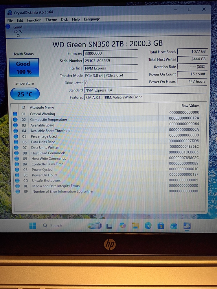 WD GREEN 2TB PCIe 3.0 x4 NVME M.2 2280 SOLID STATE DRIVE - 100% - 447 Hours ✅ Pulled from a lightly used HP 15-fd0123dx 100% HEALTH with only 447 power on hours Model: WD Green SN350 S/N: 25103L803539 MFG Date: March 7, 2025 Please ensure compatibility with your device before purchase. *you will receive the same item in the pictures* SHIPS SAME OR NEXT DAY WITH SHIPPING!