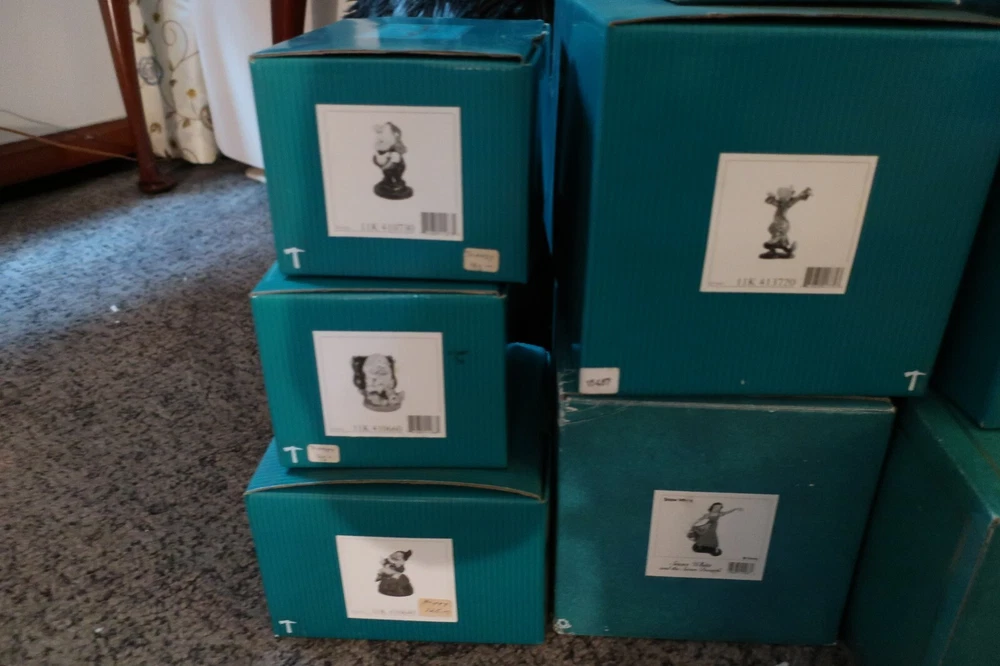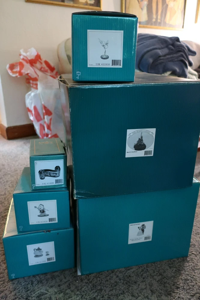 This lot includes all the original boxes from the WDCC Beauty And The Beast collection. The figurines were manufactured in Thailand in 1995 and stand at a height of 10.5 inches. The brand is Walt Disney Classic Collection and the franchise is Disney. These contemporary collectibles are a must-have for any Disneyana enthusiast.