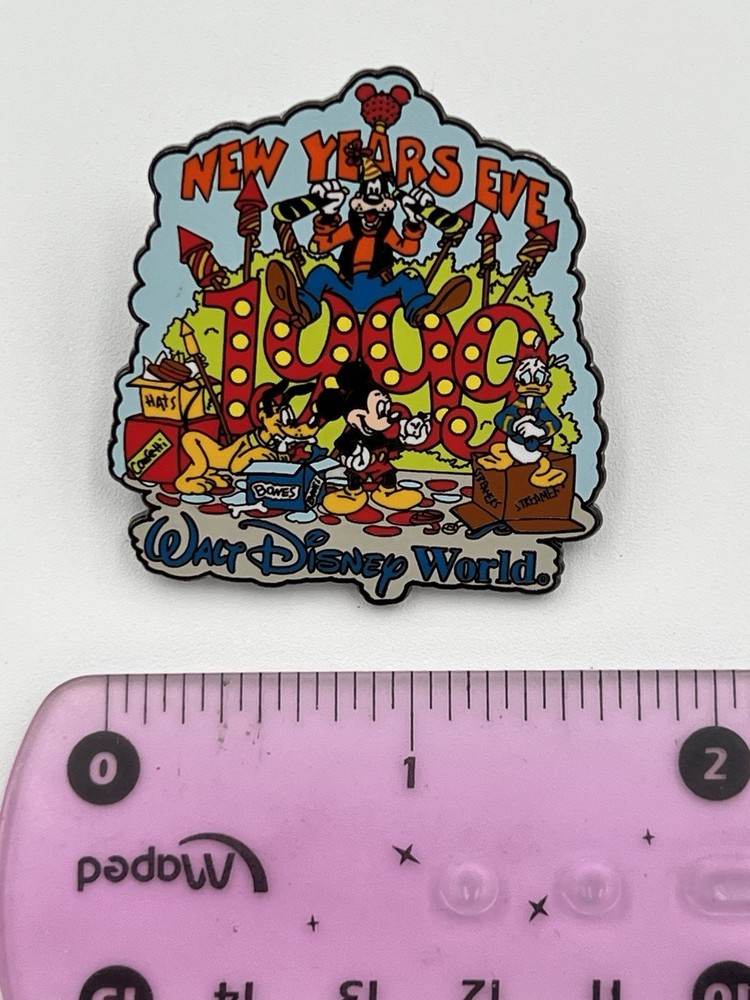 Celebrate the millennium with this limited edition WDW New Years Eve 1999 Fab 4 pin, one of only 5000 produced. This collectible features the iconic characters of Disney, Mickey Mouse, Minnie Mouse, Goofy, and Donald Duck, all ready to ring in the new year. This pin is a must-have for any Disney fan and is a great addition to any collection. The pin features a red and black design with glitter accents, giving it a festive look. It is in excellent condition and ready to be added to your collection. Don't miss out on this rare piece of Disney history.