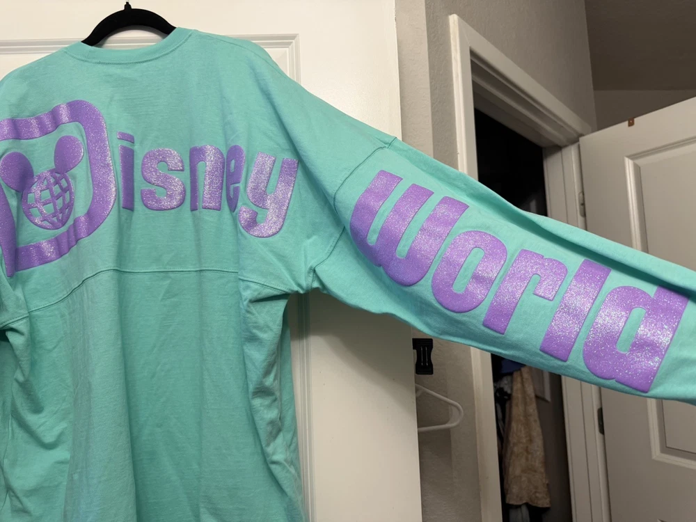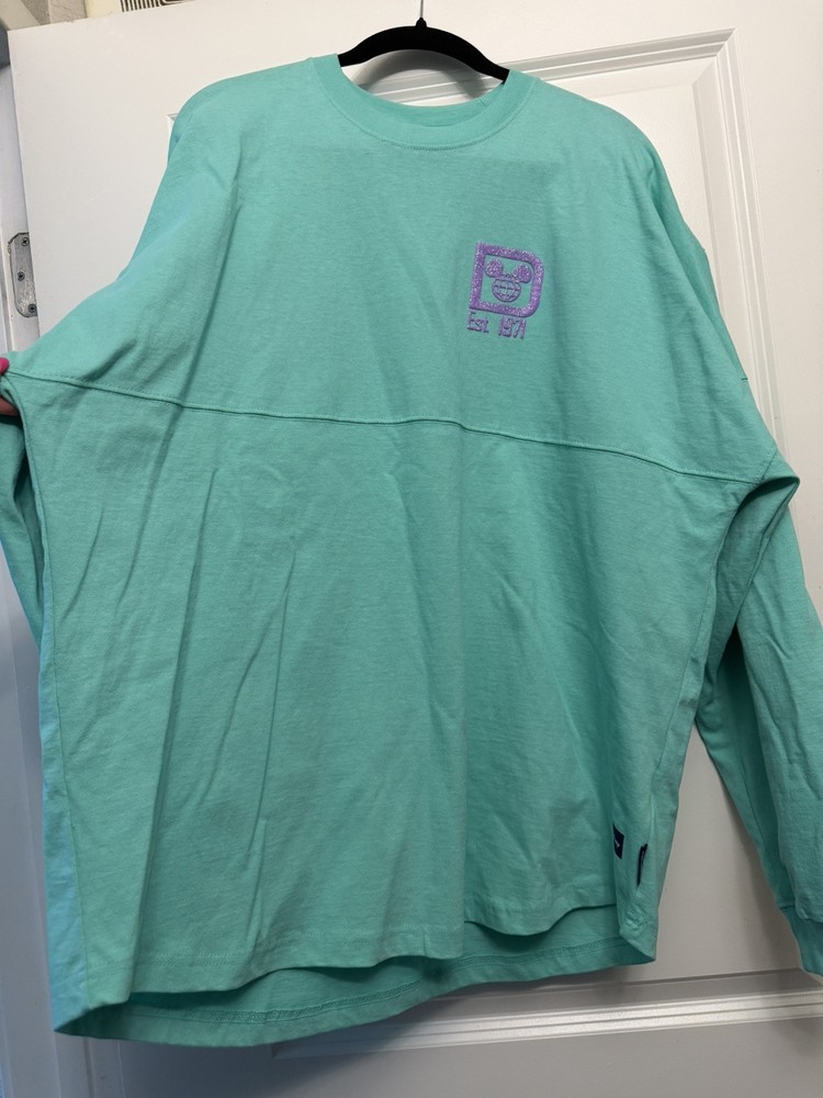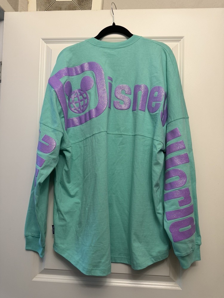 The WDW Walt Disney World Spirit Jersey Disney Parks Long Sleeve T-Shirt in size XL is a teal and purple shirt featuring the iconic Disneyland characters and theme. This unisex shirt is suitable for adults and perfect for any Disney fan looking to add a unique and stylish piece to their collection. The official Spirit Jersey brand ensures high quality and authenticity, making it a must-have for any Disney Parks enthusiast. Teal/aqua and purple colors could represent Ariel or Sulley, etc. Purple is glittery but glitter does not come off with touch, it is part of the fabric. Measurements: Pit to pit: 28” Length: 33”