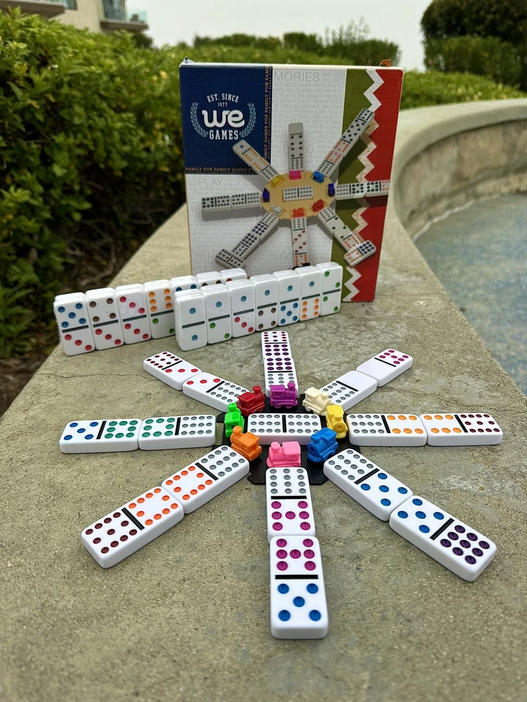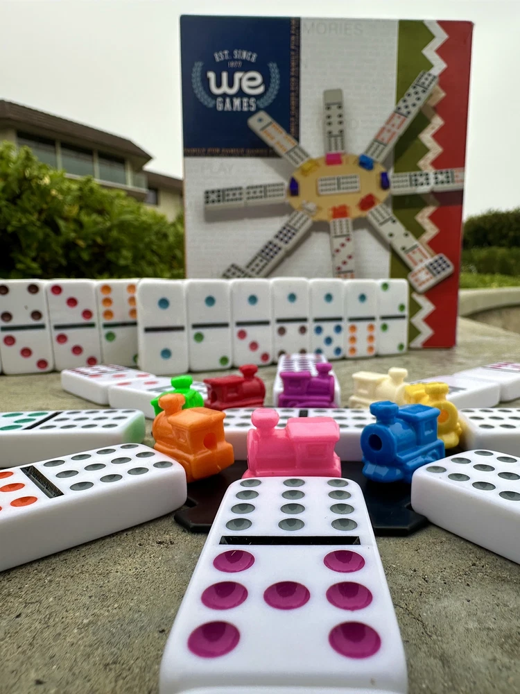 The game Mexican Train has nothing to do with Mexico, it was actually developed by Roy and Katie Parsons in 1994. The Parsons were inspired by the game Pai Gaw, a chinese domino game. Dominoes are used to play games like All Fives, Mexican Train, Fortress, and Texas 42, just to name a few. They can also be used to create an awesome toppling effect. So, whether you are using it for educational purposes or as a pub game, this set is sure to be everyone’s favorite! Wood Expressions Inc Our eBay Store Contact Us The game Mexican Train has nothing to do with Mexico, it was actually developed by Roy and Katie Parsons in 1994. The Parsons were inspired by the game Pai Gaw, a chinese domino game. Dominoes are used to play games like All Fives, Mexican Train, Fortress, and Texas 42, just to name a few. They can also be used to create an awesome toppling effect. So, whether you are using it for educational purposes or as a pub game, this set is sure to be everyone’s favorite! Details ALL ABOARD: 91 double twelve ivory colored heavy-duty plastic dominoes with assorted color dots in a black and red vinyl case with snap closure. Single domino measures 2.04 x 1.02 x .4in. and entire set weighs at 4.45 lbs. Enjoy the timeless game with 9 colorful train markers and train. With the quality and superior feel of the thick double twelve dominoes you can rest assured that they will provide you with hours of fun. FUN FOR EVERYONE: The game Mexican Train has nothing to do with Mexico, it was actually developed by Roy and Katie Parsons in 1994. The Parsons were inspired by the game Pai Gaw, a chinese domino game. Dominoes are used to play games like All Fives, Mexican Train, Fortress, and Texas 42, just to name a few. They can also be used to create an awesome toppling effect. So, whether you are using it for educational purposes or as a pub game, this set is sure to be everyone’s favorite! TEACHER’S PET: While this is a great game for families and friends of all ages, it is an excellent tool for teachers. Many different skills can be taught playing domino games, such as math and strategy skills, to name a few. Teachers prefer this game because of the sturdy wooden case and uncommon color of the dominoes. BECAUSE PLAYING GAMES IS GOOD FOR YOU. Did you know that playing board games can teach important social skills like verbal communication, being patient, sharing, taking turns and enjoying interactions with others? Games like Dominoes foster the ability to focus and lengthens the players attention span. Playing games is an easy and excellent way to spend unhurried, enjoyable time together. They are also rich in learning opportunities. Black and red vinyl case with snap closure WARNING: This product can expose you to chemicals including Di(2-ethylhexyl)phthalate (DEHP) which is known to the State of California to cause cancer and birth defects or other reproductive harm. For more information go to www.P65Warnings.ca.gov