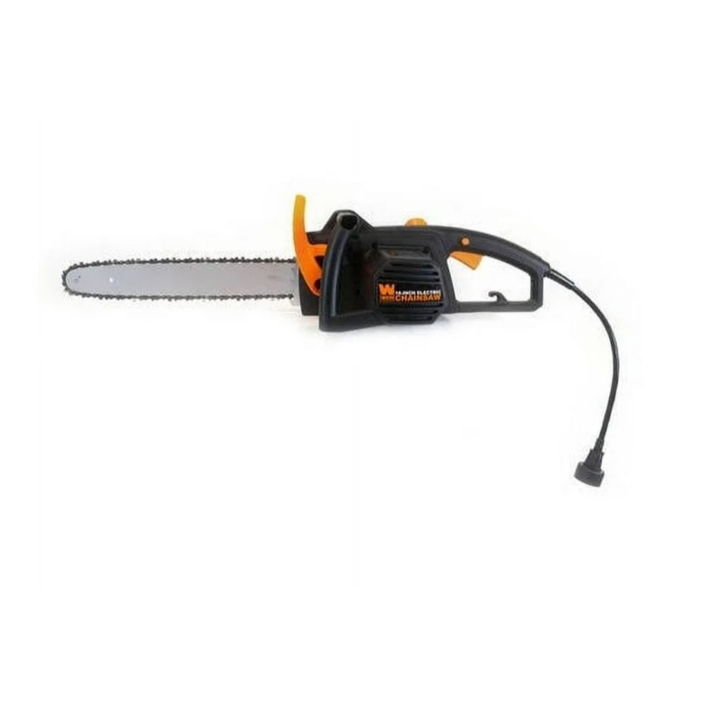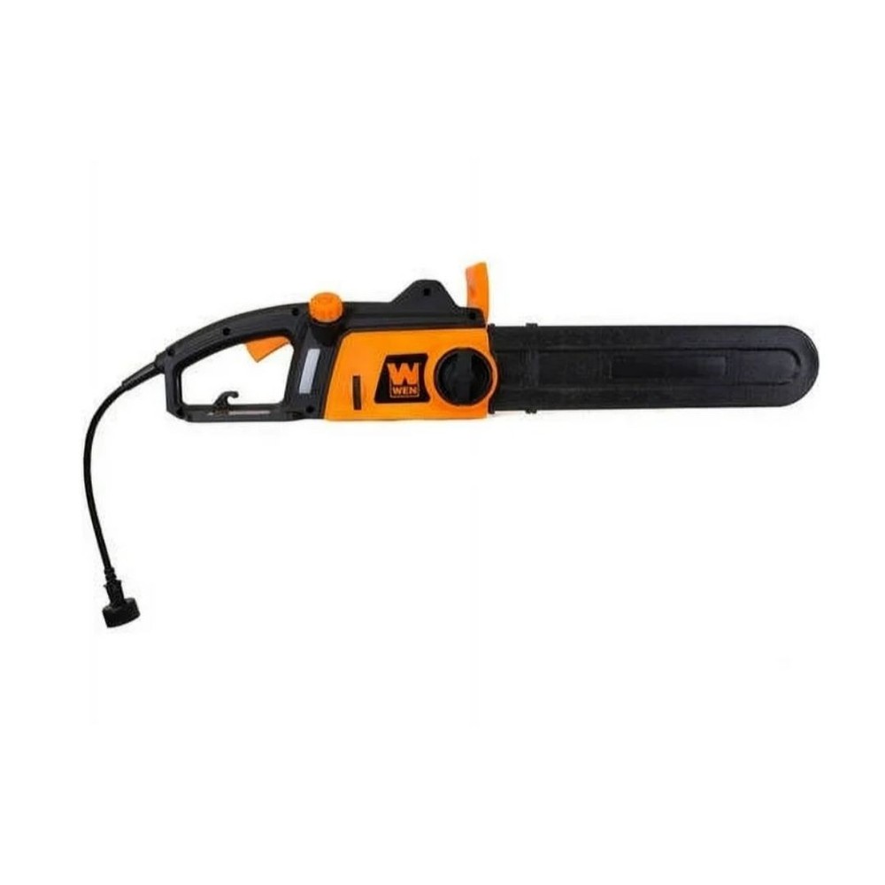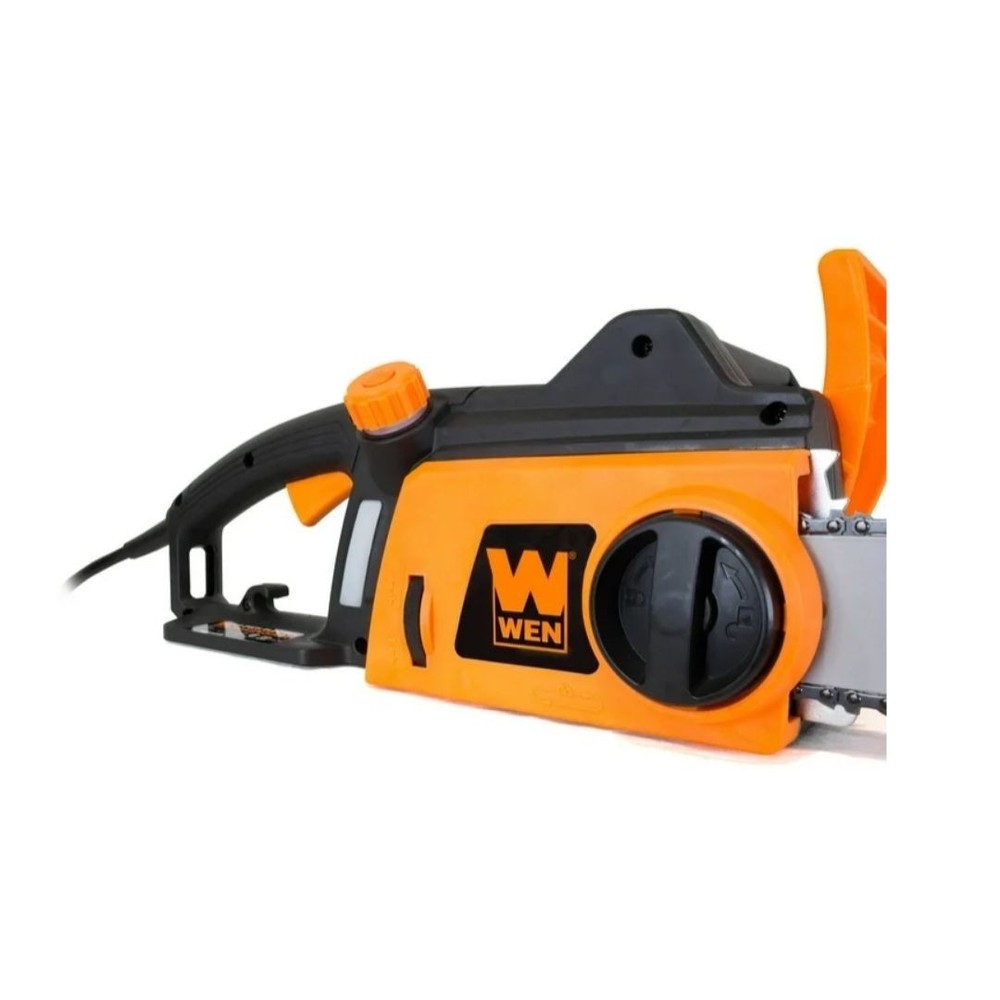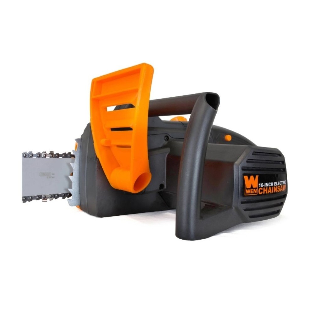 About This Product The WEN 16 in. Electric Chainsaw provides over 12 Amp of sawing power, making easy work out of any tree, bush or branch that gets between you and that perfect lawn. The 16 in. chain runs at speeds of up to 44 ft. per second while the lightweight design limits fatigue during operation. Simply plug the cord into the power source of your choice and start chopping. The auto-oiling system lubricates the guide bar and chain as you cut to elongate the life of both the blade and the saw itself. The cable strain relief notch helps wrangle extension cords to keep the unit plugged in. With tool-free chain changes and emission-free operation, the WEN 16 in. Electric Chainsaw is the perfect addition for any yard. And, because it's a WEN product, your chainsaw comes backed by a two-year warranty, a nationwide network of skilled service technicians and a helpful customer phone line. Highlights 12 Amp motor rotates the chain at up to 44 ft. per second Lightweight design limits fatigue to the user Auto-oiling system lubricates itself to elongate the saw's life span Tool-free chain changes make for easy and fast chain replacement Requires no gasoline for exhaust-free operation Cable strain relief notch keeps extension cord securely attached Wraparound front handle allows operator to leverage the machine from different angles Front hand guard protects user from flying debris Safety button prevents accidental starting Cutting bar sheath protects equipment and users when not in use Protected by a 2-year limited warranty Dimensions Bar Length (in.) 16 in. Chain Size 16 in. Maximum Cut Diameter (in.) 14 in Maximum extension cord length (ft.) 100 ft Details Amperage (A) 12 A Chain Pitch 3/8 in. Chain Speed (mps) 13.4 Chainsaw Bar Size Medium Chainsaw Type Hand Chainsaw Color Family Orange Condition New Cord Length (ft.) 1.25 Drive Links 56 Features Antivibration, Tool-Less Chain Tensioning Filter Type No Filter Gauge .05 Handle Type Rear Handle Chainsaw Included Chain, Scabbard Outdoor Power Combo No Additional Tools Power Type Corded Product Weight (lb.) 10 lb Refurbished No Returnable 90-Day Torque Maximum (Nm) 2.2