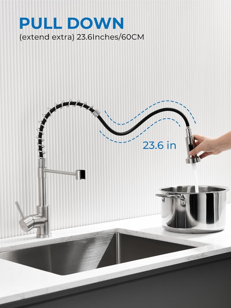 WEWE Kitchen Sink Faucet, Faucets with Pull Down 2 Brushed Nickel Product Details Brand: WEWE Recommended Uses For Product: Kitchen Mounting Type: Deck Mount Finish Type: Brushed Material: Stainless Steel Color: 2 Brushed Nickel Number of Handles: 1 Included Components: Kitchen faucet, Mounting accessory, Weight, Instruction manual Hole Count: 1 Special Feature: Pull Down Sprayer, 360 Swivel Handle Type: Lever Style: 2 Pull Out Installation Type: Single Hole Maximum Flow Rate: 1.8 Gallons Per Minute Valve Type: Disc Valve Model Name: WEWE Kitchen Sink Faucet Number of Pieces: 1 Handle Material: Metal Spout Height: 4.6 Inches Spout Reach: 9.8 Inches Item Weight: 4.1 Pounds Handle Location: Left/Center/Right Spout Design: Pull Out Hose Length: 23.6 Inches Is Electric: No Manufacturer: Aonecer Part Number: A90190502BN Item Weight: 4.06 pounds Package Dimensions: 16.69 x 13.11 x 2.52 inches Item model number: A8056-07-05CP Finish: Brushed Shape: Gooseneck Item Package Quantity: 1 Special Features: Pull Down Sprayer, 360 Swivel Batteries Included?: No Batteries Required?: No Brand: WEWE Recommended Uses For Product: Kitchen Mounting Type: Deck Mount Finish Type: Brushed Material: Stainless Steel Color: 2 Brushed Nickel Number of Handles: 1 Included Components: Kitchen faucet, Mounting accessory, Weight, Instruction manual Hole Count: 1 Special Feature: Pull Down Sprayer, 360 Swivel Ease of Use: The pull down kitchen faucet can be extended to maximum pull out length 23.6 inches, meets your requirement for a larger cleaning area. You can fill the water or do some cleaning outside the kitchen sink. 360°Swivel: 360 degree rotating spout can be easily move smoothly, which is suitable for double sink. You can use the brushed nickel kitchen faucet in different directions of the sink for different tasks, without moving your feet all the time. Dual Functions: Different water mode functions of the kitchen faucets with pull down sprayer can fulfill different tasks requirement. The high quality nozzle of kitchen faucet offers aerated stream for cleaning and non-splash powerful spray for rinsing, just enjoy your kitchen with this commercial kitchen faucet. Safe Sink Faucet: This kitchen faucet with sprayer is designed specially that cold water comes out when pulling forward, is more safer comparing to most water faucet in the market. CARE MUCH MORE FOR YOUR SAFETY, especially for CHILDREN! A Perfect Fit Kitchen Sink Faucet: Your faucets for kitchen sink with commercial style spring design and the compact height 17”, can easily matches all decorating style and place, such as farmhouse kitchen faucet, rv kitchen faucet, laundry faucet, camper kitchen faucet.