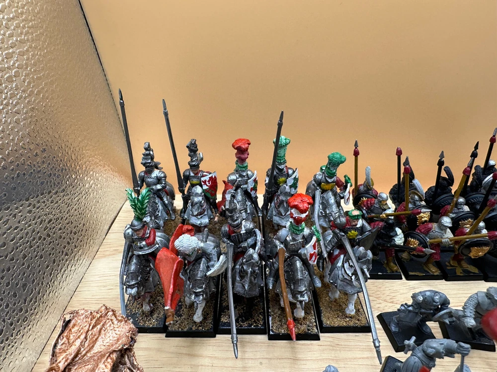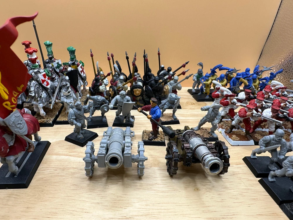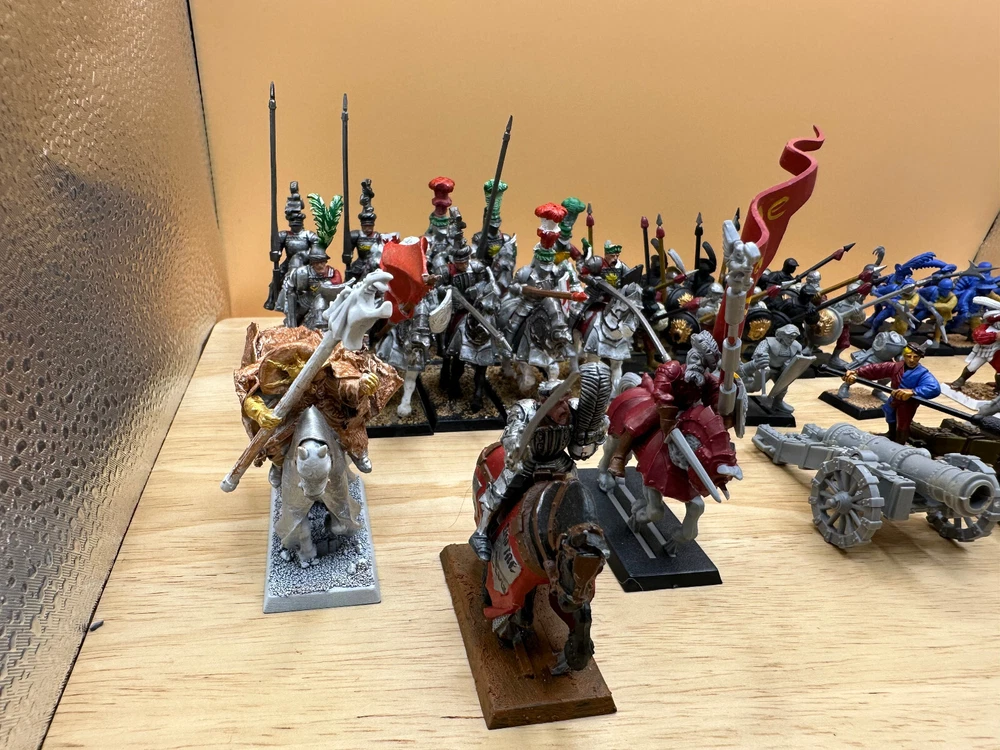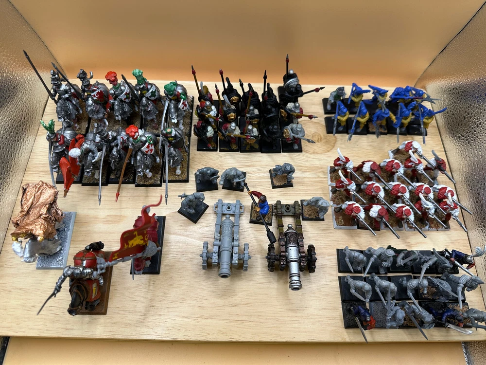 WFB Old World Warhammer Empire Starter Army Games Workshop OOP GW Reiksguard 1 x Mounted Standard 1 x Mounted Captain 1 x Mounted Wizard (Converted Balthasar Gelt) 2 x Great Cannon & 6 Crew (Need Parts) 10 x Reiksguard Knights 15 x Swordsmen 10 x Handgunners 16 x Spearmen 10 x Halbediers (Need Parts) (Some items may need TLC/Parts; See Photos)