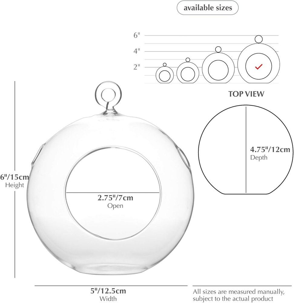 Store New Arrivals Add to Favorite View Feedback Contact WGV Hanging Terrarium Globe, Width 5", Height 6", DIY Air Succulent Planter, Clear Glass Vase Orb with Flat Bottom, Candle Holder for Windowsill Outdoor Garden Decor, 1 Piece Description Item model number HCH0105 Item Package Quantity 1 Style Garden Assembly required No Batteries required No Is Discontinued By Manufacturer No Product Dimensions 6"L x 5"W x 6"H Material Glass Country of Origin China Specific Uses For Product Indoor Item Weight 5.3 ounces Color Clear Shape Round Brand WGVI Specific instructions for use Indoor Included Components 1 piece, 1 hook top Special Feature Lightweight Tank Volume 2 Fluid Ounces Size 5" Included: 1 piece carefully packaged, 1 hook top, flat bottom, accessories not included Size: width 5"(12.5 cm) height 6"(15 cm) open 2.8" varies slightly due to handmade glass Feature: 2 side holes on each plant hanger for easy watering, a flat bottom to place on surfaces Use: container of succulent, airplant, lights, candle holder, Ideal for DIY mini garden decoration Product Description HCH0104 Welcome to WGV store, Wholesale Glass Vases International (WGV International) Our goal is to deliver the greatest variety of pieces to offer our customers with both "High End" and "Regular" quality glass and ceramic containers International team LA warehouse located LA, Dallas & Atlantic Showroom Import from China Customer first What we have? Hanging Glass Planter Terrarium Orb Size Available: Width: 2", 2.5", 3", 4", 5", 6", 7", 8" Shape Available: Round Base, 1 Hook, Double Hook These terrariums help bring a touch of outdoors to any indoor space. Ranging in size WGV International has provided an array of beautiful terrariums to choose from. Grow your favorite succulents, air plants, moss, or create a fun beach, garden, jungle or Zen scene using sand and figurines! The possibilities are endless with these funky fun glass and metal terrariums. 100% handmade glassware small clear container prefect for succulent mini garden decoration WGV Quality Glass - Planter terrarium 1 hanging hook top, in addition to all the size options WGV also offers 2 hooks for making orb chains or elaborate centerpiece staging! Each includes 2 holes near the top of the orb for easy watering and venting. WGV Quality Glass - Planter terrarium In addition to all the size options WGV also offers each size with 2 hooks for making orb chains or elaborate centerpiece staging! WGV has even feature some with rounded bases that are solely for hanging and some with flatten bases that can double as a table-top, coffee-table or nightstand vase ornament. WGV Quality Glass - Planter terrarium Widest variety of sizes Ranging in sizes of 2”, 2.5”, 3”, 4”, 5”, 6”, 7”, and 8” these round hanging clear glass terrariums bring your favorite micro world to your fingertips. These round hanging clear glass vases are also make a perfect hanging tea light holder that creates an intimate and sparkling accessory WGV Quality Glass - Planter terrarium Professional packaging: Your experience is always our priority. Glass vases are fragile products, please treat it carefully when installed. Note: If you receive item broken, it is not consider defective. Please contact our office immediately for replacement or refund. There is no need for returning broken vases, just simply send us a picture would do. Broken vases are not defectives on the vases; it is caused by carrier damage during transit. Please do not file it on Amazon as defective, as Amazon may confuse between shipping damage and defectiveness of the product. hook & watering hole flat/round bottom widest variety well packaging Candle holder Floral arrangement Planter terrarium (succulent) Hanging container First Use & Extended Care Prior to first use, glass pieces should be hand washed individually in warm soapy water, rinsed thoroughly and dried with a lint free cloth. For optimal finish & clarity, clean with a 50/50 solution of vinegar and water, let stand for a few hours then rinse well and dry with a lint free cloth. Our glass is produced overseas in extremely large quantities for our wholesale customers, due to transit and mass storage, all vases should be cleaned before use to remove any accumulated dust/dirt. Change liquid contents of glass containers frequently. This will help preserve the products finish and avoid film build-up. Glass pieces should not be cleaned in a dish washer. Do not use products in microwaves or conventional ovens. ABOUT US We offer the best prices around on high quality products. Our E-store includes media such as books, movies, music and games while offering electronics, toys, sporting apparel, clothing, tools, general home, garden items and more. SHIPPING We are always working hard to ensure your package arrives as soon as possible. Please understand that some factors like weather, high postal traffic, and the performance of shipping companies are outside of our control. We offer free shipping to the lower 48 states and ship within 2 business days of payment, usually sooner. We do not accept P.O. Boxes. Please provide a physical address. RETURNS We offer a 30-Day Return Policy on items which you are not completely satisfied with. You have the option for a full-refund or an exchange of the item. No returns are available on items shipped outside of the USA. PAYMENT We accept PayPal. CONTACT US This page content is yet to come Please ad us to your favorite seller and visit again later Thank You CUSTOMER SATISFACTION We try our very best to make sure every customer is completely satisfied. If there's a problem, message us! We're happy to help.