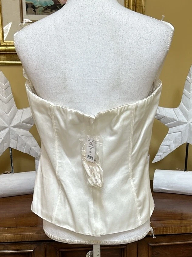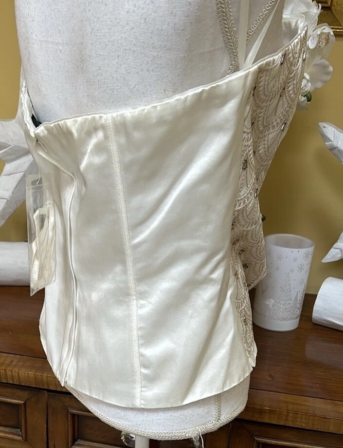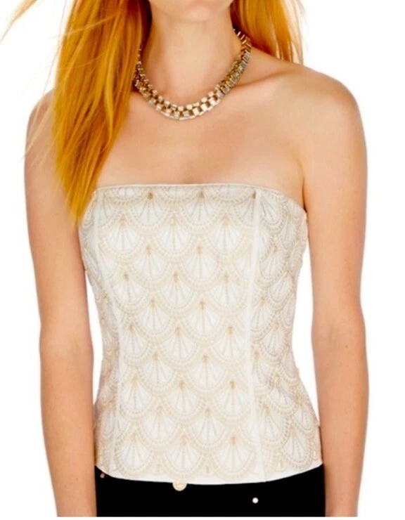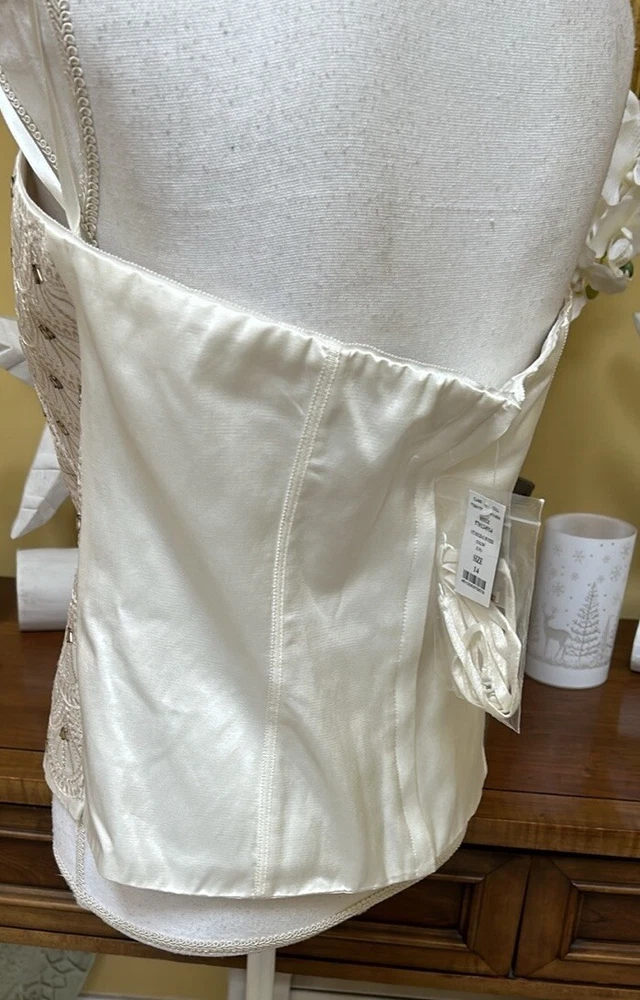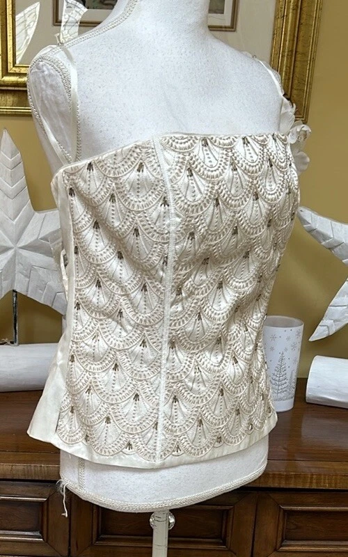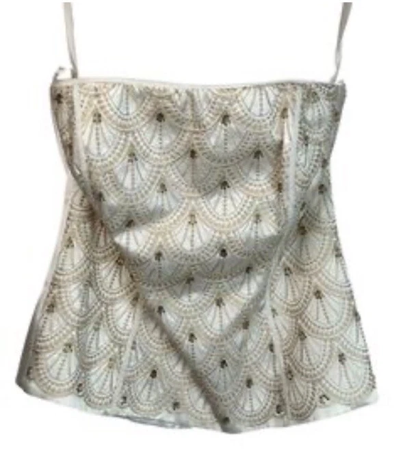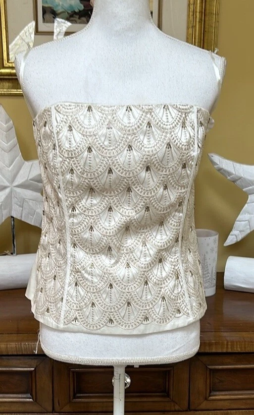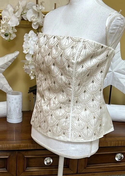 WHBM Off White Gold Embroidered Beaded Art Deco Bodice Corset Bustier NWT Sz 14 High Waisted Art Deco Gold Beaded Embroidered Scalloped Hem Side Boning Removable Straps Hidden Rear Zipper with Hook and Eye Closure Fully Lined Bag with Extra Beads And Removable Straps Provided NWT/ Excellent Condition/ Never Worn Size 14 BUST 20 inches pit to pit WAIST 17 inches LENGTH 14 inches Measurements Taken Flat Smoke Free/ Pet Free Home