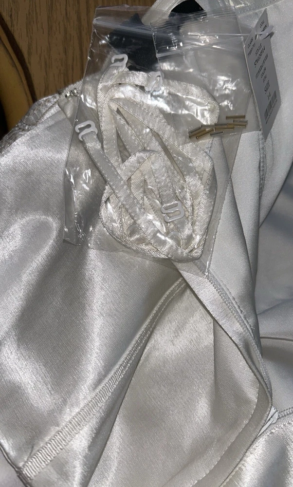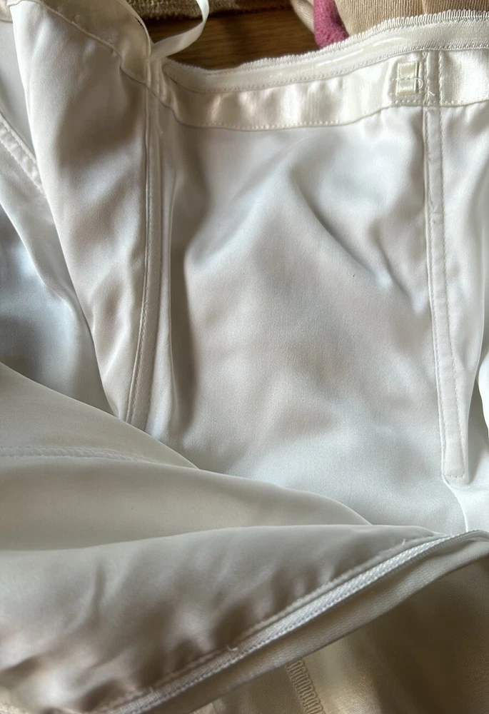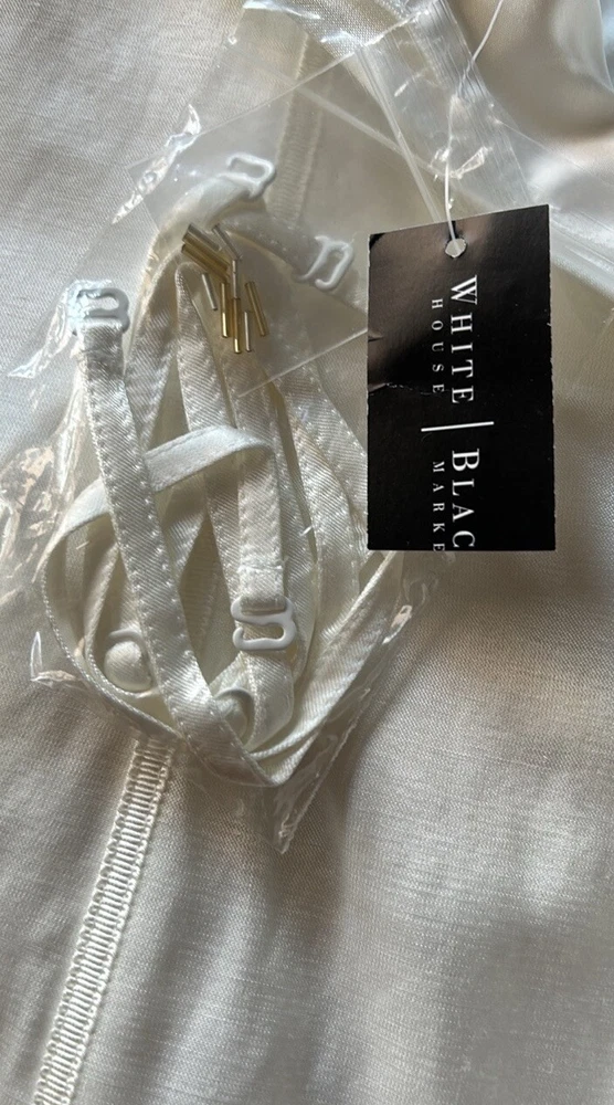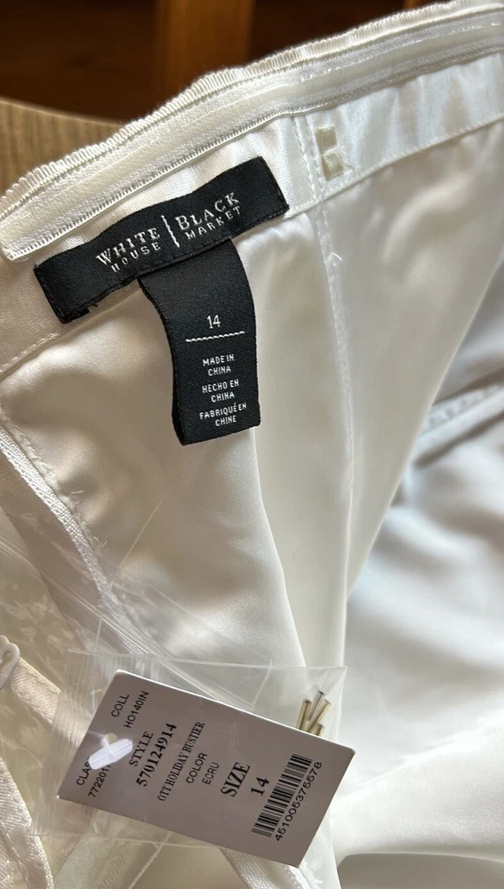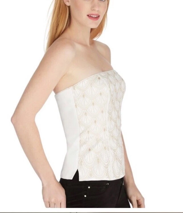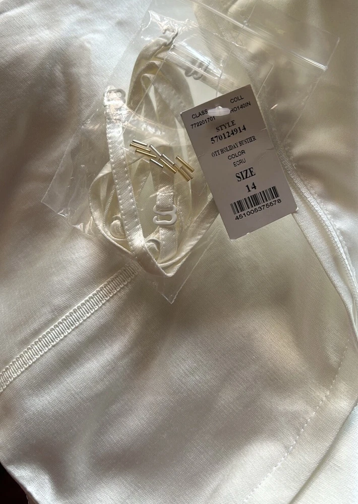 WHBM Off White Gold Embroidered Beaded Art Deco Bodice Corset Bustier NWT Sz 14 High Waisted Art Deco Gold Beaded Embroidered Scalloped Hem Side Boning Removable Straps Hidden Rear Zipper with Hook and Eye Closure Fully Lined Bag with Extra Beads And Removable Straps Provided NWT/ Excellent Condition/ Never Worn Size 14 BUST 20 inches pit to pit WAIST 17 inches LENGTH 14 inches Measurements Taken Flat Smoke Free/ Pet Free Home